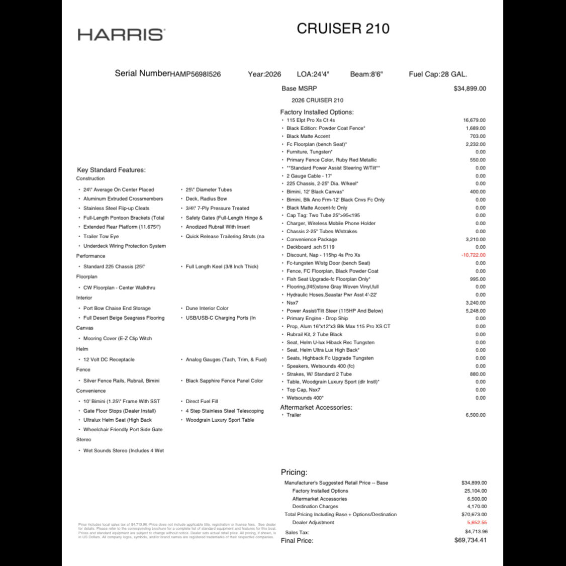This 2026 Harris Cruiser, Fish and Cruise Model comes ready to use. Equipped a 115 Pro XS Mercury, 2 hand crank cannon downriggers and a wet slip at Strawberry Bay Marina for the 2026 season.