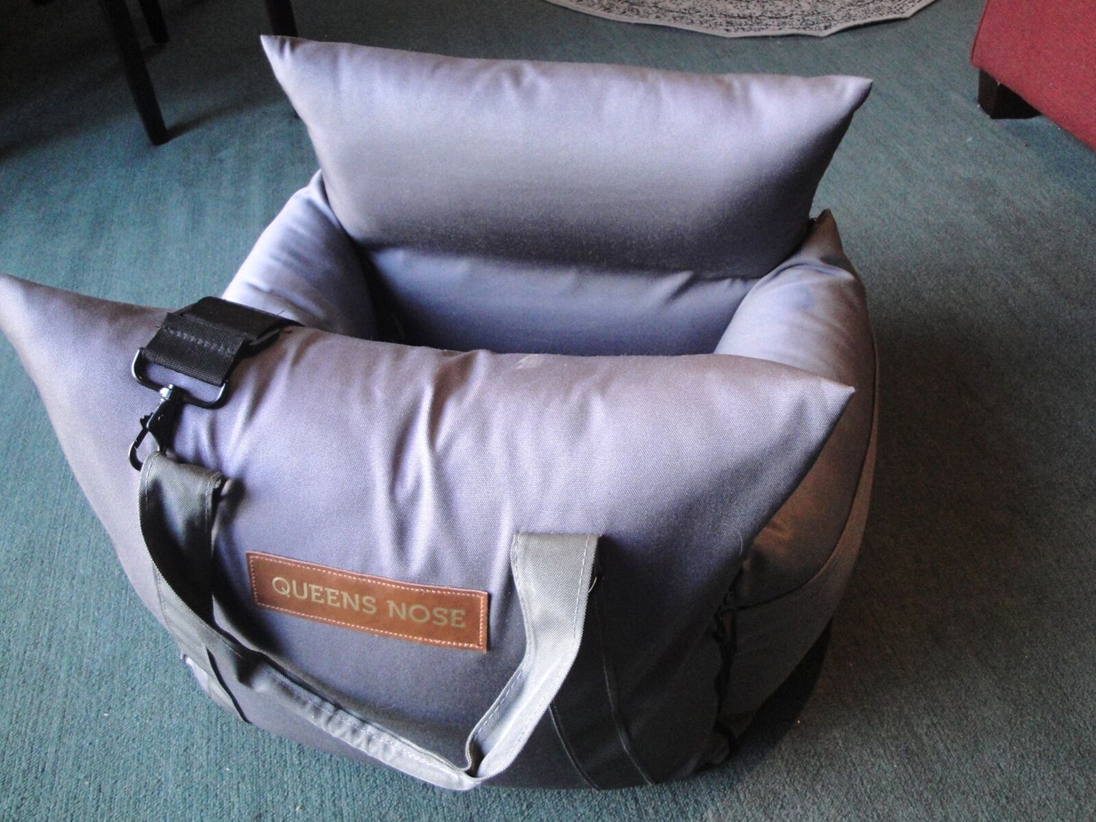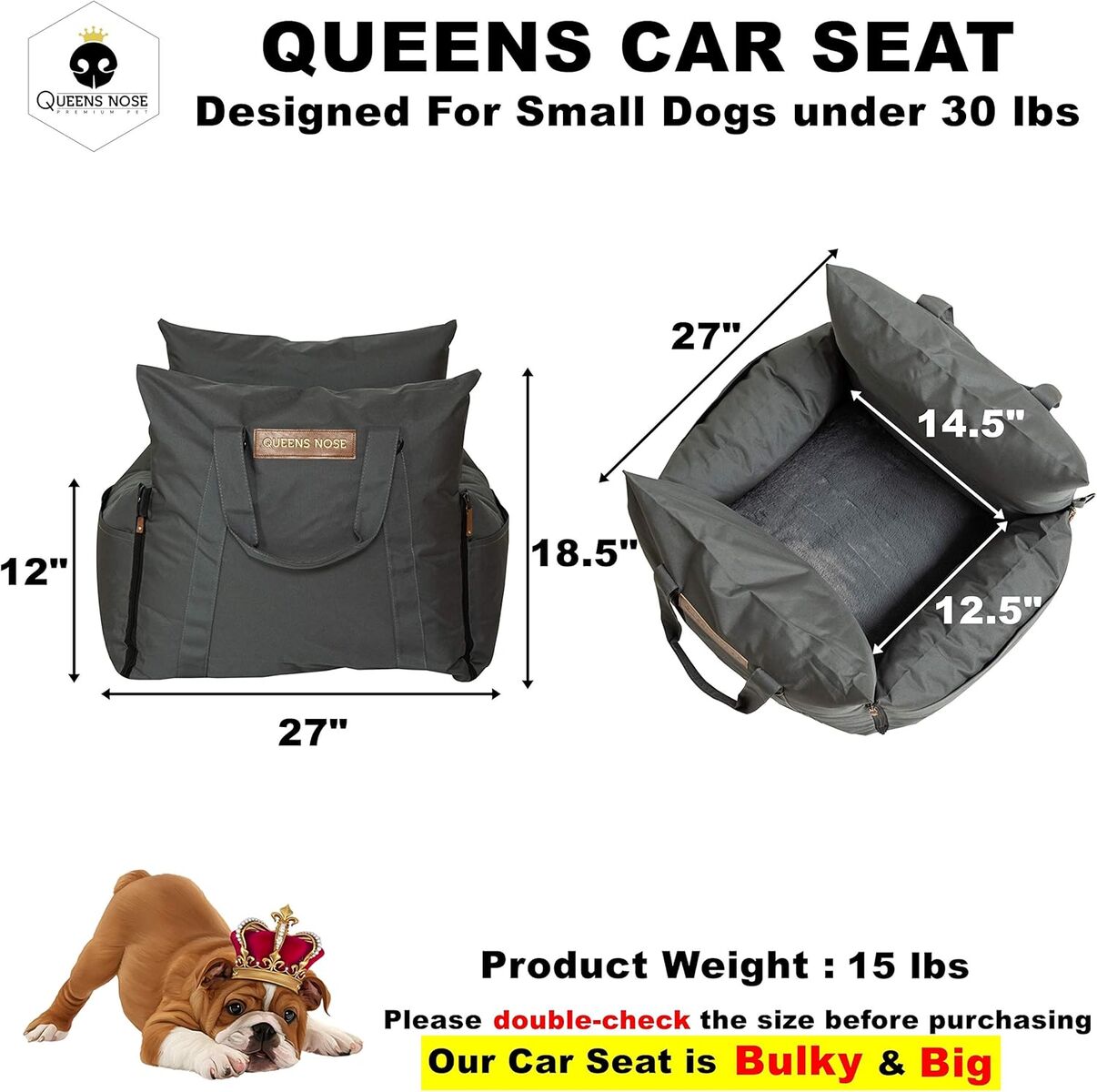 VenmoQueen's Nose dog car seats are designed for small to medium dogs up to 30 lbs, featuring front and back "airbag" cushions, dual safety leashes, and waterproof, durable fabric for safety and comfort. These portable booster seats include handles for easy transport and use 4-sided zippers for stability.