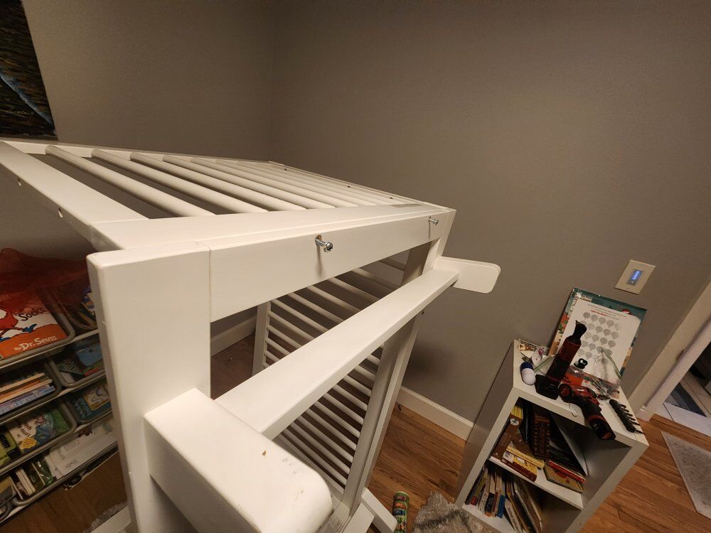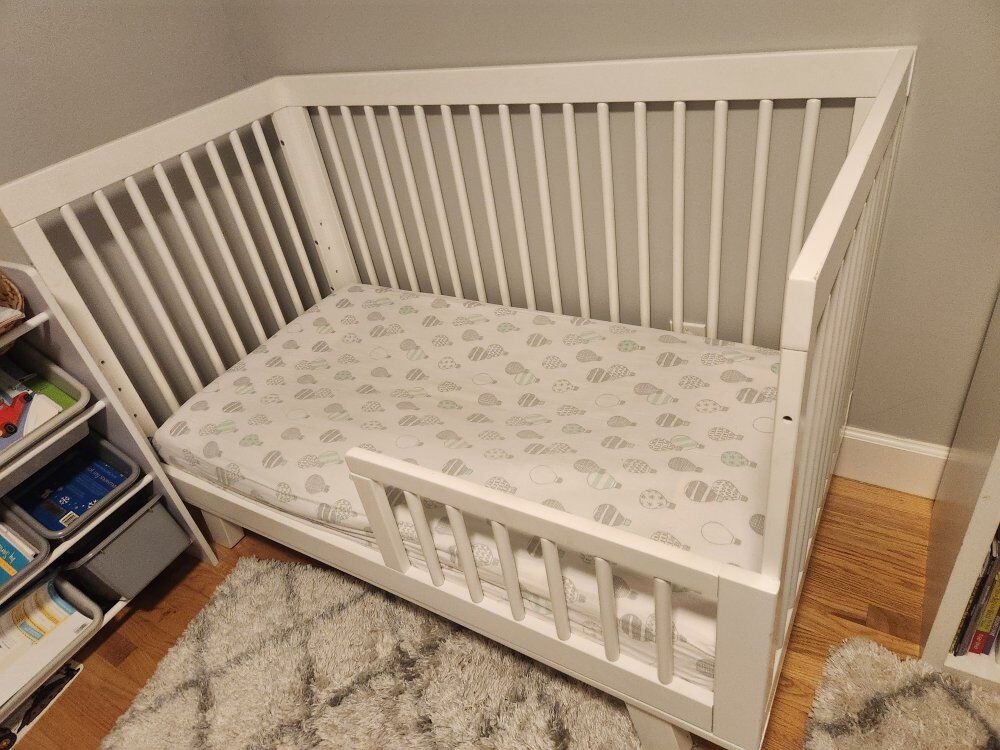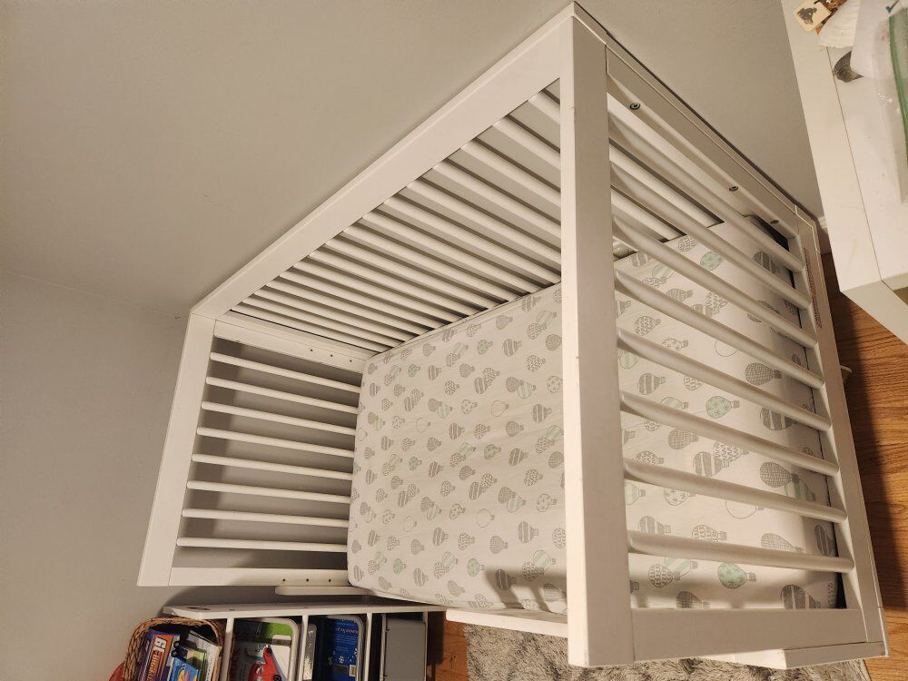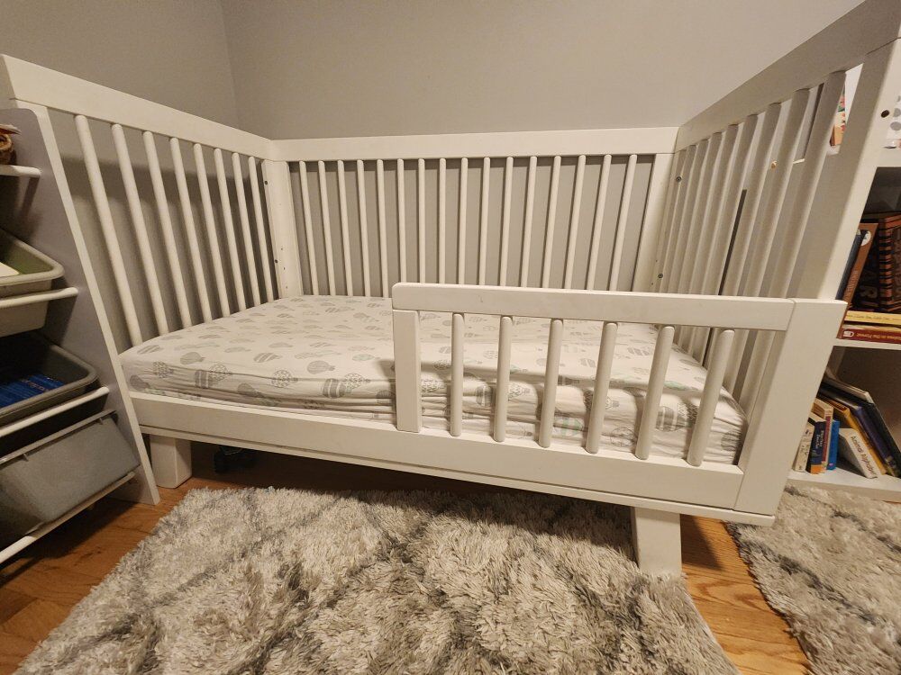 ZelleHere is a nice shape baby crib/toddler bed that I believe was purchased originally at IKEA. I have the toddler railing installed in the photos and the full crib side with railing as high as at the other sides is included.