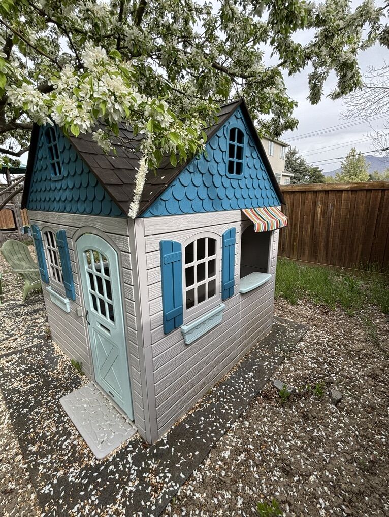 Purchased about four years ago. Kids just aged out of using it. The old stickers peeled off, but we have a new package of brand new stickers. Cash only, no Venmo or PayPal. Contact via text only. Price is final. Still in good shape, but has been outdoors so definitely could use a good spray down. Walls and roof are still solid and comes with anchors to drive into ground. Doorbell still works.