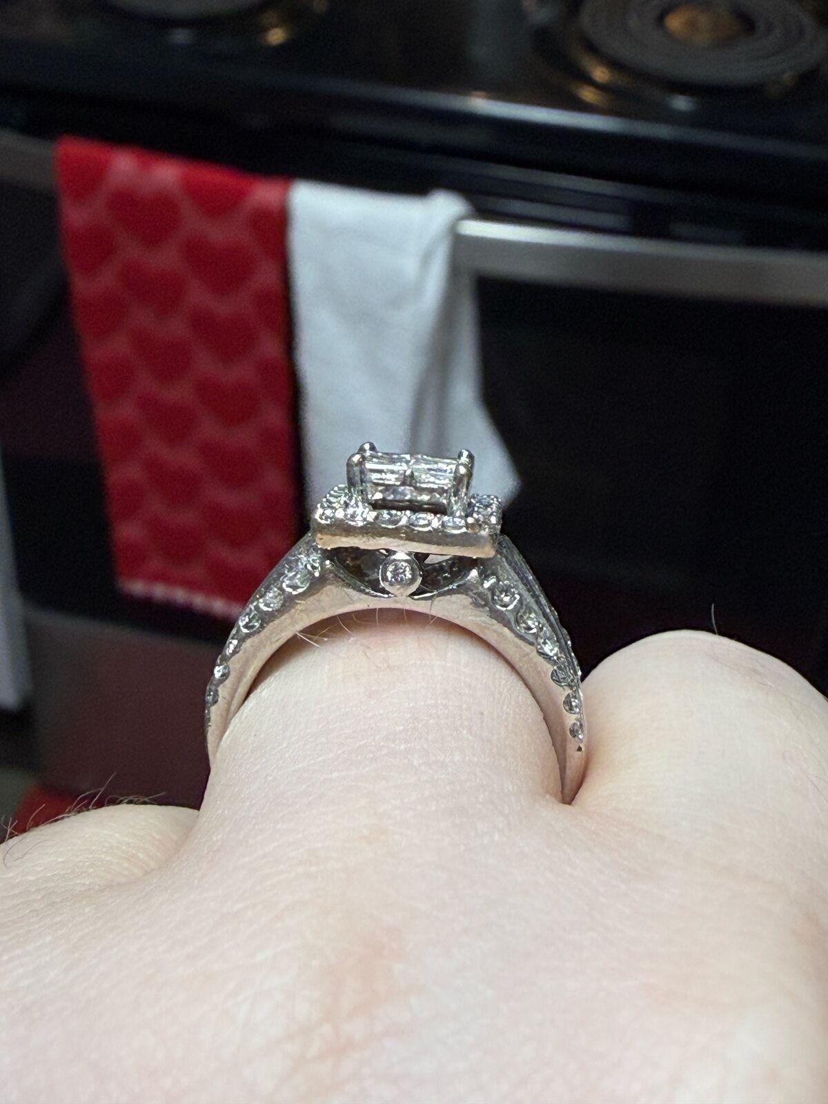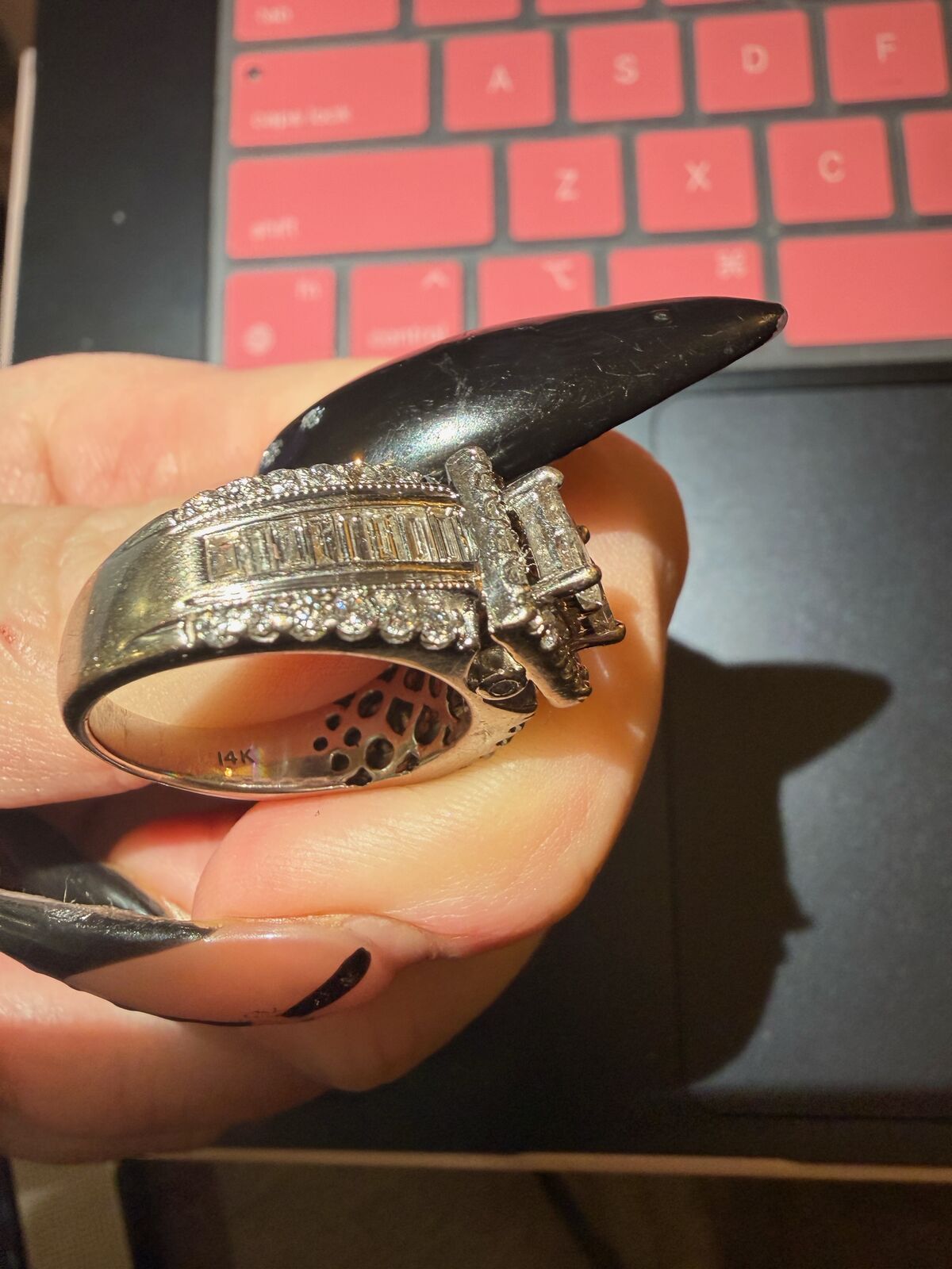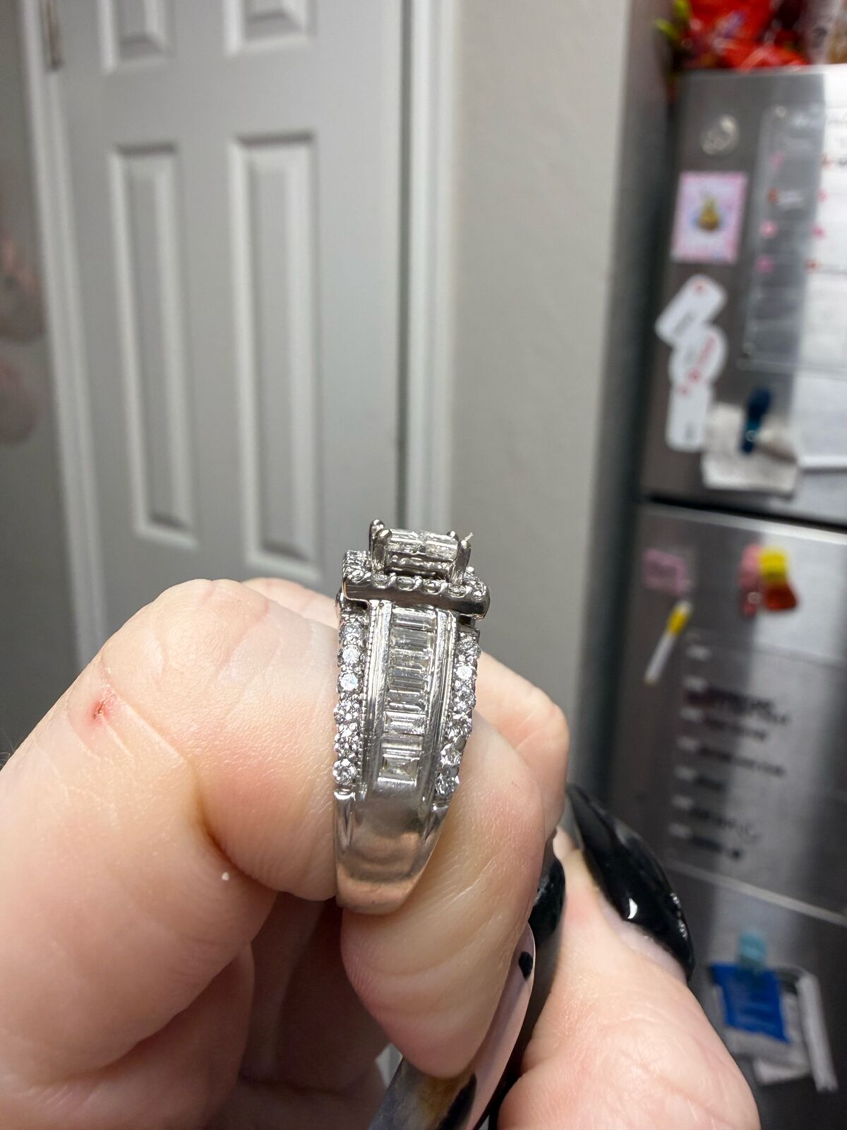 ZelleRound diamonds surround by four princess-cut diamonds. Two rows of additional round diamonds and a row of baguette diamonds accent each side. Set in 14K white gold. Inside of band has a small ruby that is supposed to represent carrying "a piece of his heart". It is a size 8.