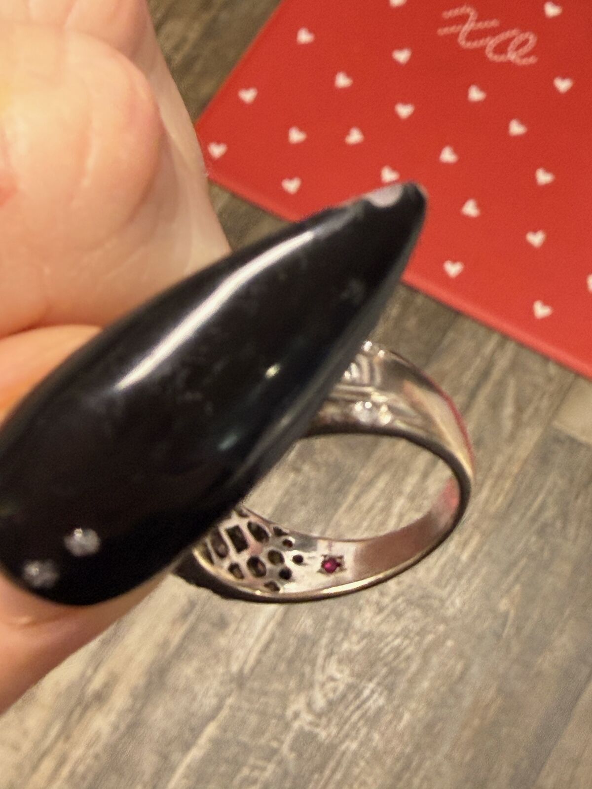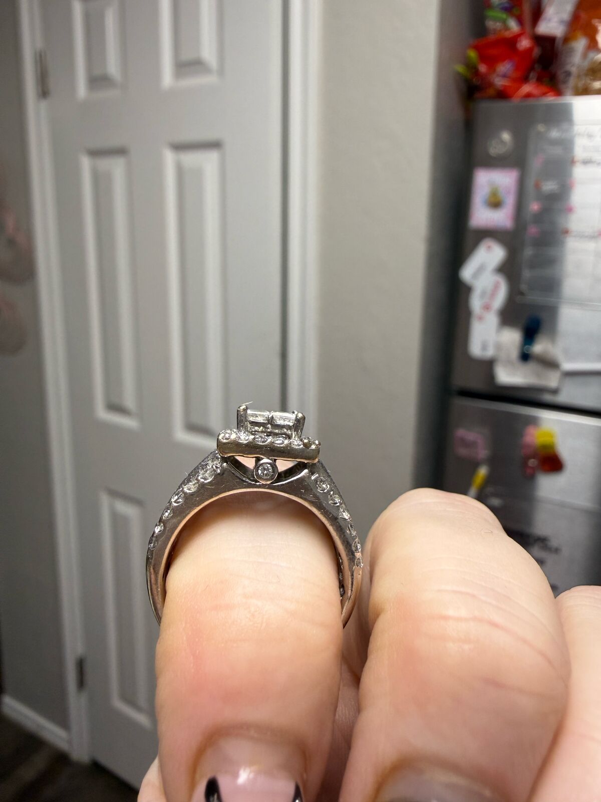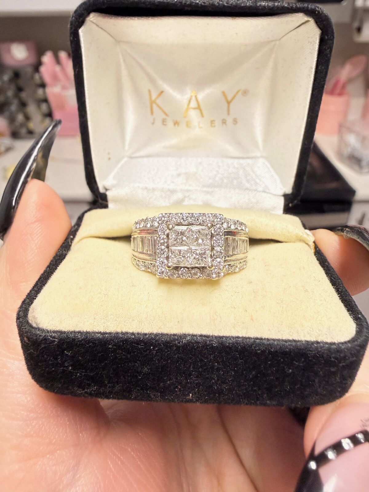 ZelleRound diamonds surround by four princess-cut diamonds. Two rows of additional round diamonds and a row of baguette diamonds accent each side. Set in 14K white gold. Inside of band has a small ruby that is supposed to represent carrying "a piece of his heart". It is a size 8.