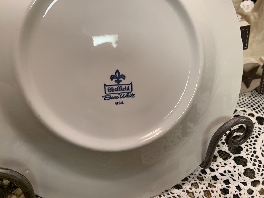 41 pieces Sheffield Bone White Vintage Porcelain china made in USA scolloped rimed. 14 (10) inch dinner plates, 6 cups and 8 (6 inch) cup saucers, 4 bread and butter (6 inch) plates, 4 salad plates (7 5/8 inch), 3 soup bowl (7X6 1/4 inch), 1 picture (7 1/2 inch), 1sugar bowl. $299.