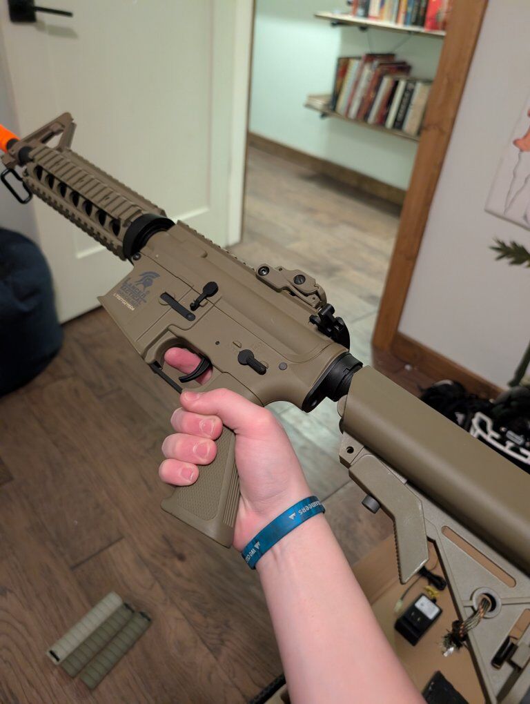 VenmoI'm not quite sure what kind of gun this is. works perfectly fine, is battery powered. the smaller one is spring loaded. I have already adjusted the scope for the rifle. three mags that work fine, a speed loader, two charges, a strap, some goggles, gloves, and more.
