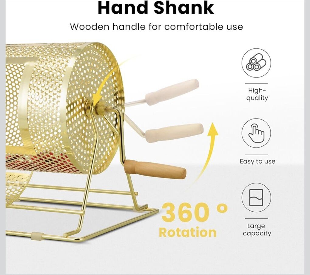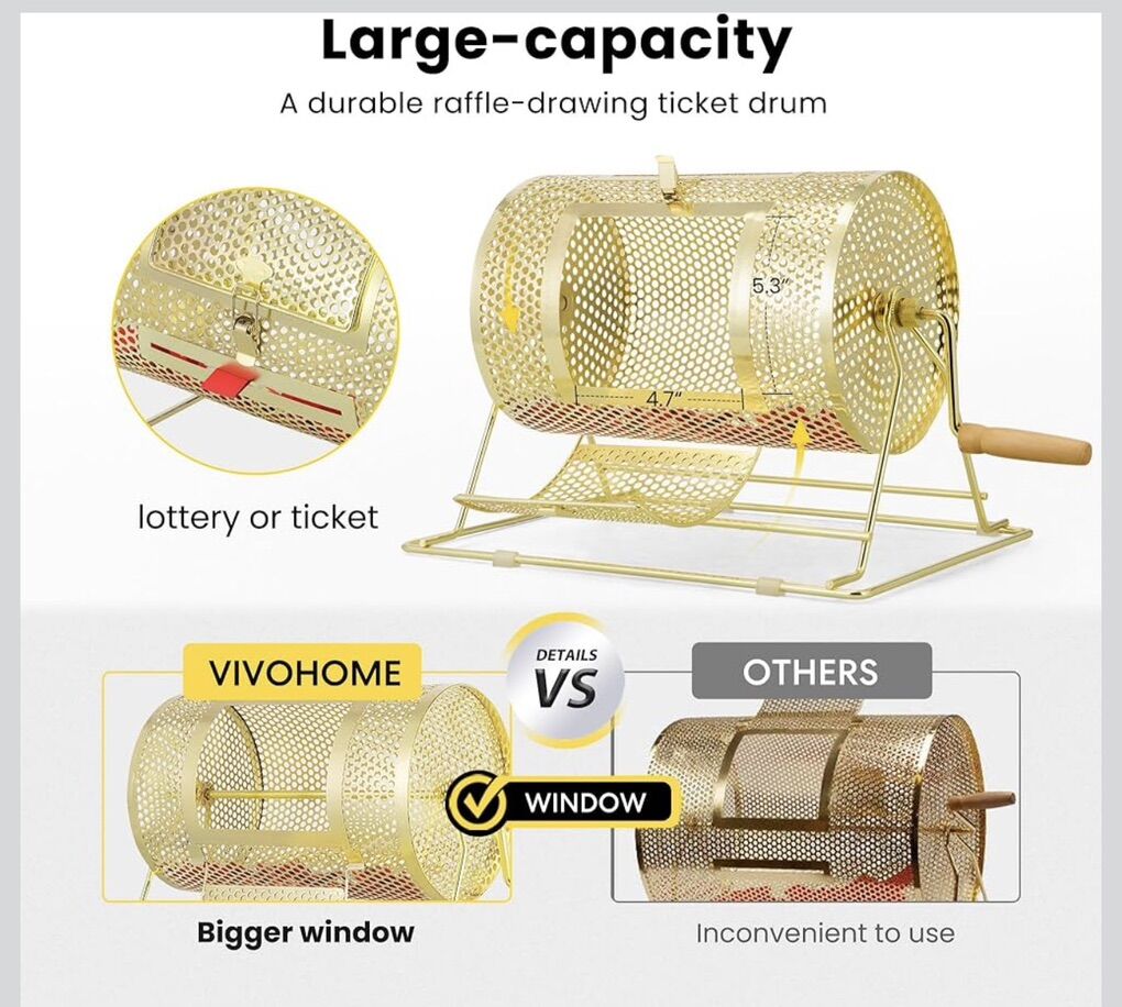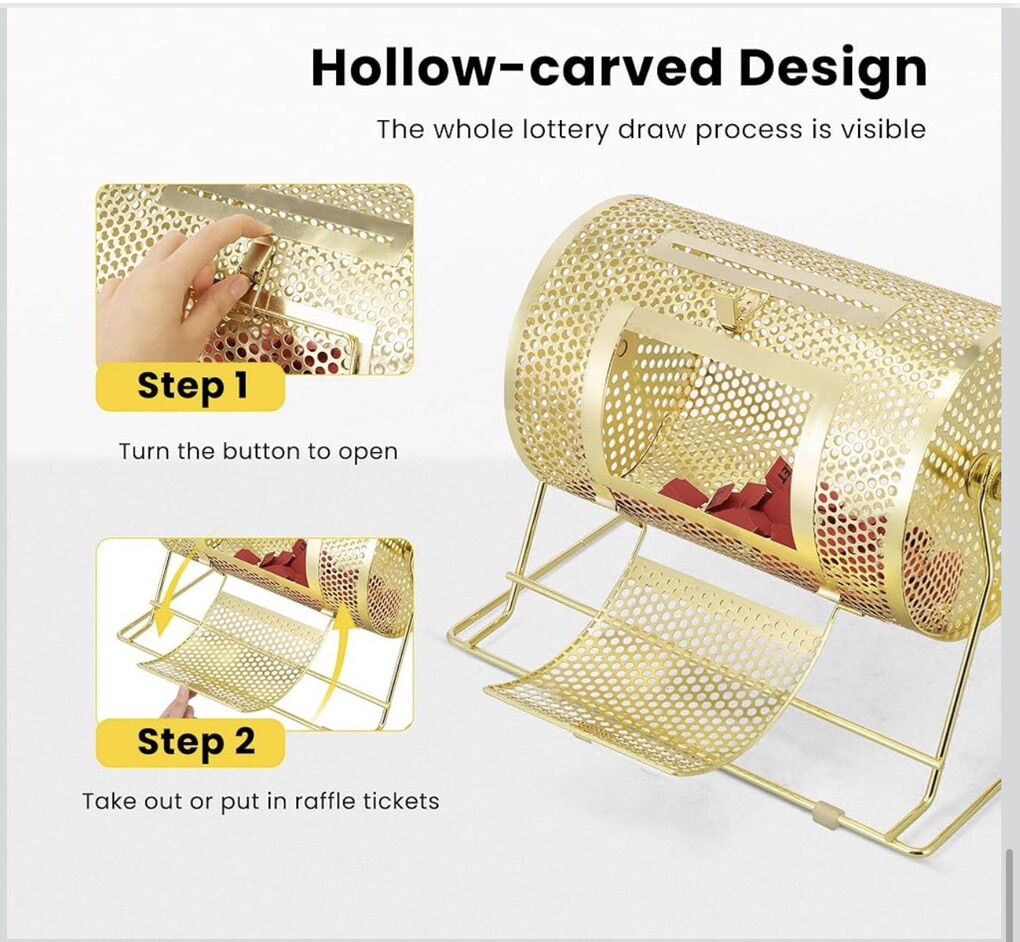 DURABLE AND STABLE STEEL DRUM - This is a durable raffle-drawing ticket drum made of good quality metal with a layer of bronze that ensures a long service life; Its reinforced legs and rectangle base provide this raffle drum with better stability • GREAT CAPACITY - With overall dimension (Without Handle) of 14.8(L) × 10.6(W) x 11.2(H), the lottery drum body can be filled with up to 2500 small-size raffle tickets or 80 ping pong balls; Tickets are not included in the package • COMFORTABLE USE - A firm latch and a stable body keep the contents secure within the body while spinning; We've added a comfortable-to-hold wooden handle to make sure it's easy to spin and maneuver; It is also lightweight and easy to transport • GUARANTEED RANDOMNESS AND FAIRNESS- This professional raffle ticket drum guarantees random results each time you use it; Its hollow-carved design achieves fairness and openness, as the whole lottery draw process is visible, giving a sense of surprise when every result comes out • WIDE APPLICATIONS - The gold appearance will be absolutely eye-catching in your gathering with lots of people; It's ideal for the lottery, casino, bingo, ballot, social, corporate party, trade show, fundraiser, and so on