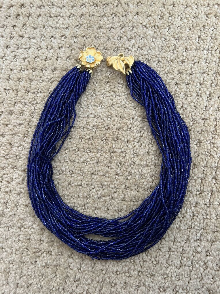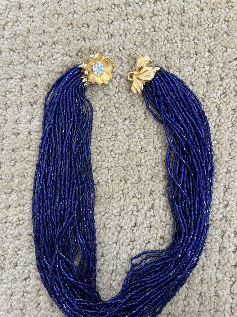 VenmoThis is just gorgeous! The beads are many different colors of blues. There are two clusters in gold, of 18 strands of beads on each side. So each side has 36 strands of beads on them. The clasp is quite unusual and beautiful. It is a gold flower with light blue rhinestones in it. This is a must see piece in excellent condition. Selling to help a parent. Price is firm.