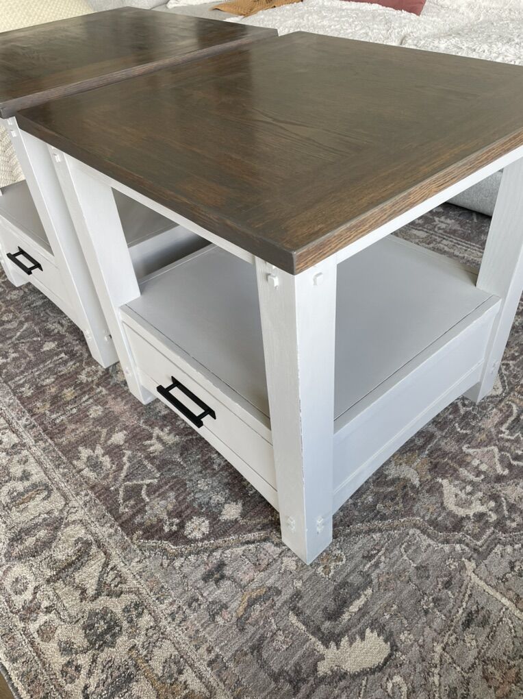 Pair of matching accent tables or nightstands Has a drawer with dovetail joints Black modern farmhouse hardware Stained a warm brown/gray & painted requisite gray Solid and sturdy Minor imperfections due to use $365 in Tooele