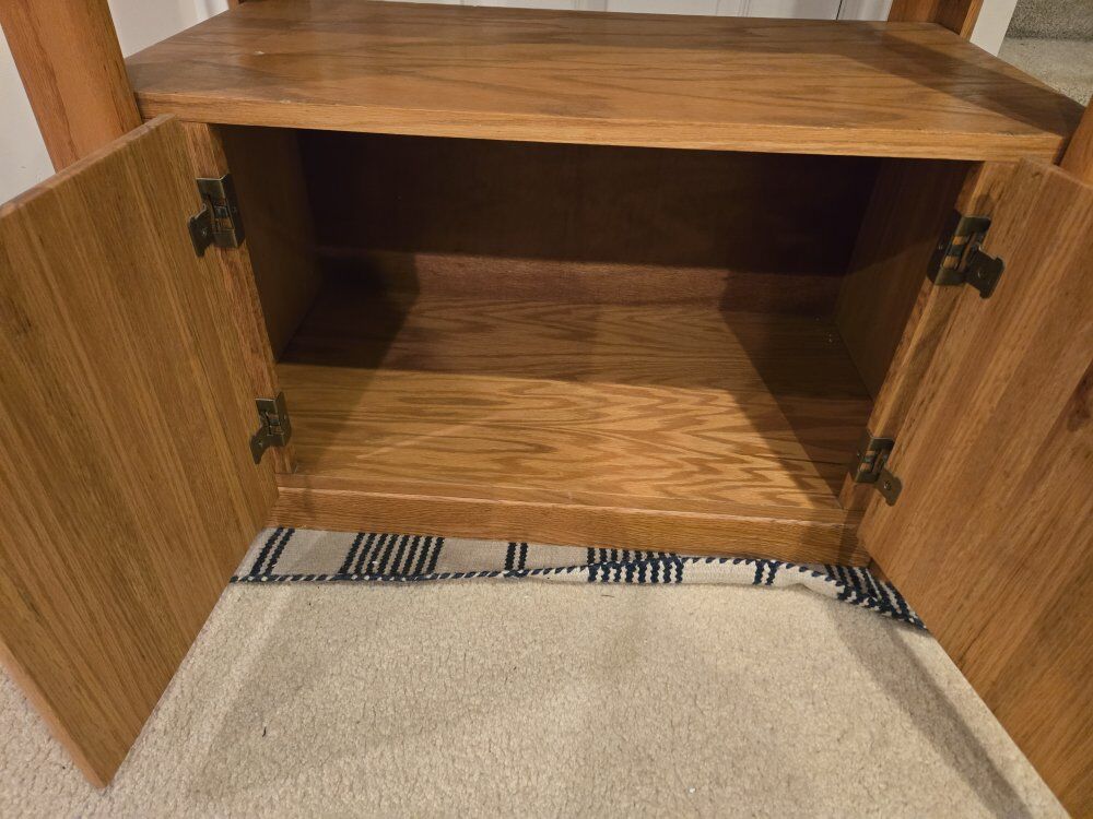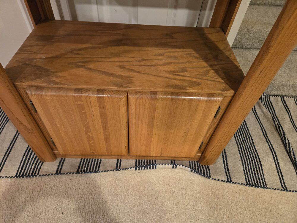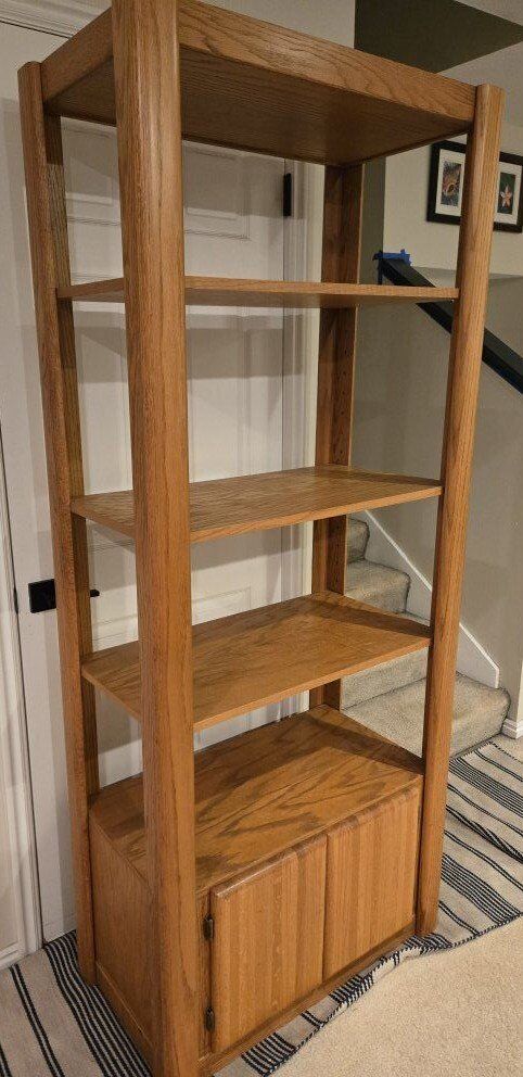 VenmoSolid wood shelving unit with 3 adjustable shelves. Shelf is 76 inches tall and 32 inches wide and 17.5 deep. Dual doors on bottom with cabinet. Good condition.