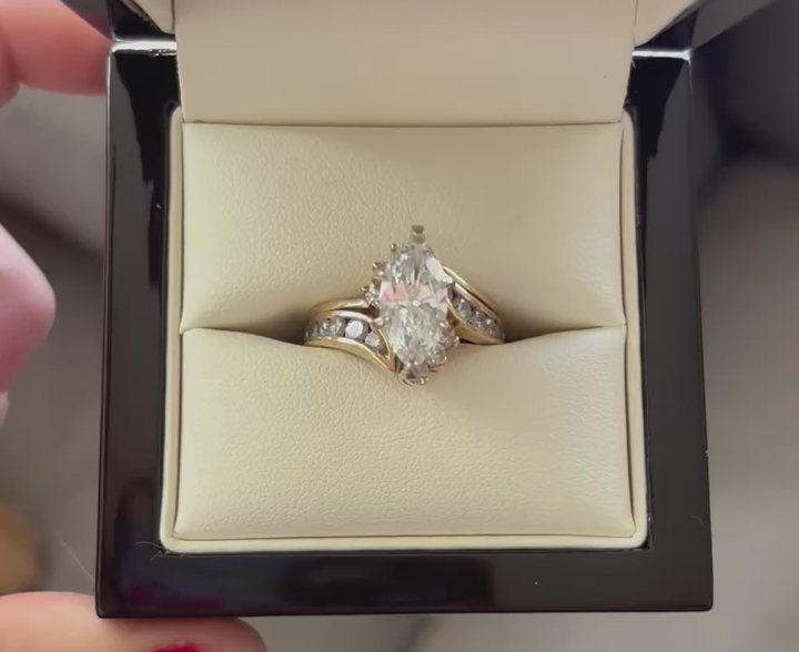 This is a beautiful and timeless marquise style engagement ring. It’s 1.76ct F color/VVS2 clarity lab grown diamond. It is set in a 14kt yellow gold channel set with 16 round diamonds (.70 cttw). It appraises for $6,650. Im not sure the size of the ring. My best guess is about a 6. This ring was inherited from my grandma. We decided to custom design a ring so we don’t have a need for this one. It’s in near perfect condition. It’s never been worn, she bought for inheritance purposes. Cash only purchases Shoot me an offer! See Less