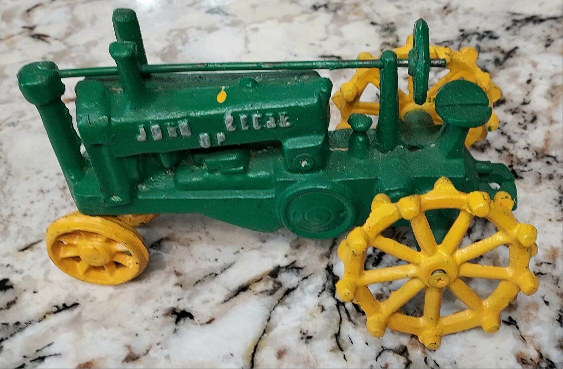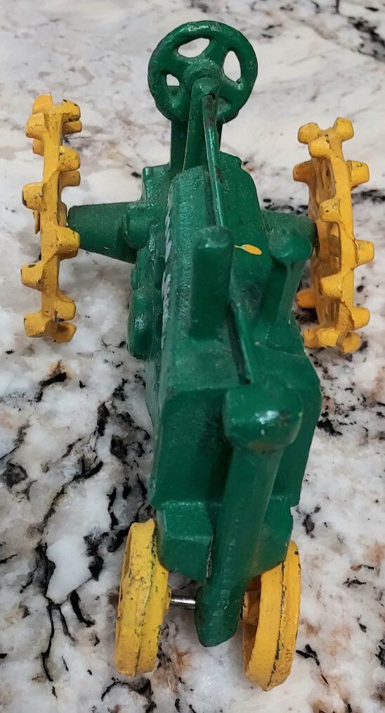 John Deere cast toy tractor. I think it is a Reproduction probably from the 70's. It measures 8" long and is in good overall condition, it does have a spot of paint on top, not sure if someone has repainted the wheels or if it was from the factory. Please text or message me with any questions, thanks