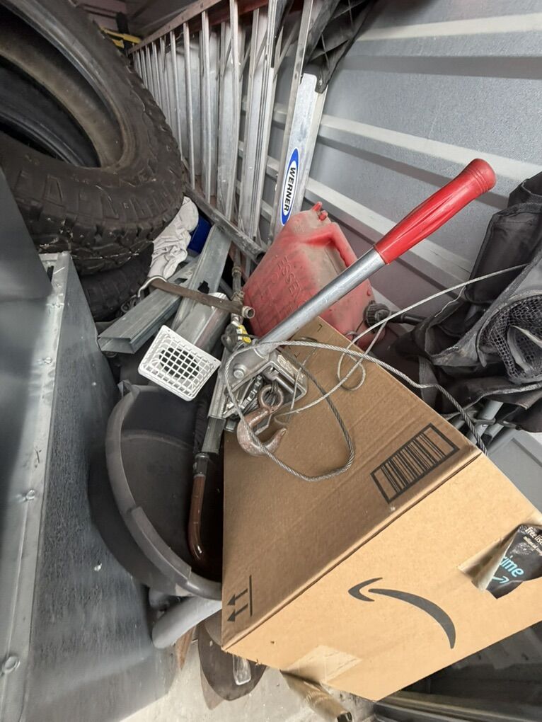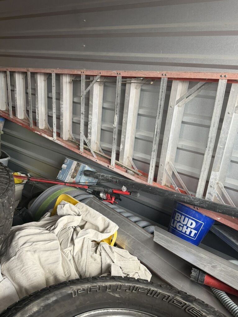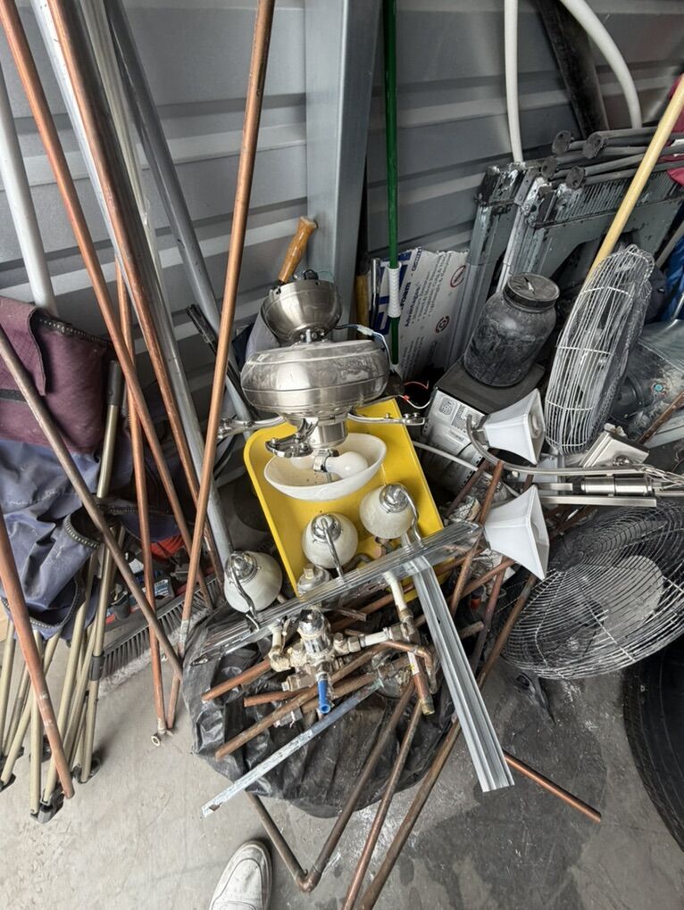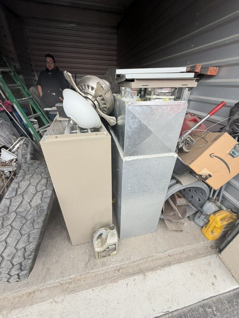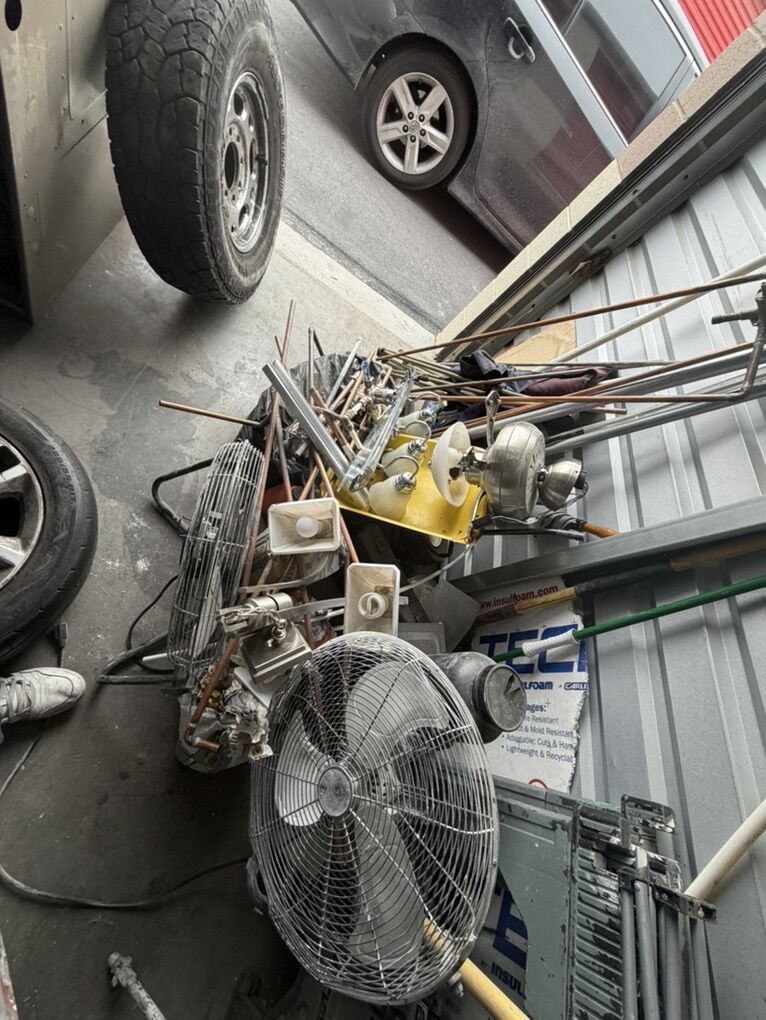 Items include: • Ladders and work equipment • Power tools and hand tools • plumbing parts • HVAC ducting and components • Tires and rims (various sizes) • Extension cords and electrical supplies • Shop fans and lighting fixtures • Hardware, fittings, and scrap metal • Storage bins and miscellaneous job-site materials