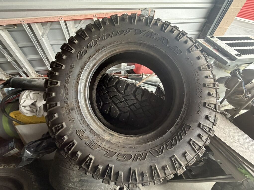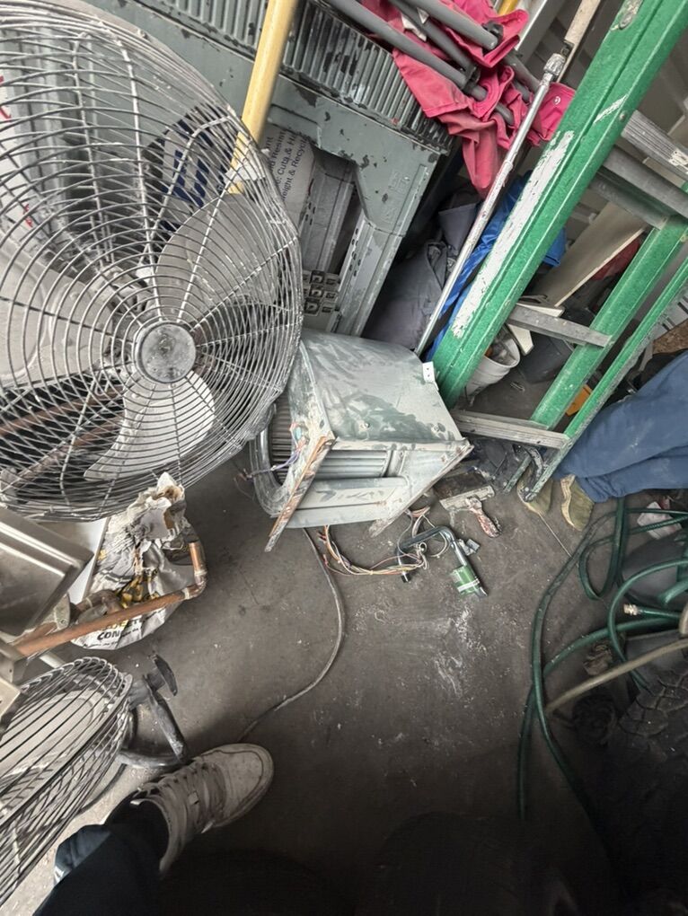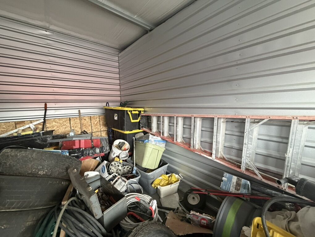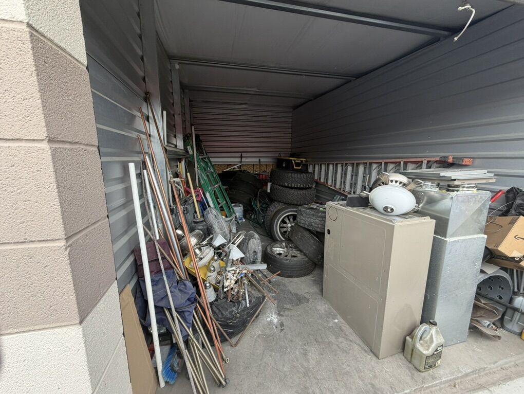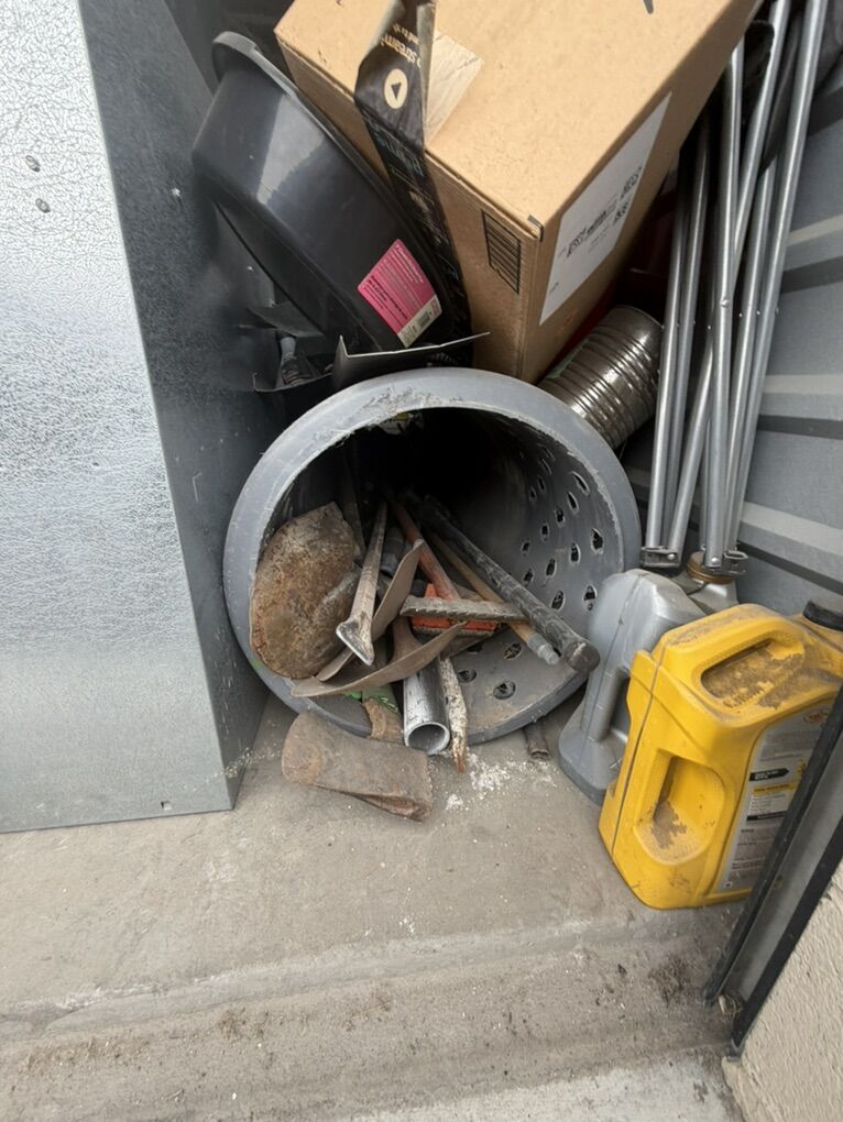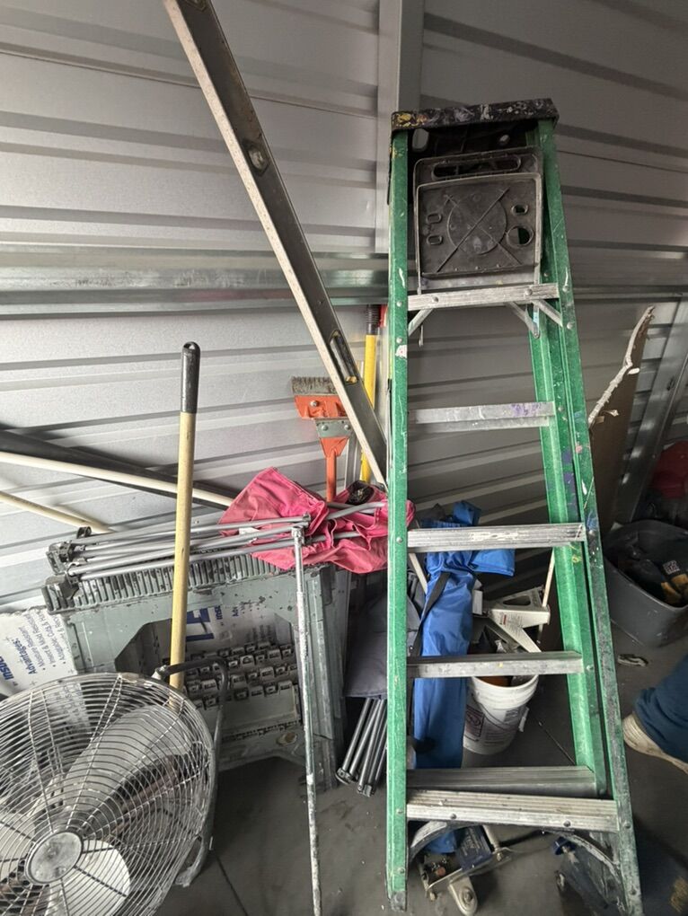 Items include: • Ladders and work equipment • Power tools and hand tools • plumbing parts • HVAC ducting and components • Tires and rims (various sizes) • Extension cords and electrical supplies • Shop fans and lighting fixtures • Hardware, fittings, and scrap metal • Storage bins and miscellaneous job-site materials