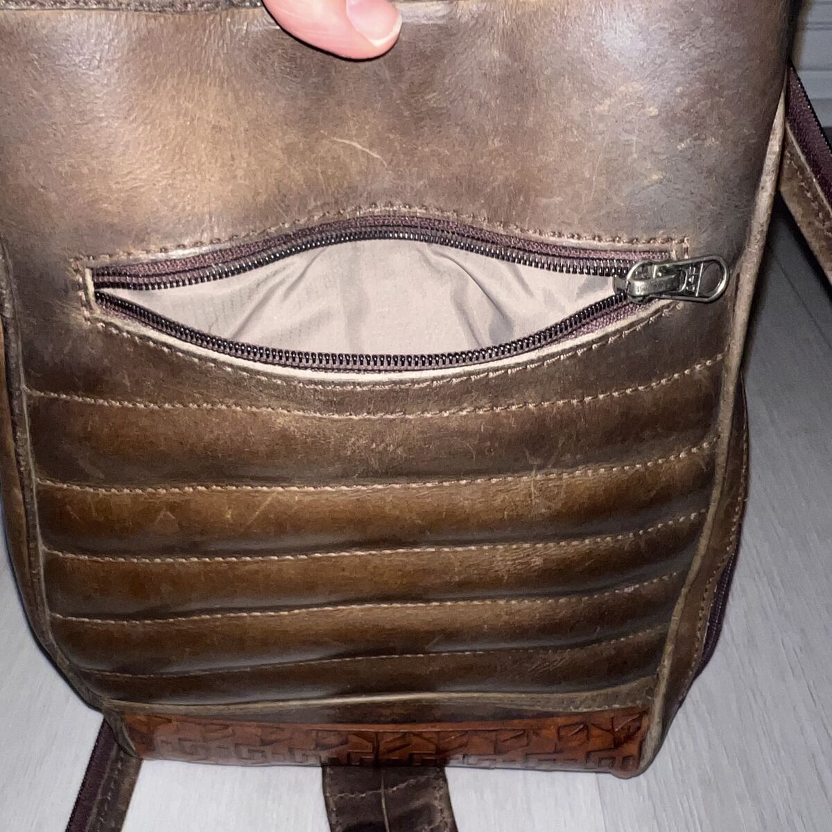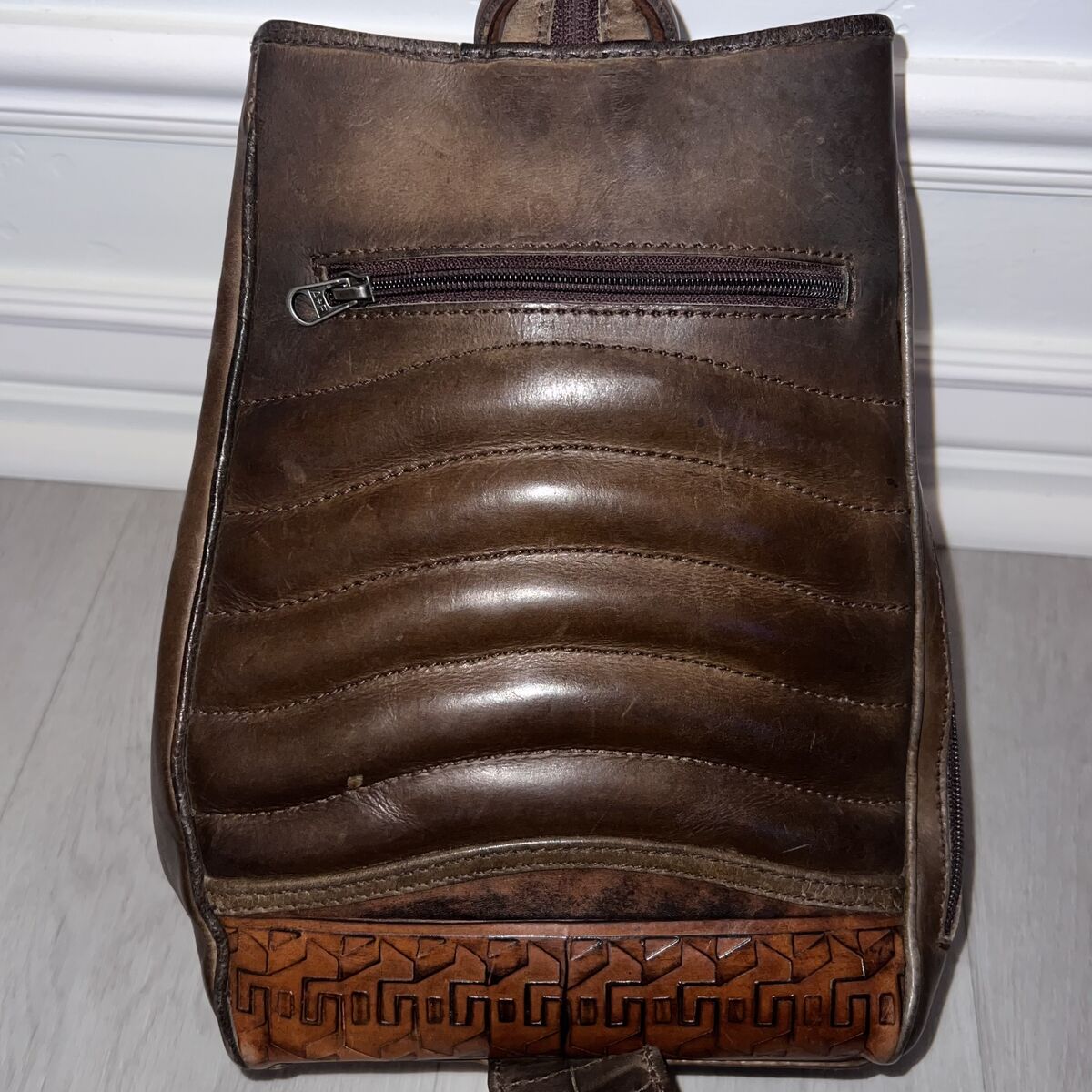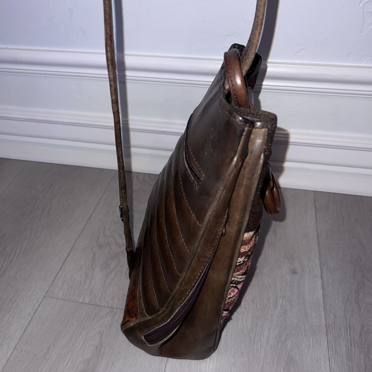 This rare vintage Anna Cainzo bag features beautifully artisan-tooled genuine leather paired with woven wool, a signature combination known for its rustic, bohemian character and handcrafted quality.