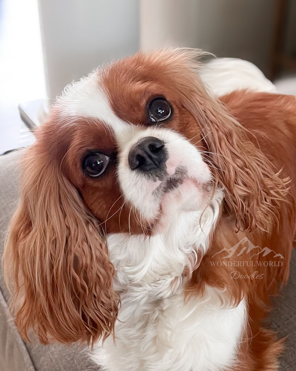 Rigby is a 13 lbs proven stud of large litters and comes from the most incredible pedigree of long lines of Champions. His Dad’s side has 9 Champions! Including his Grandpa who was a world Champion! Some are Belarus, Russia and Serbia Champions. His Mom’s side has 4 Champions & have Sheeba lines (a super well known and sought after line of Cavaliers). To become a Champion they look for things like best structure, coat texture, eye placement, ear placement, teeth, temperament, etc.
