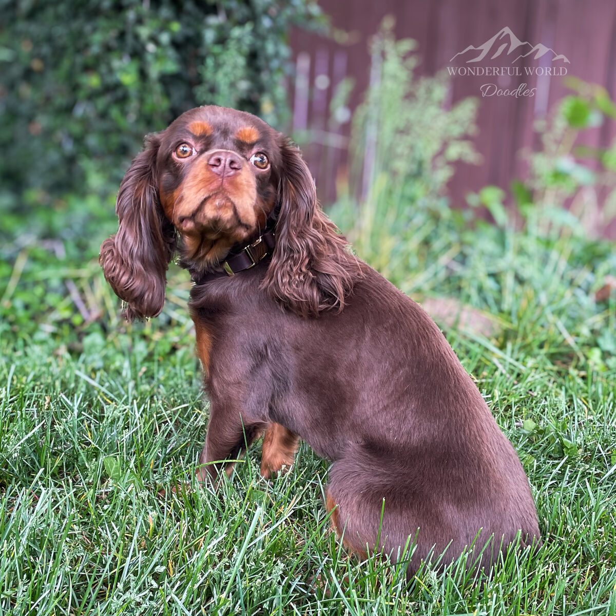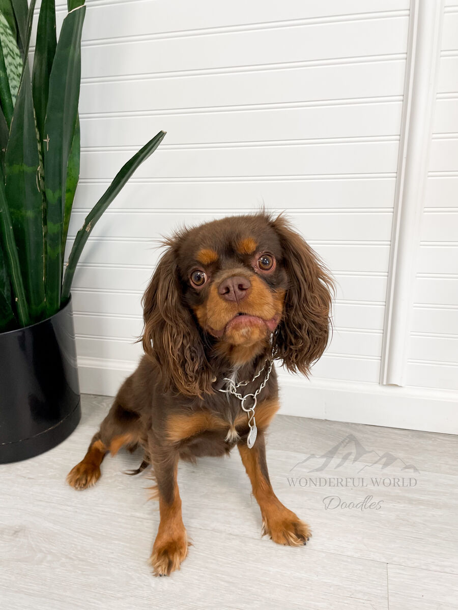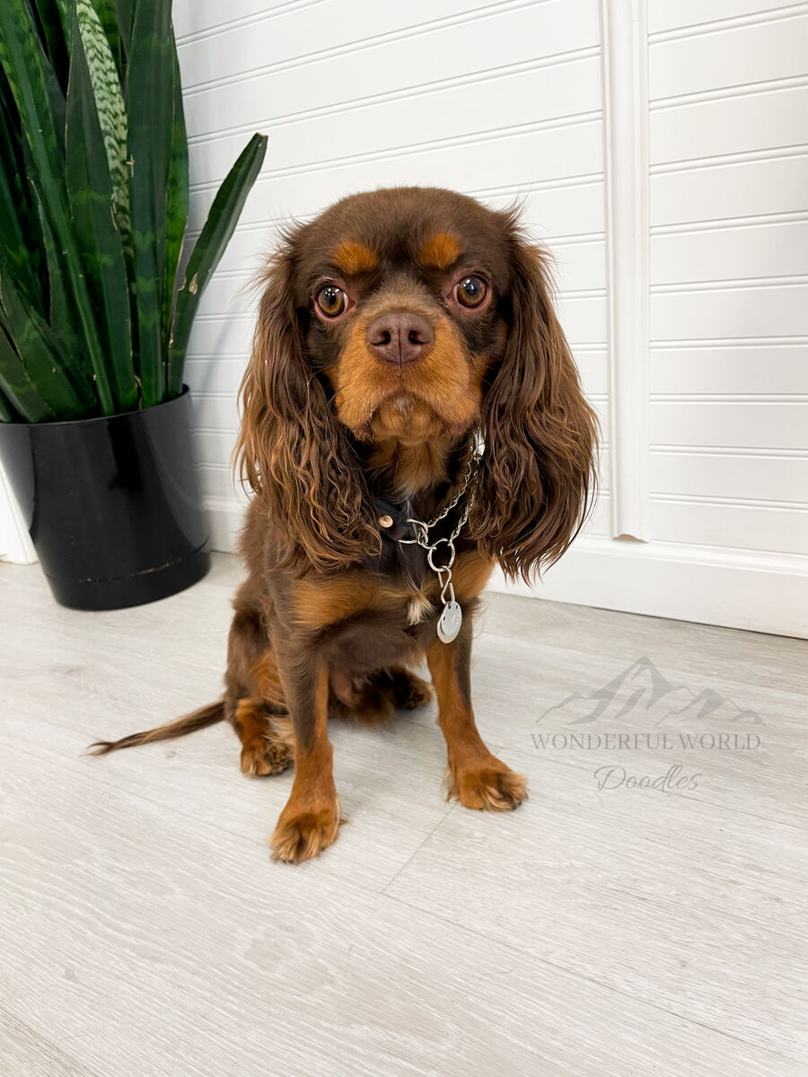 Archie is 15.5 lbs and is a super rare Chocolate AKC Cavalier!!! He is proven with several litters. He is such a lover and is just the sweetest most gorgeous dog. He has a nice wide face with a short nose that everyone loves. Archie is small for a Cavalier and so adorable in person. He is very human focused and mellow.