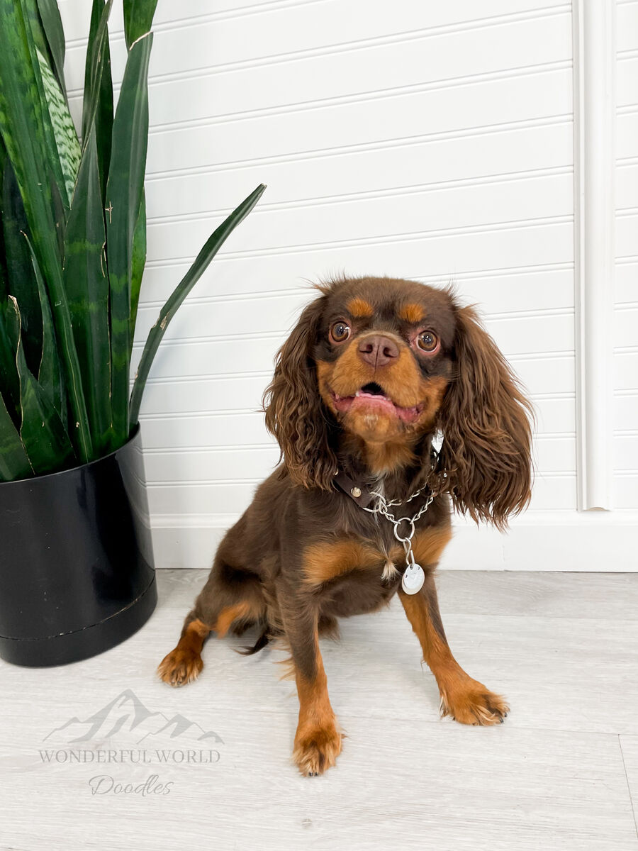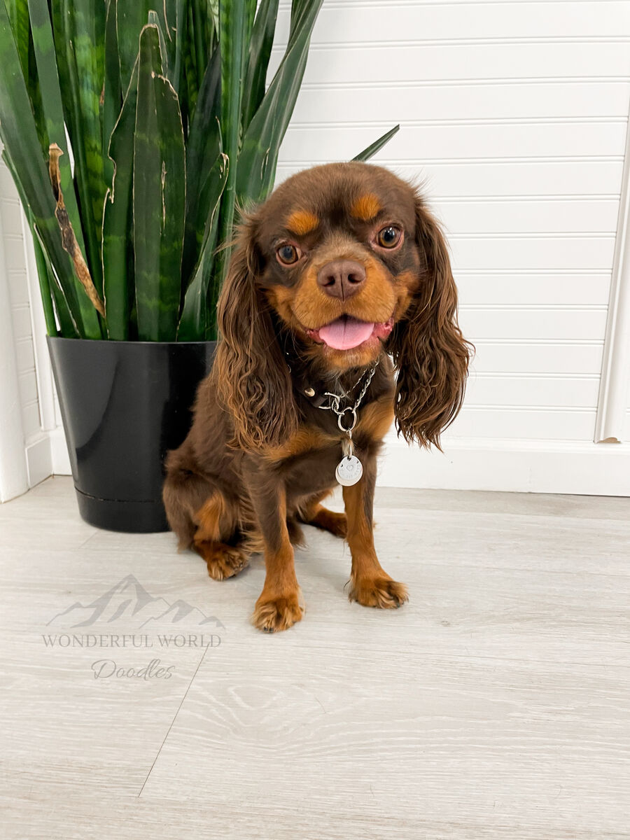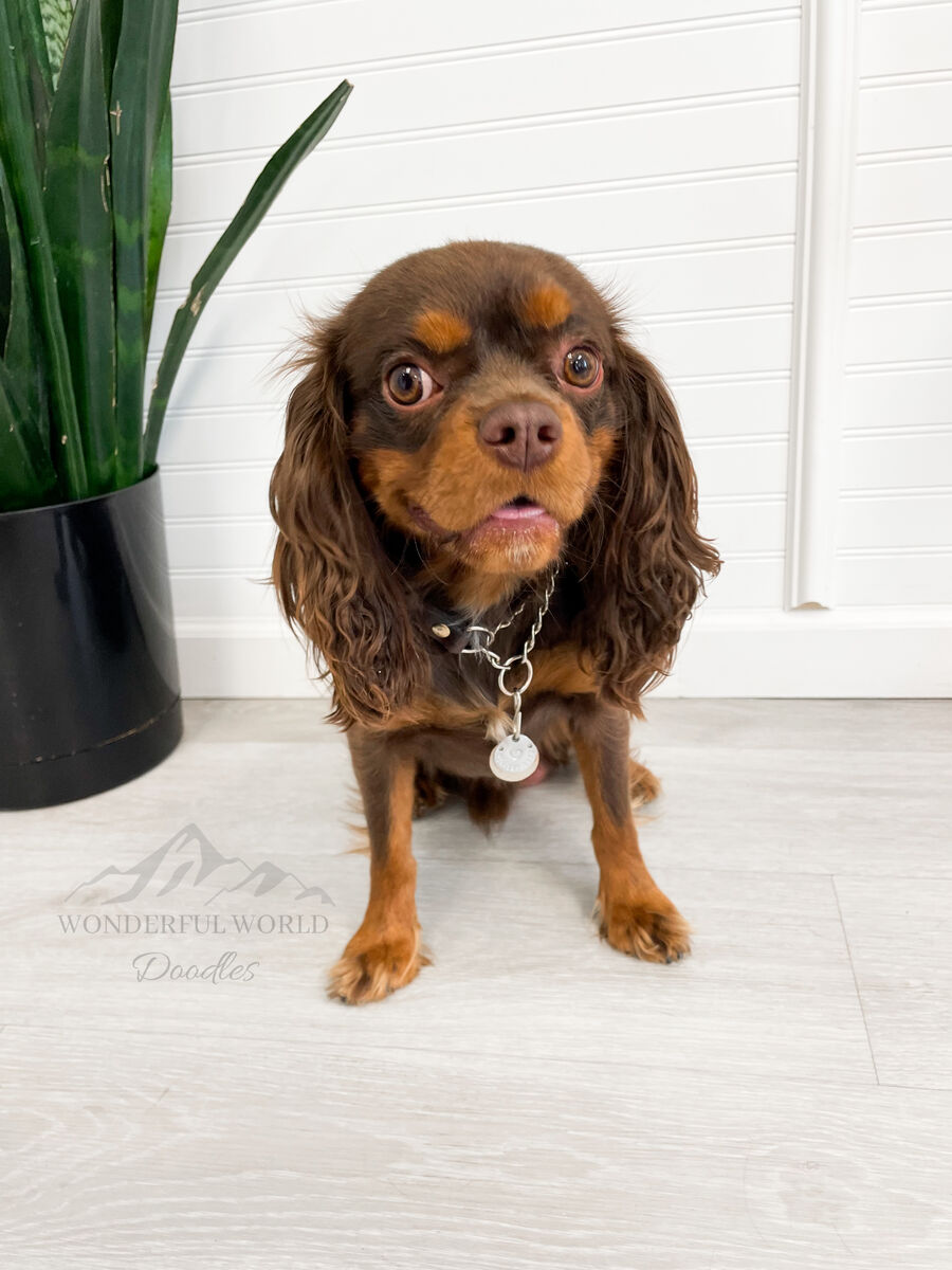 Archie is 15.5 lbs and is a super rare Chocolate AKC Cavalier!!! He is proven with several litters. He is such a lover and is just the sweetest most gorgeous dog. He has a nice wide face with a short nose that everyone loves. Archie is small for a Cavalier and so adorable in person. He is very human focused and mellow.
