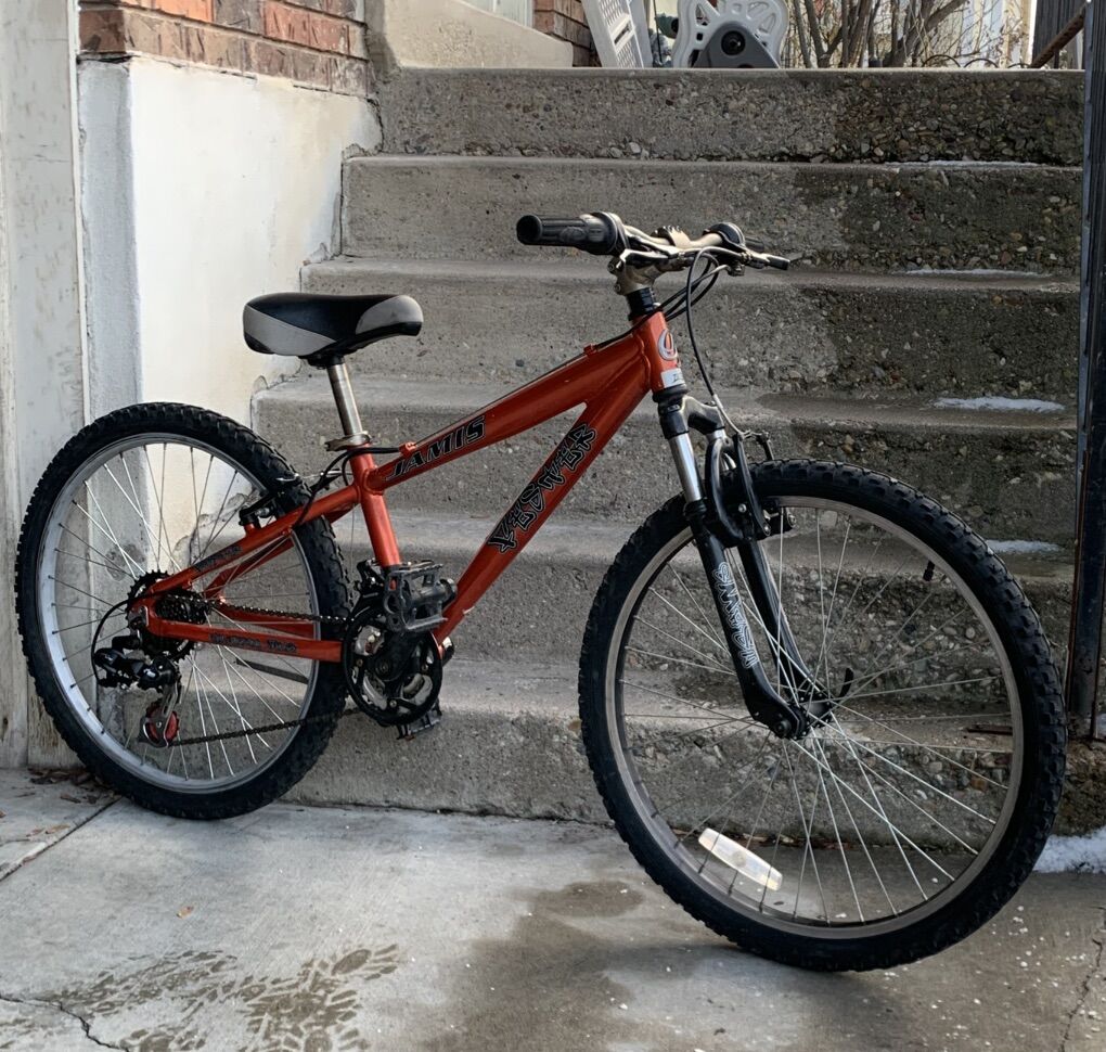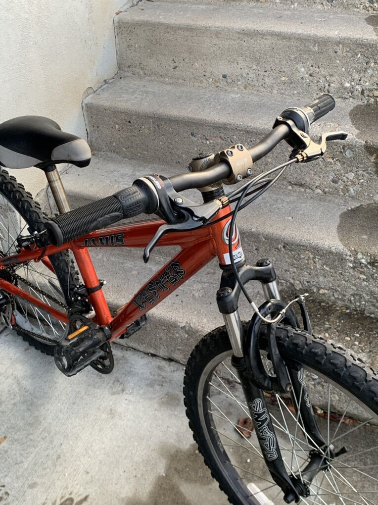 ZelleJamis Fester Youth Bike 14spd (2x7) Shimano gears Shimano twist shifters Aluminum frame Aluminum wheels Front suspension 24” x 2” terrain tires Kickstand