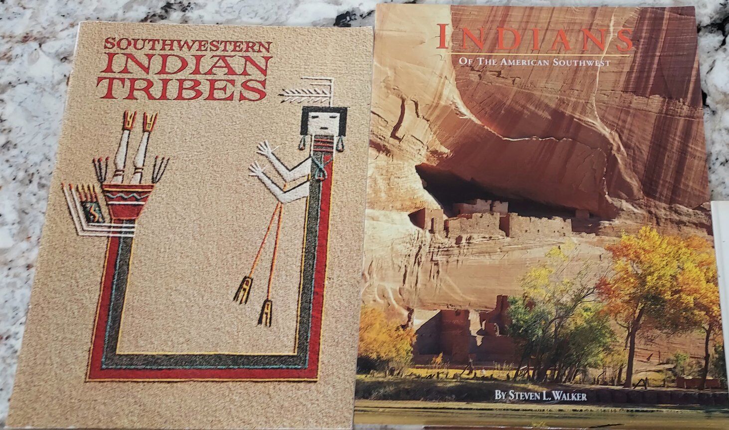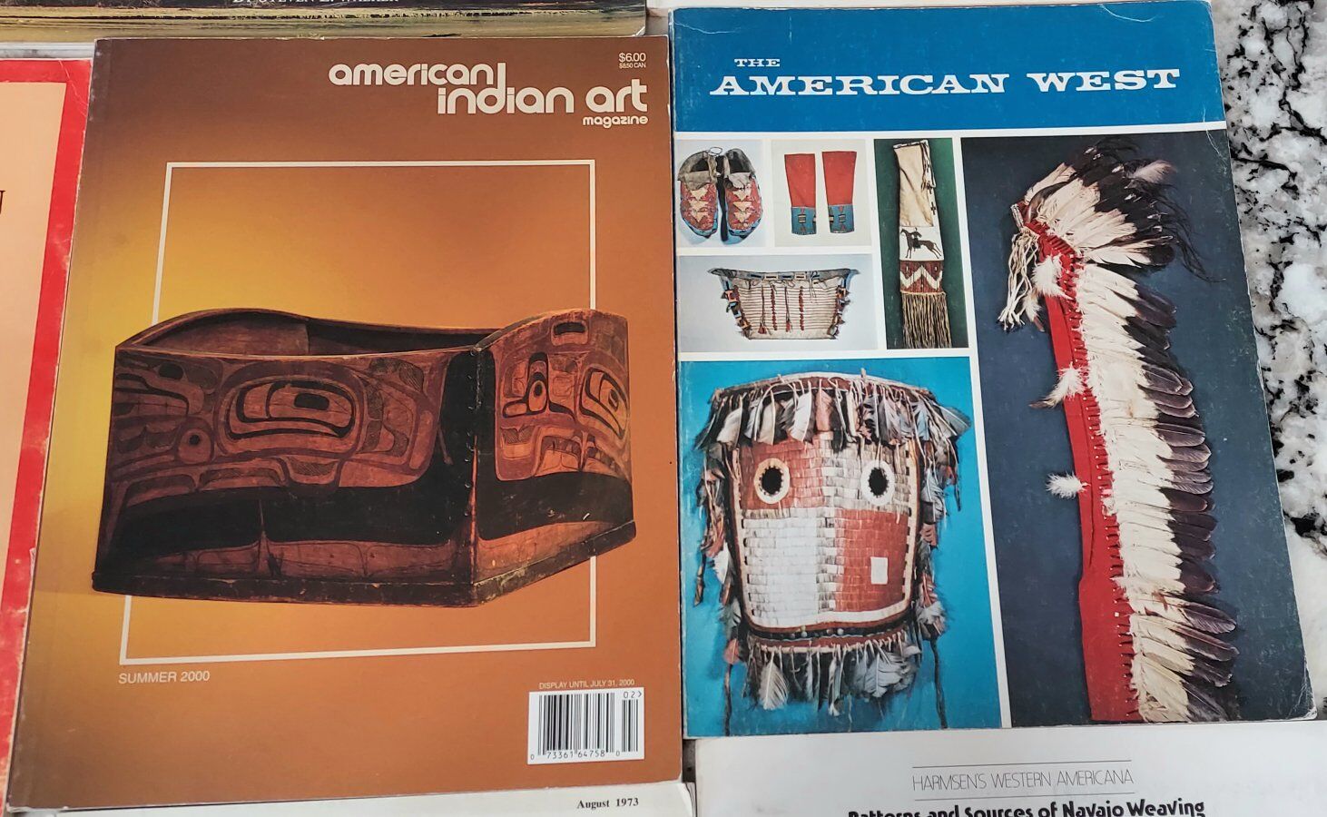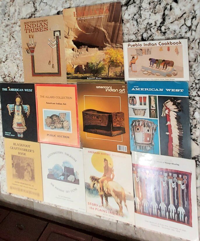 11 different books on the arts and cultures of different Indian Tribes. including, southwestern Indian Tribes, 1989, American Indian Art, 2000, Blackfoot Craftworkers book, 1977, Patterns & Sources of Navajo Weaving 1976, Southwestern Turquoise, 1976, American History Illustrated, 1973, 2 ofThe American West, 1979, and 1973, Indians of the American Southwest, 2009, Pueblo Cookbook, and a public auction book with lots of art values and pictures. Please text or message me with any questions, thanks