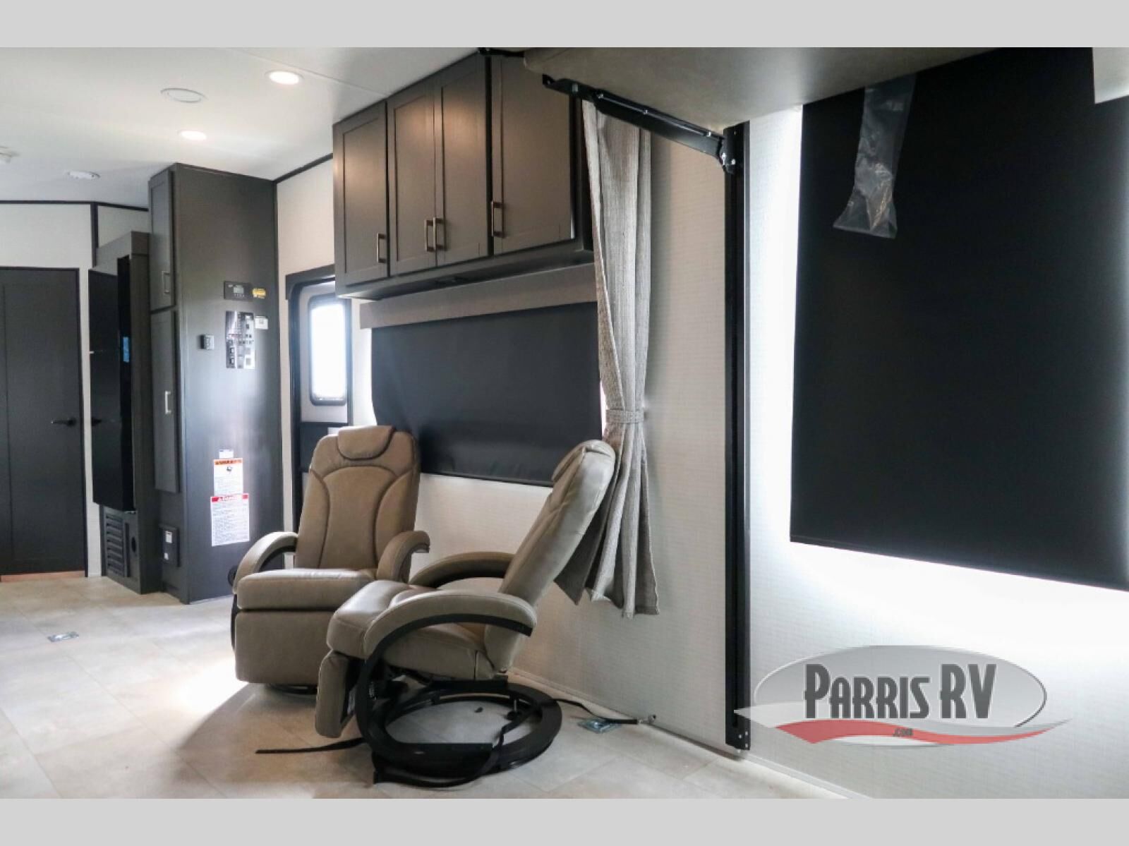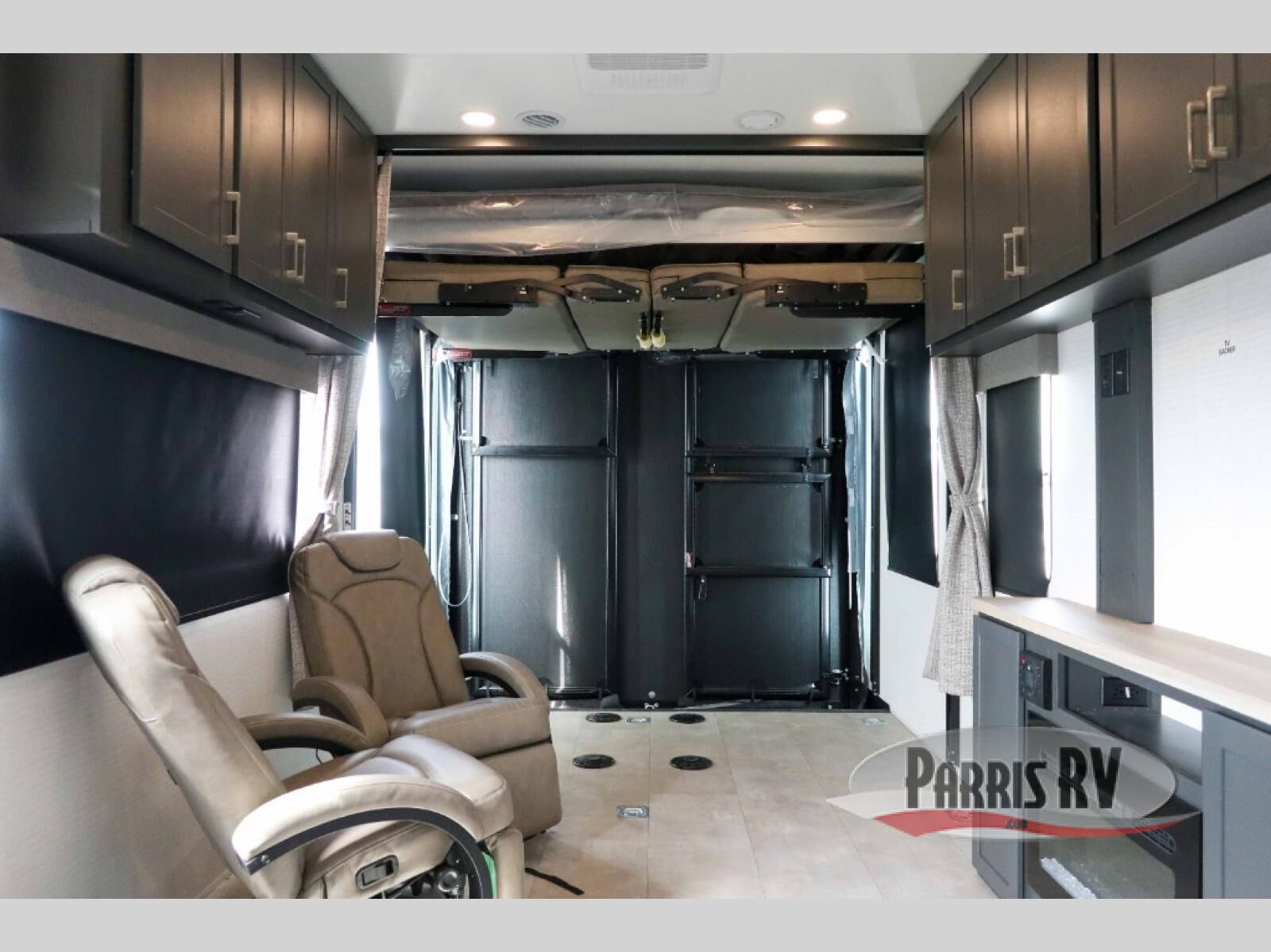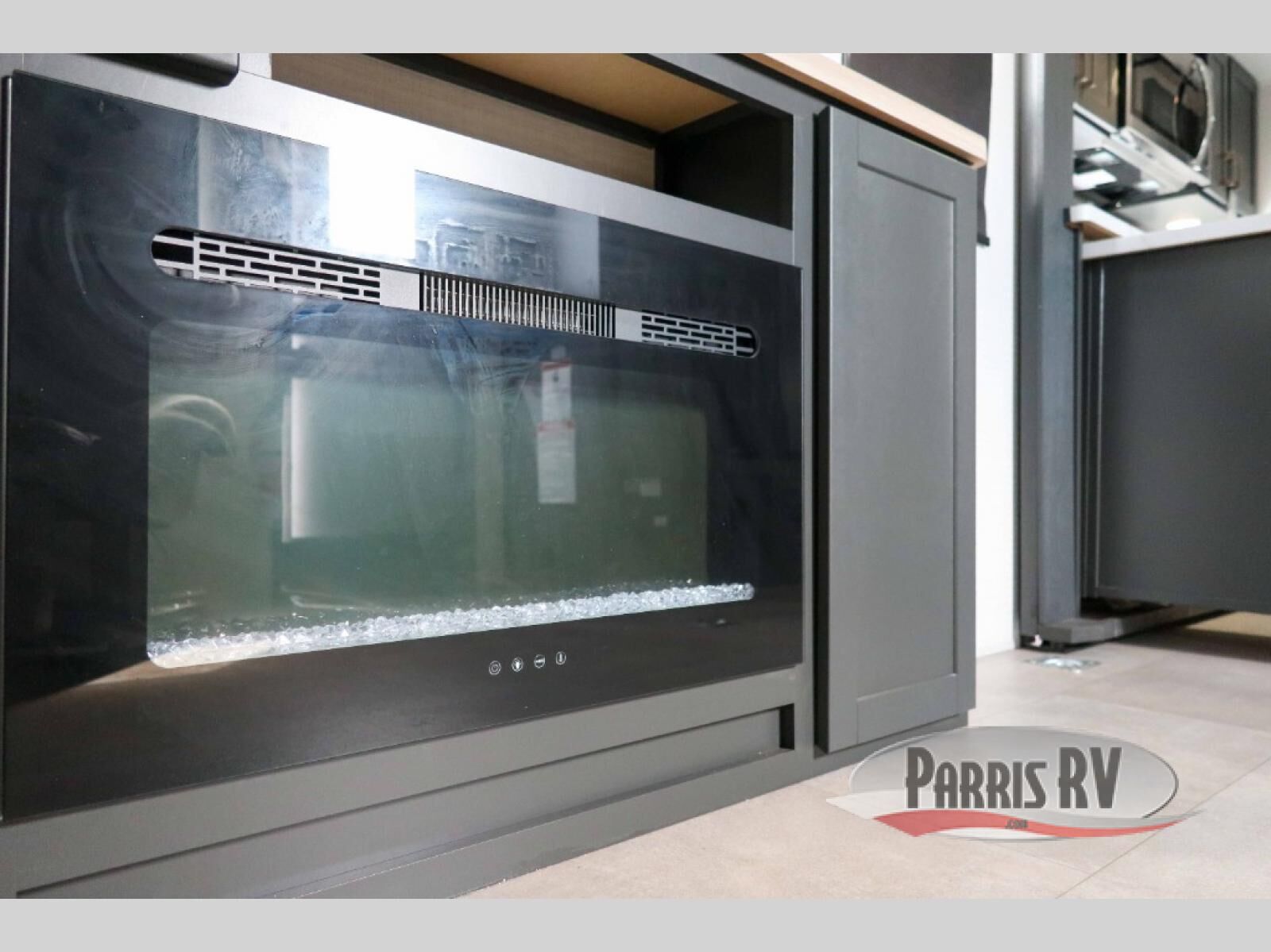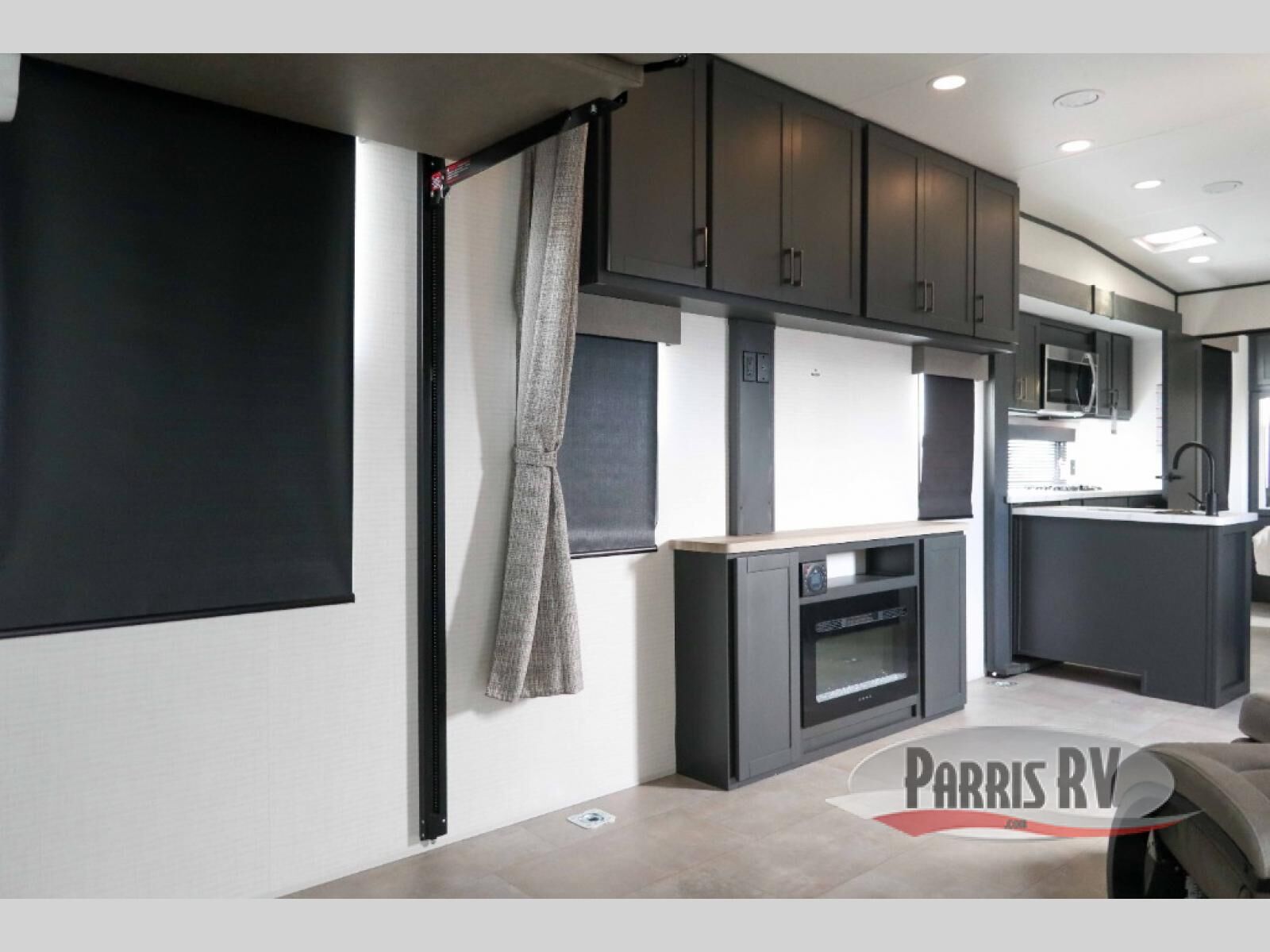 This dual entry travel trailer is sure to meet all your needs. Once you arrive at the campground, unload your toys from the 15' 7" total garage space, then grab a cold drink from the refrigerator. You can then relax on the dual lounge chairs, play a game at the electric pass-thru dinette, or let your guests rest on the electric bed. If you need a rest yourself, you'll find the king bed in the front master bedroom ultra comfortable. This model also includes an entertainment center with a fireplace and a kitchen slide out with the sink, counter space, cooktop, and pantry!