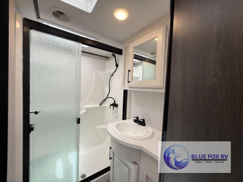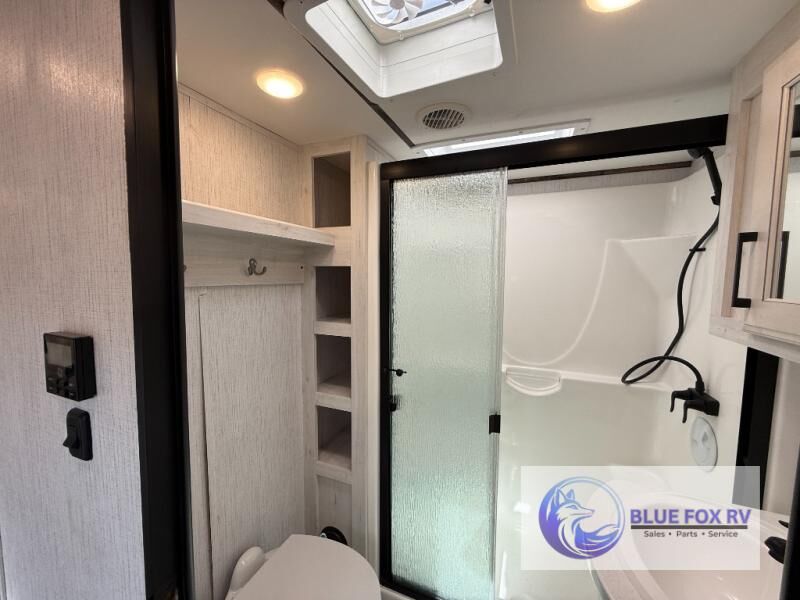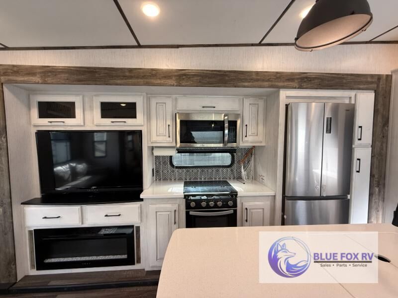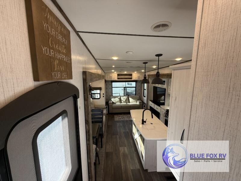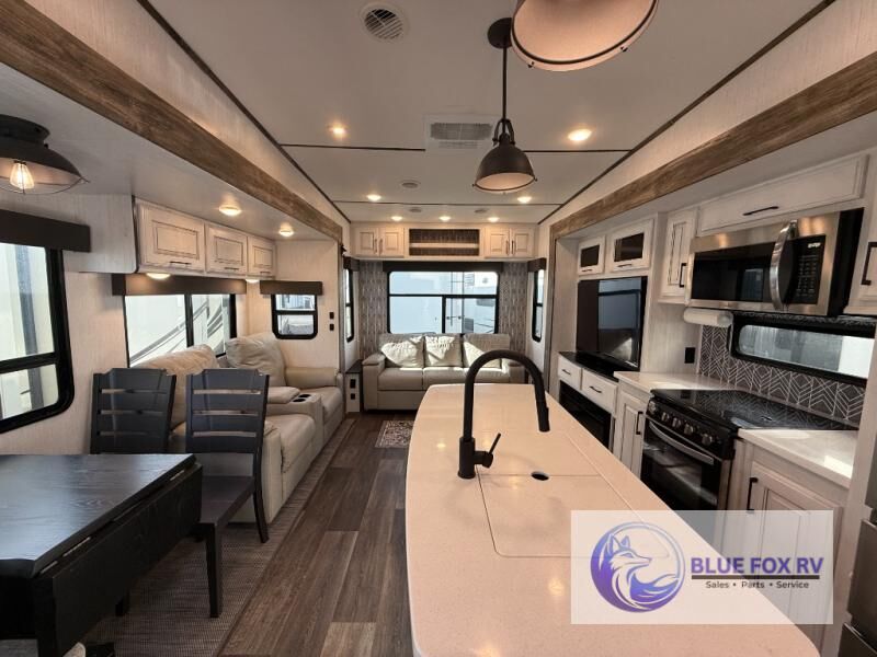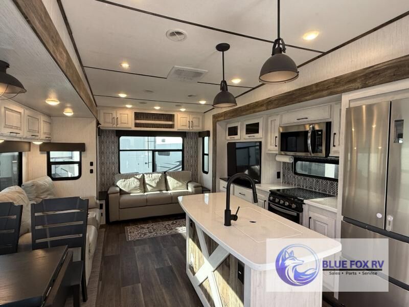 Don't pass up your chance to camp in true luxury with this fifth wheel! It features a front private bedroom with a king bed and a built-in closet that has an area prepped to add the optional washer and dryer so that your clothes can look their best throughout the entire trip. After a fun-filled day at the beach, you can head to the full bathroom and freshen up in the elegant one-piece fiberglass shower with a seat and glass door plus domed skylight. The cook will love the kitchen amenities including the oven and 30" microwave plus the oversized single-basin stainless steel sink. You can enjoy your meals at the free-standing dinette and then play a card game or relax on the rear sofa or power theater seating.