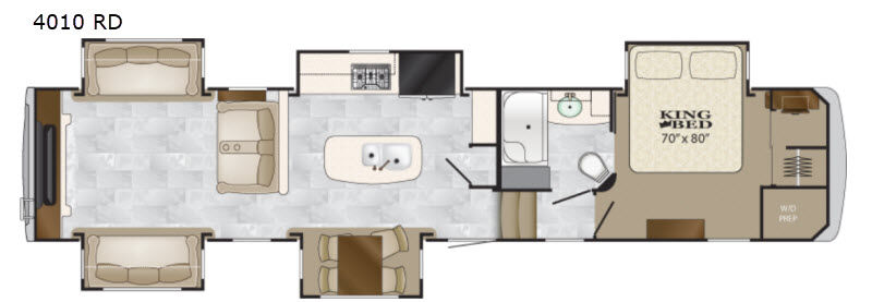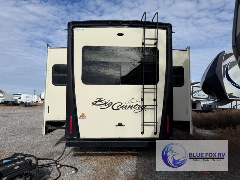 You will make plenty of memories with your family when you camp in this quad slide out Big Country 4010 RD fifth wheel. You can easily sleep up to six people in this model, plus you can do a little entertaining in the rear living area. Here you will find two sofa slide outs and a set of theater seats. Meal prep is easy in this kitchen. Here you will find an island with extra counter space and a double sink. You can enjoy your meals at the free-standing dinette and in the evening plan to play a card game or two here. When you are ready to turn in for the night then retreat to the front bedroom where you will find a king bed plus a large wardrobe and a wardrobe that has been prepped for a washer and dryer. Outside the 18' awning provides plenty of shade from the sun so you can spend more time outdoors and more!