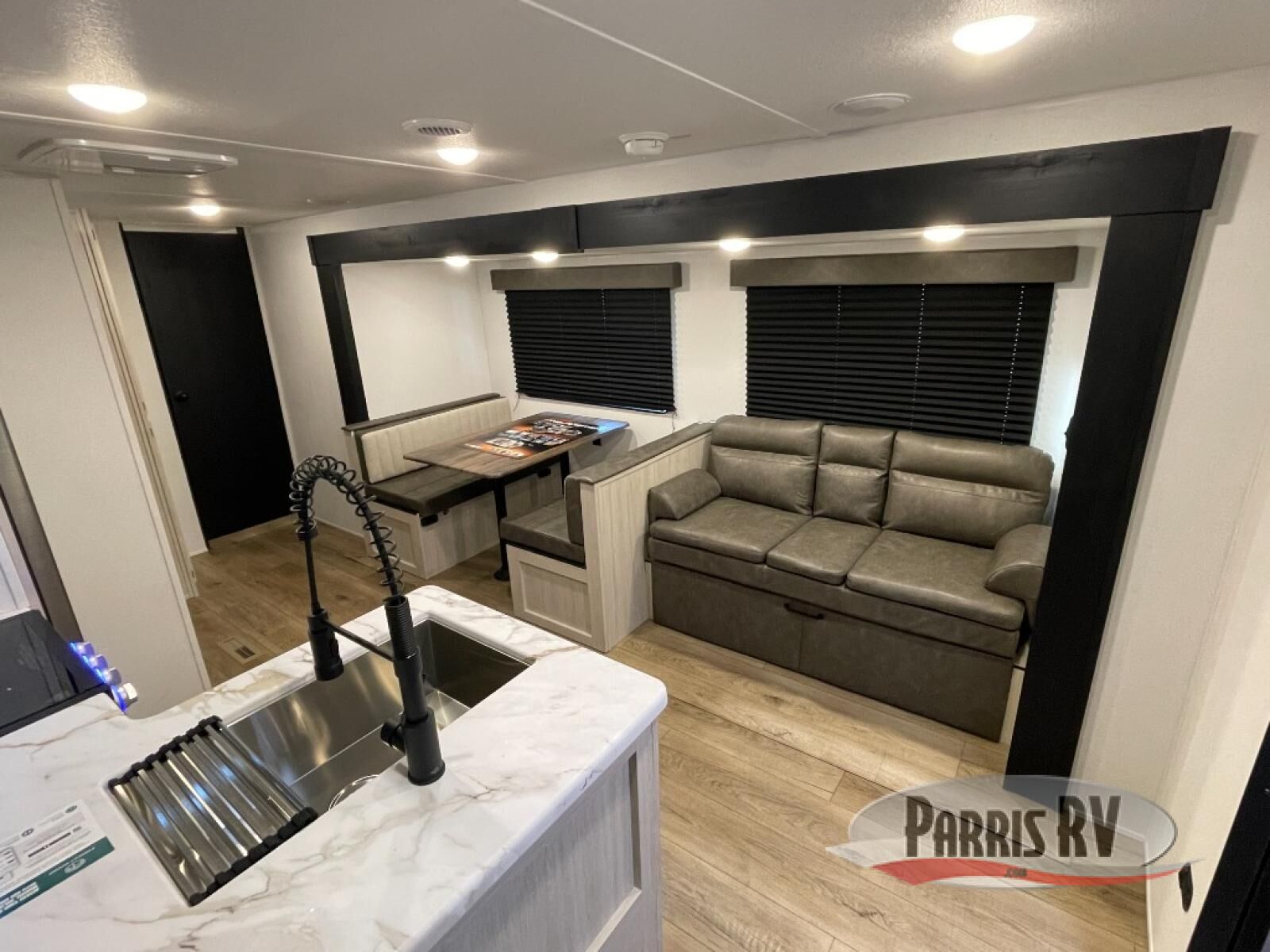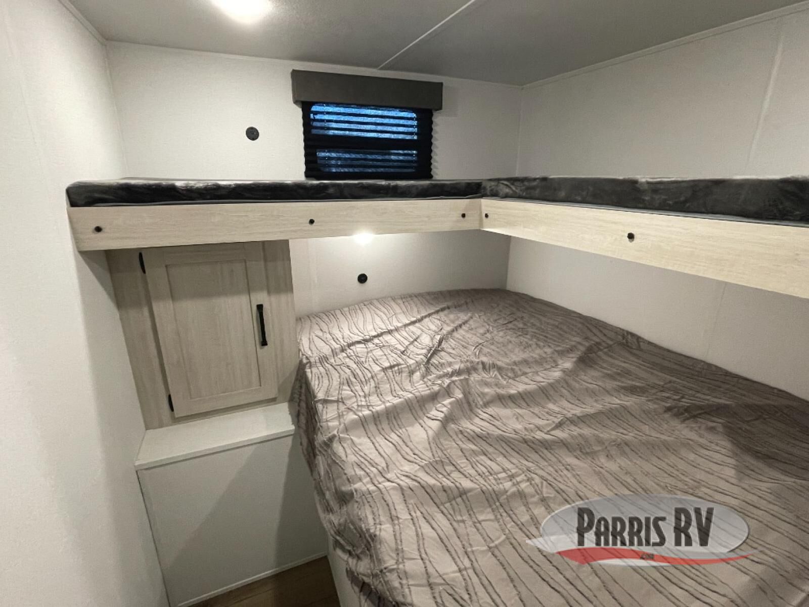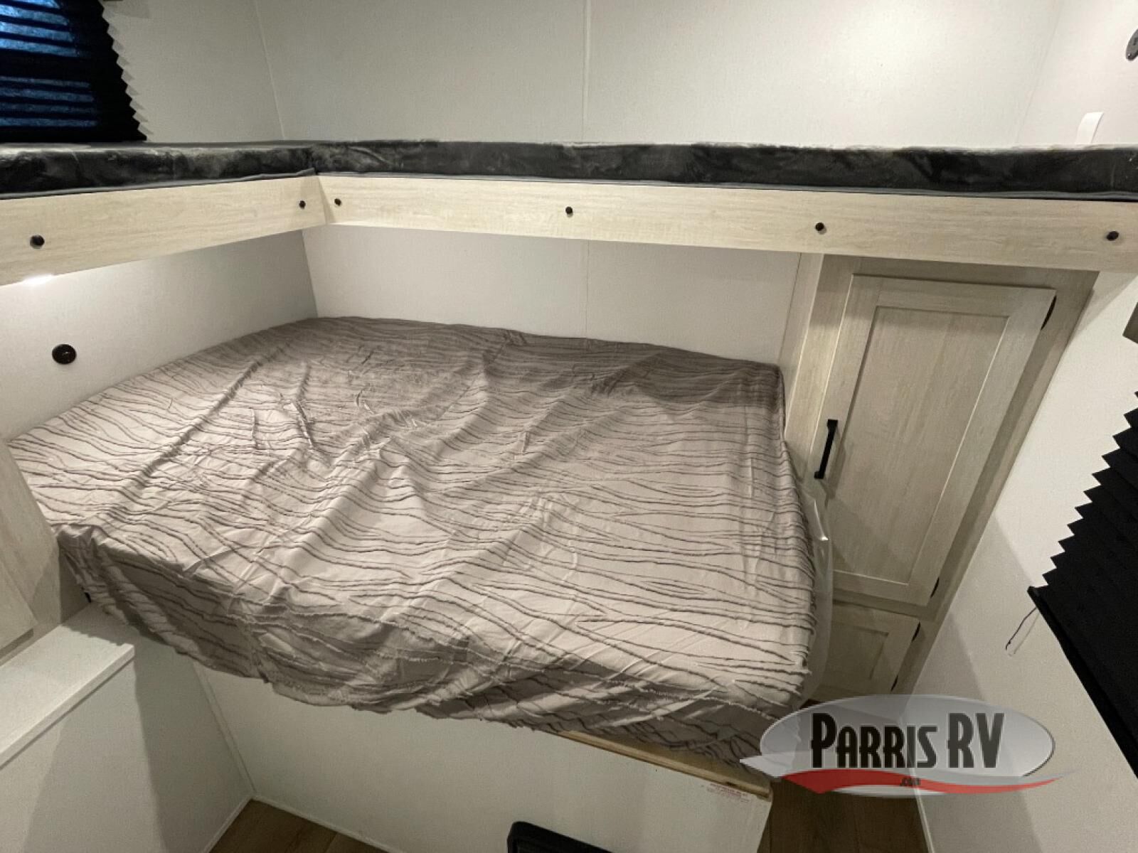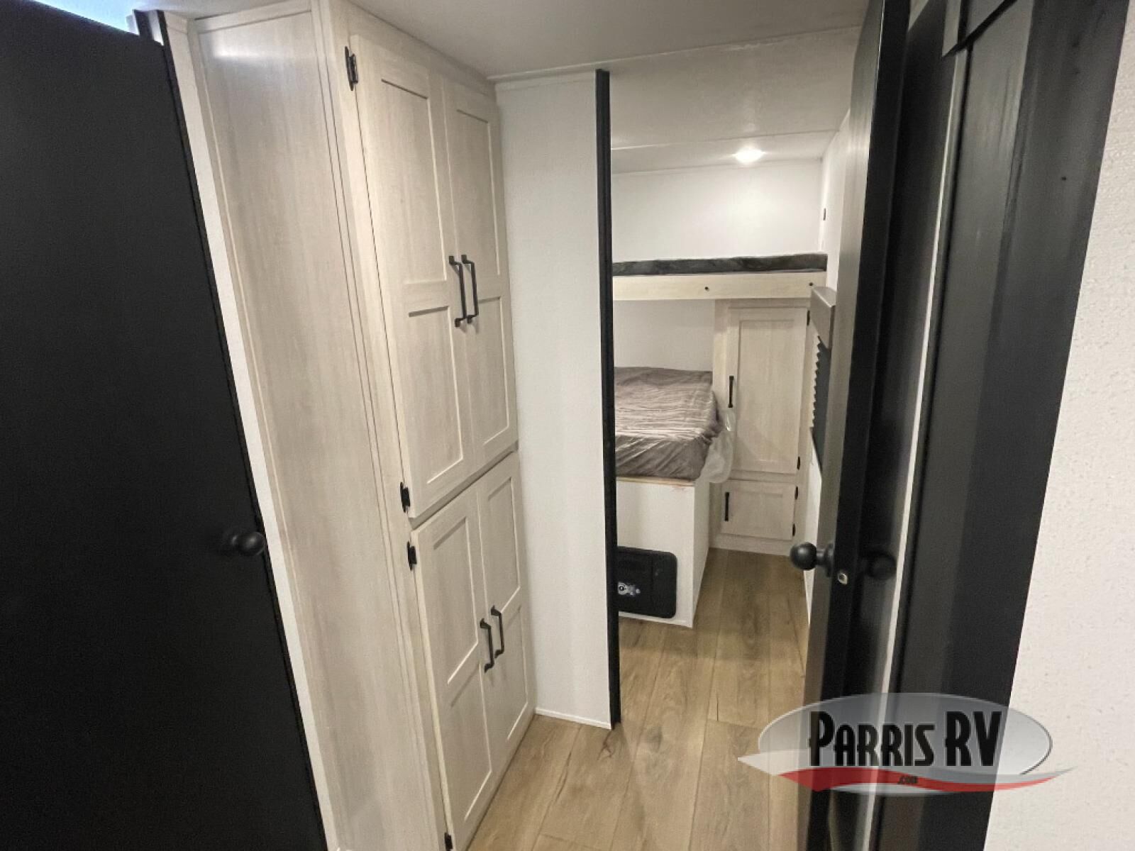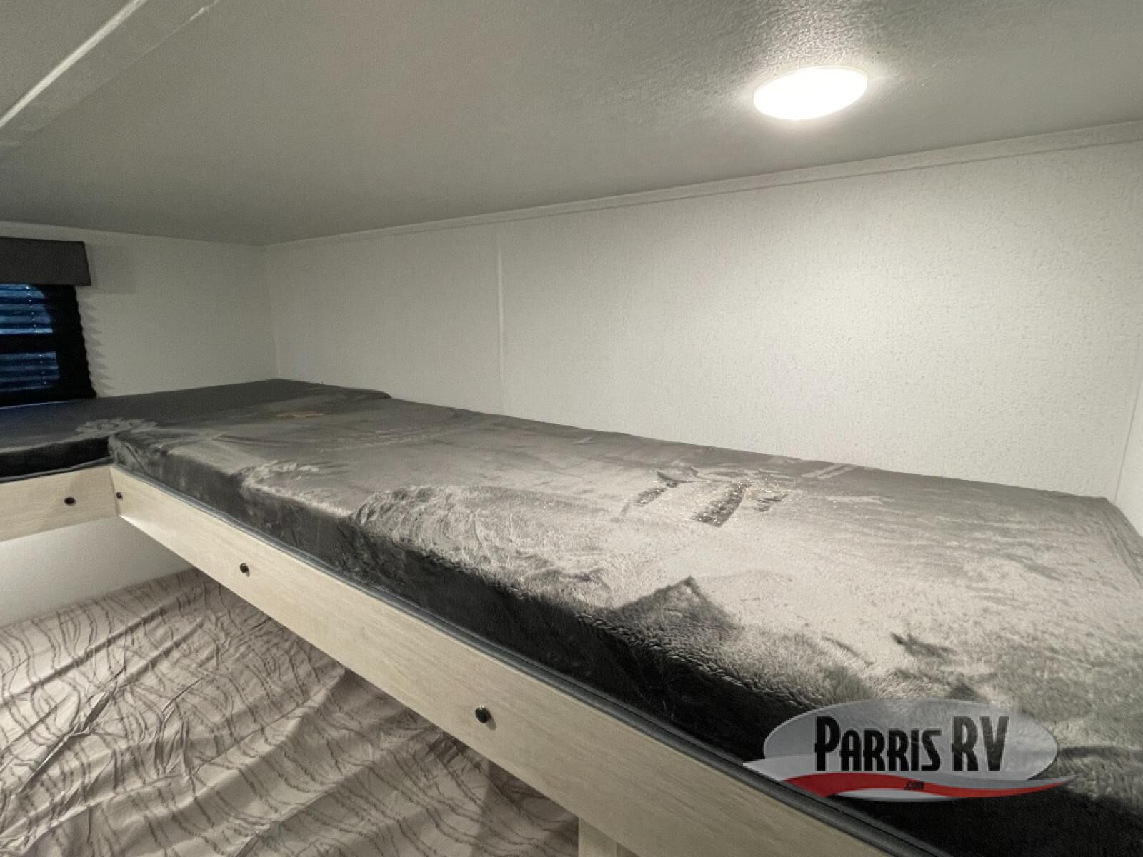 If you're looking for more space, this double axle unit features a large slide so you can walk about freely. Here, you'll find the booth dinette and sofa, which sit across from the optional TV if you want to enjoy movie nights. The full kitchen includes a stainless microwave and three burner cooktop to make meals, plus a pantry and 12V refrigerator for food storage. And an optional outside mini kitchen with a grill can be added if you enjoy cooking outdoors! Your guests or littles are sure to enjoy the rear bedroom with a queen bed, a 28" x 65" bunk, 28" x 76" bunk, a shirt closet, and a wardrobe so everything has a place!