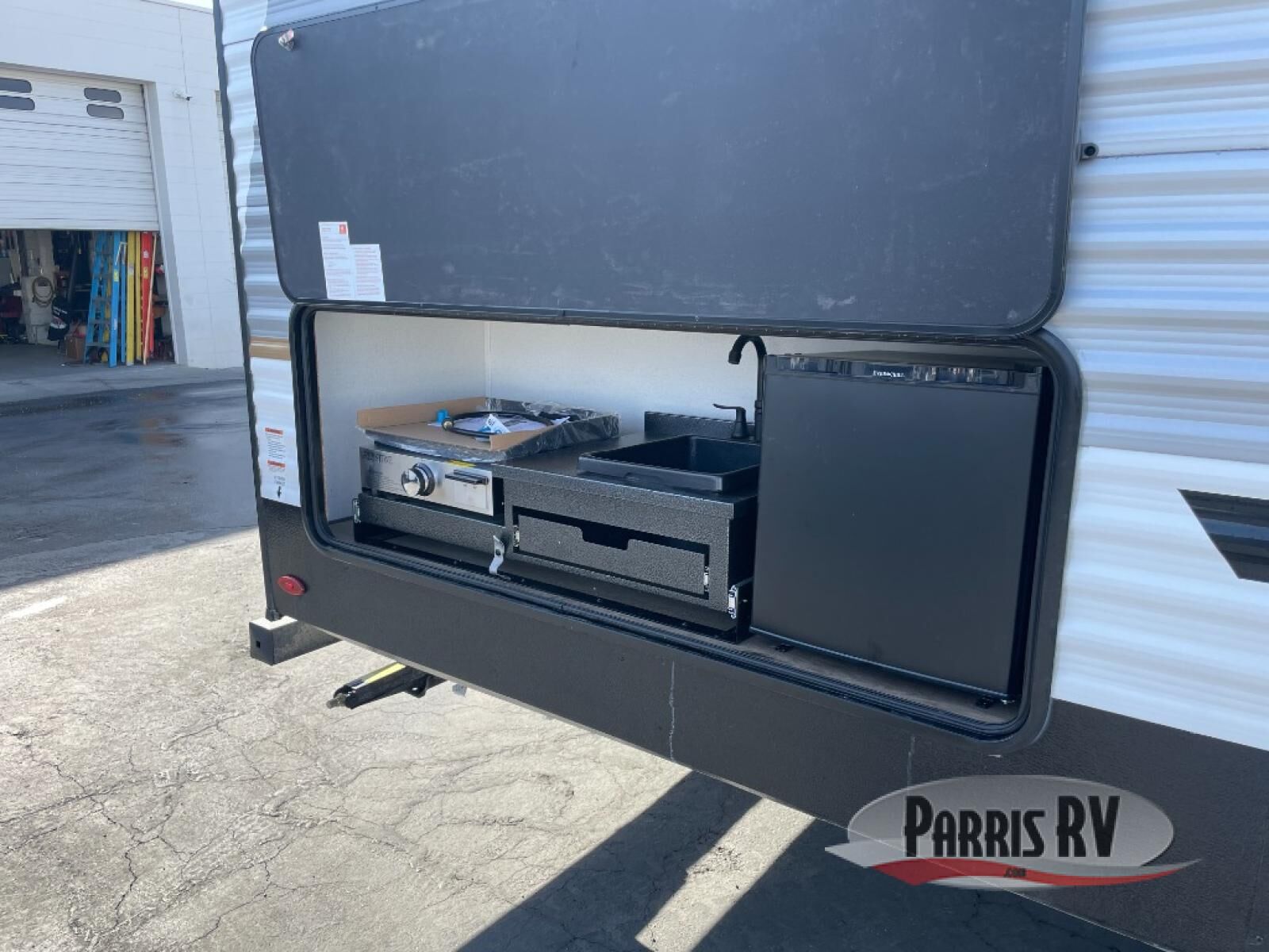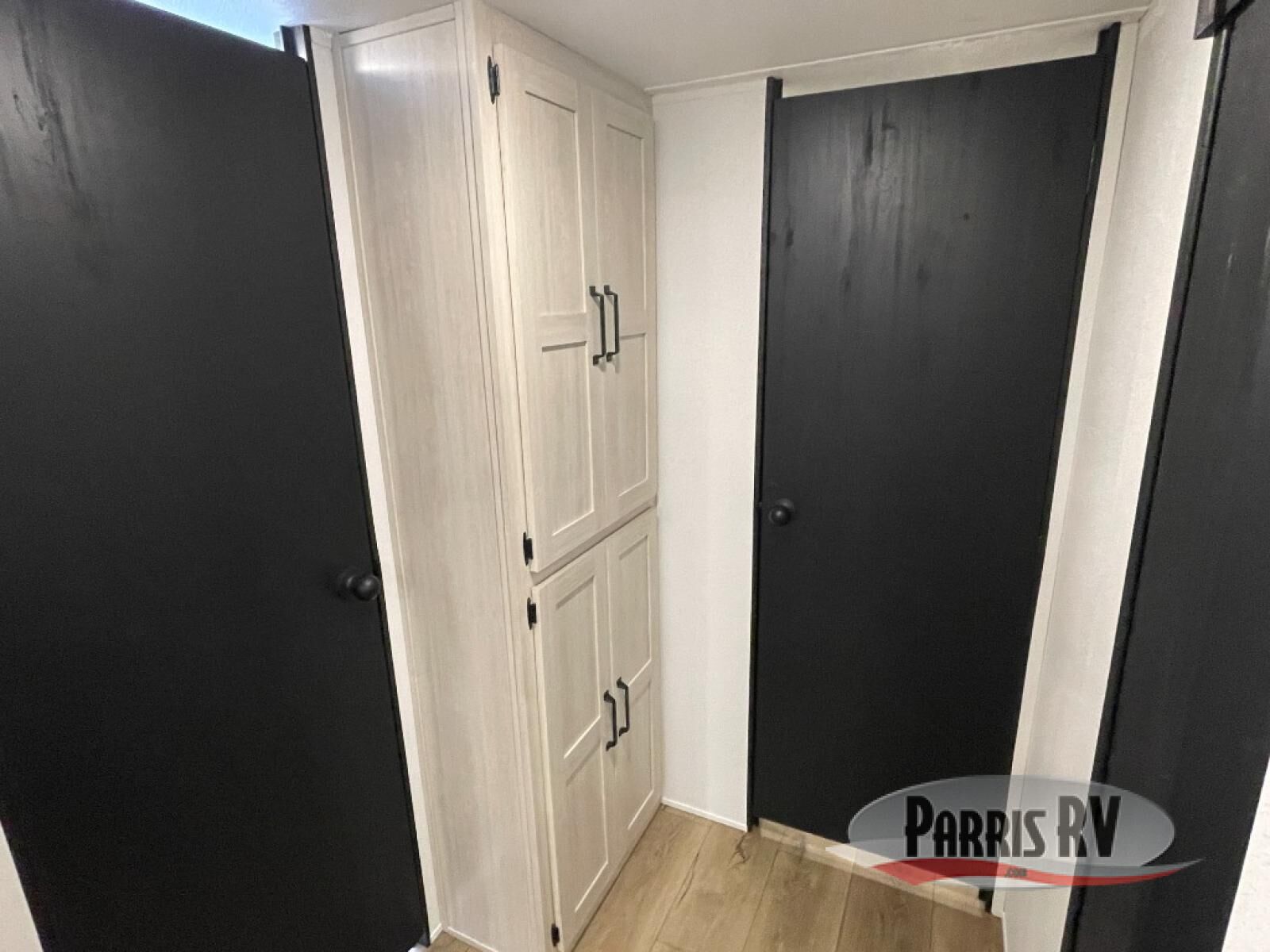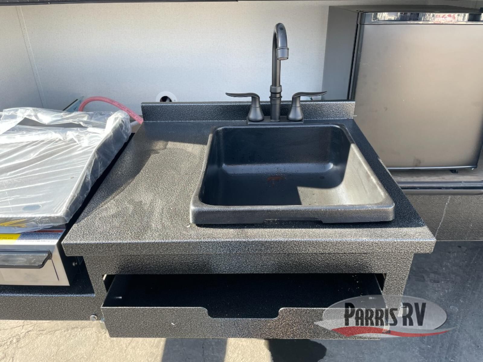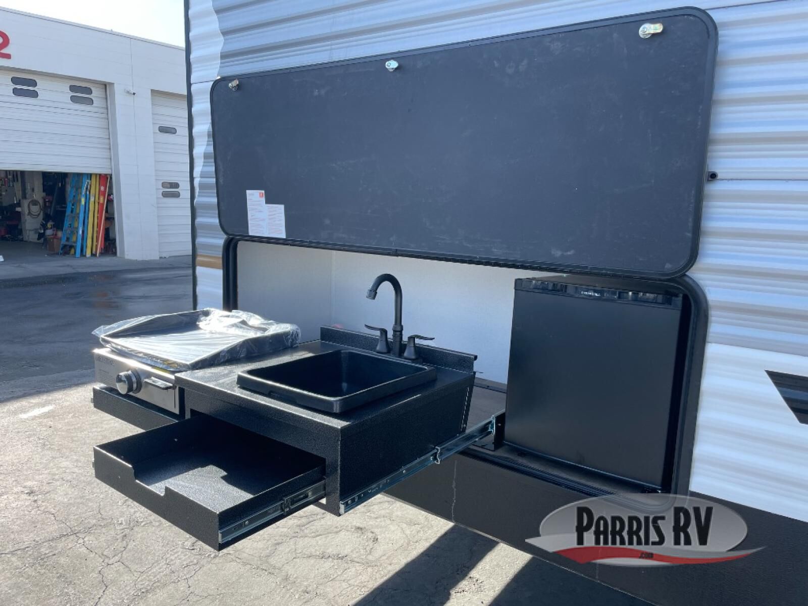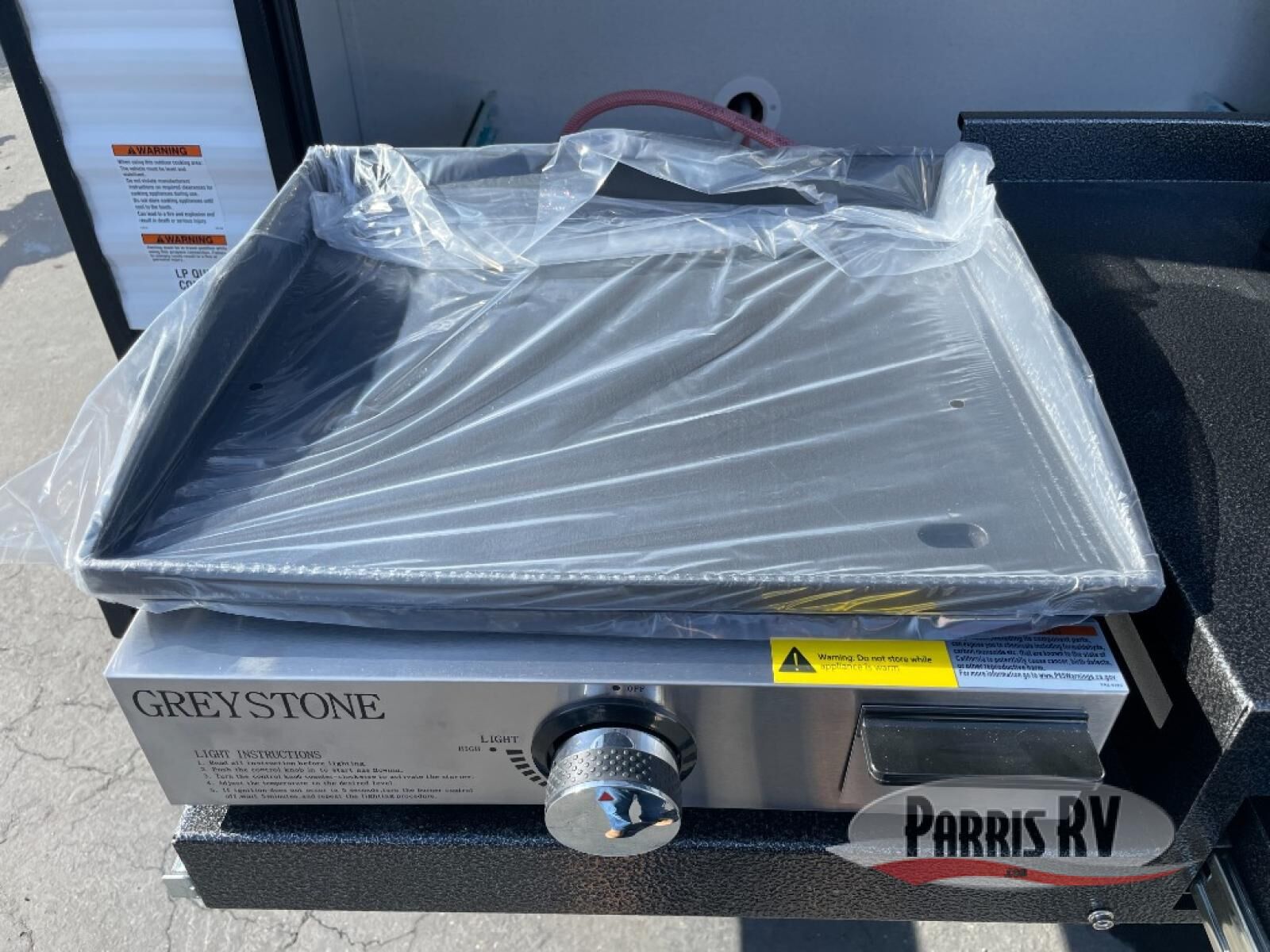 If you're looking for more space, this double axle unit features a large slide so you can walk about freely. Here, you'll find the booth dinette and sofa, which sit across from the optional TV if you want to enjoy movie nights. The full kitchen includes a stainless microwave and three burner cooktop to make meals, plus a pantry and 12V refrigerator for food storage. And an optional outside mini kitchen with a grill can be added if you enjoy cooking outdoors! Your guests or littles are sure to enjoy the rear bedroom with a queen bed, a 28" x 65" bunk, 28" x 76" bunk, a shirt closet, and a wardrobe so everything has a place!