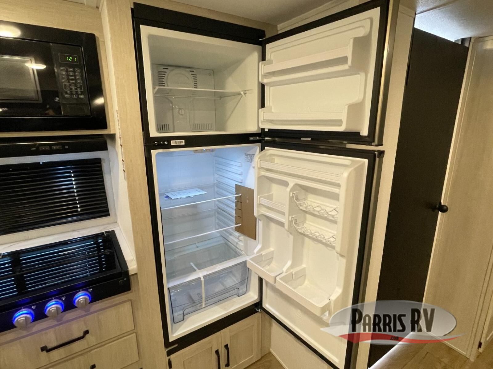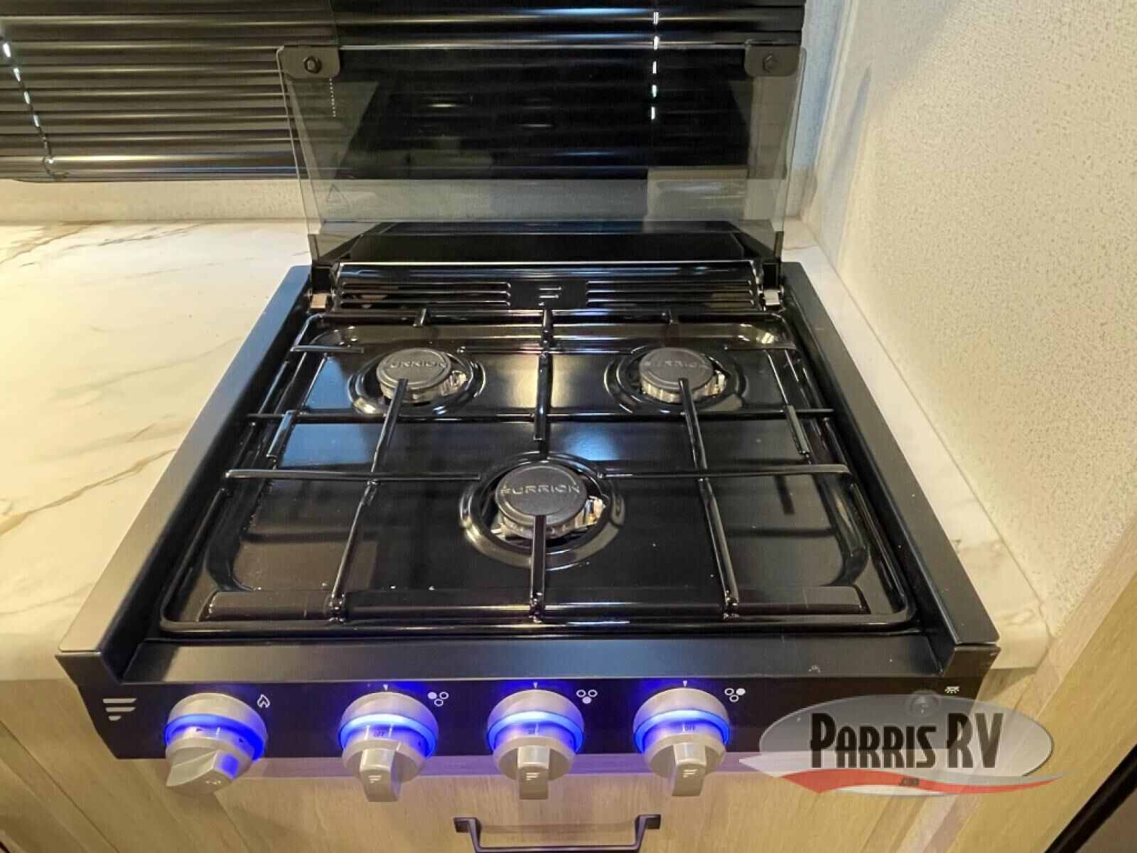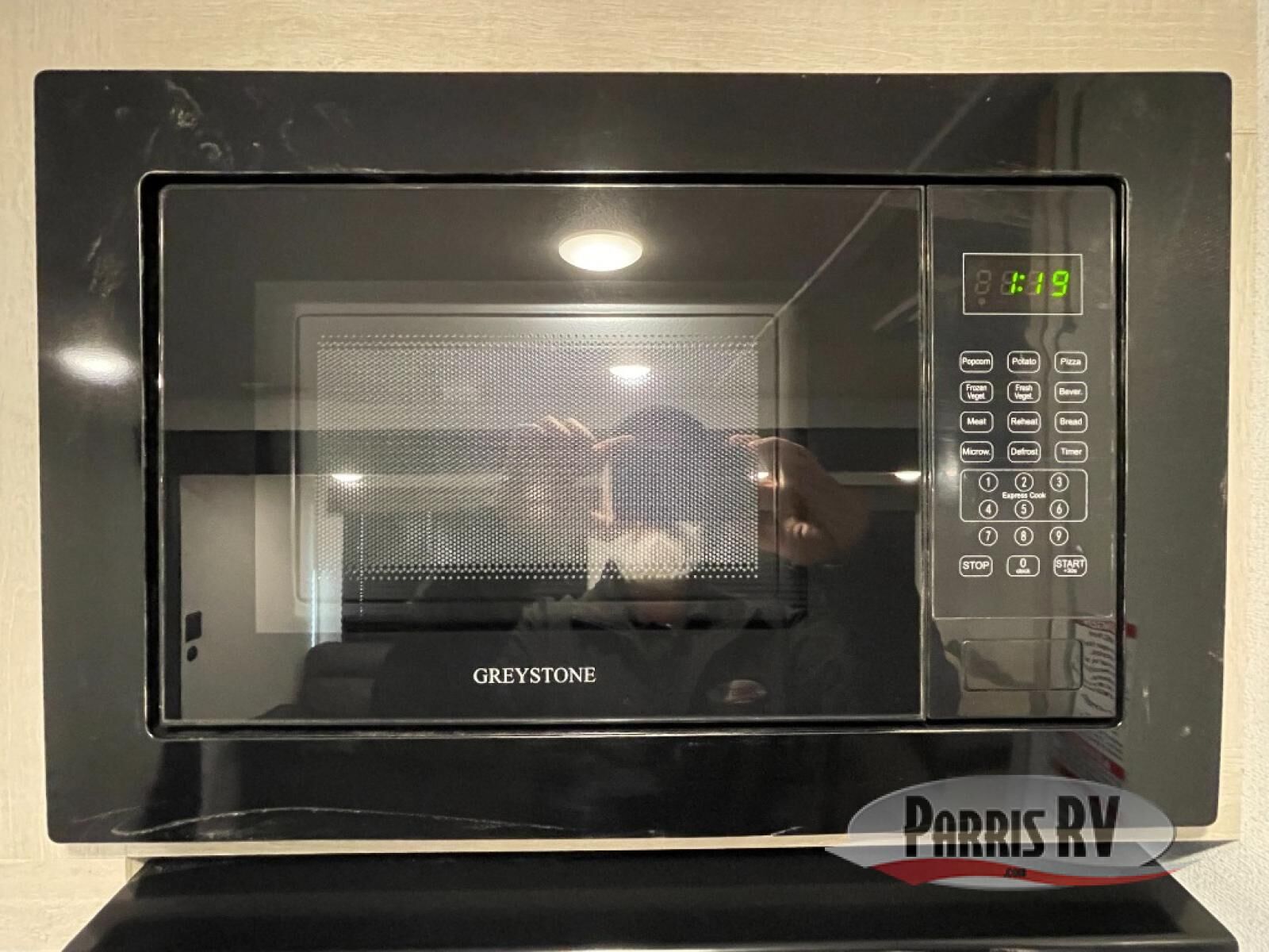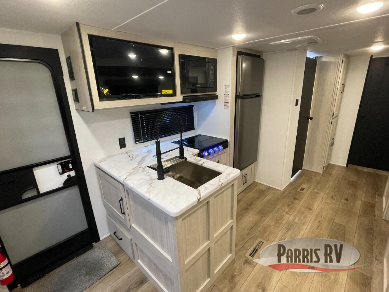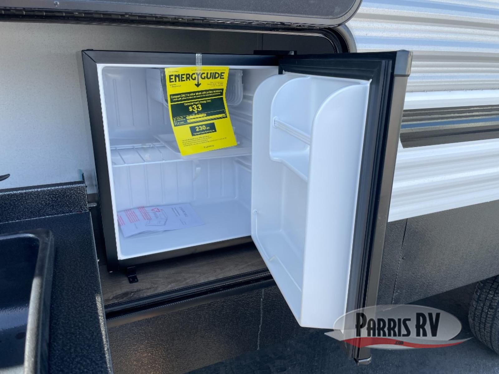 If you're looking for more space, this double axle unit features a large slide so you can walk about freely. Here, you'll find the booth dinette and sofa, which sit across from the optional TV if you want to enjoy movie nights. The full kitchen includes a stainless microwave and three burner cooktop to make meals, plus a pantry and 12V refrigerator for food storage. And an optional outside mini kitchen with a grill can be added if you enjoy cooking outdoors! Your guests or littles are sure to enjoy the rear bedroom with a queen bed, a 28" x 65" bunk, 28" x 76" bunk, a shirt closet, and a wardrobe so everything has a place!