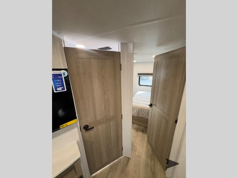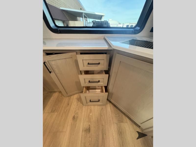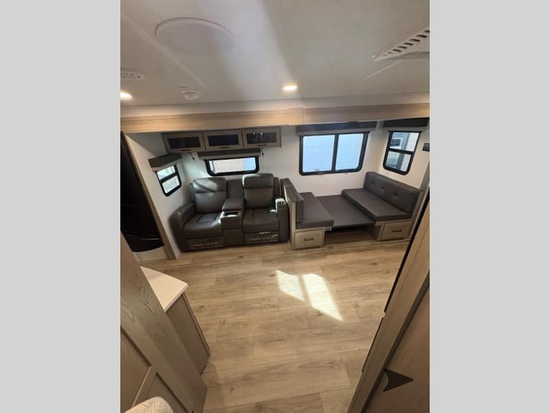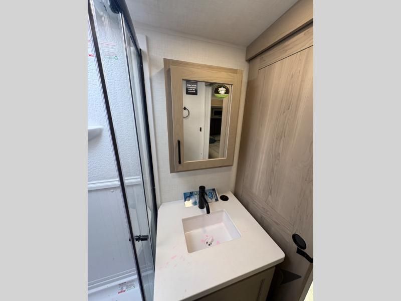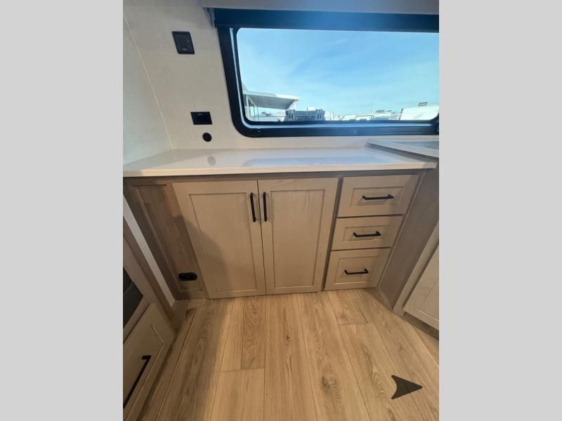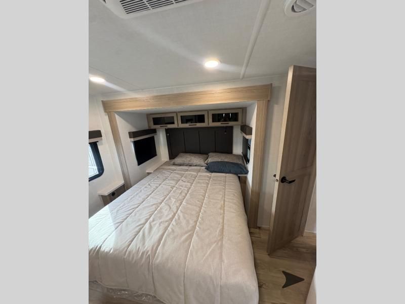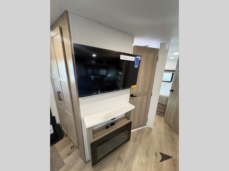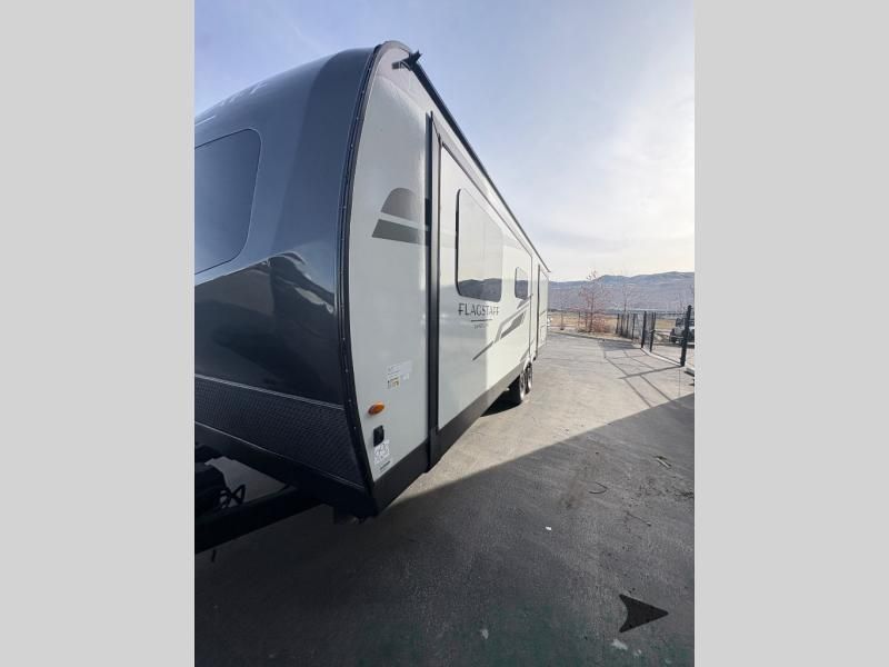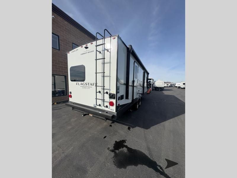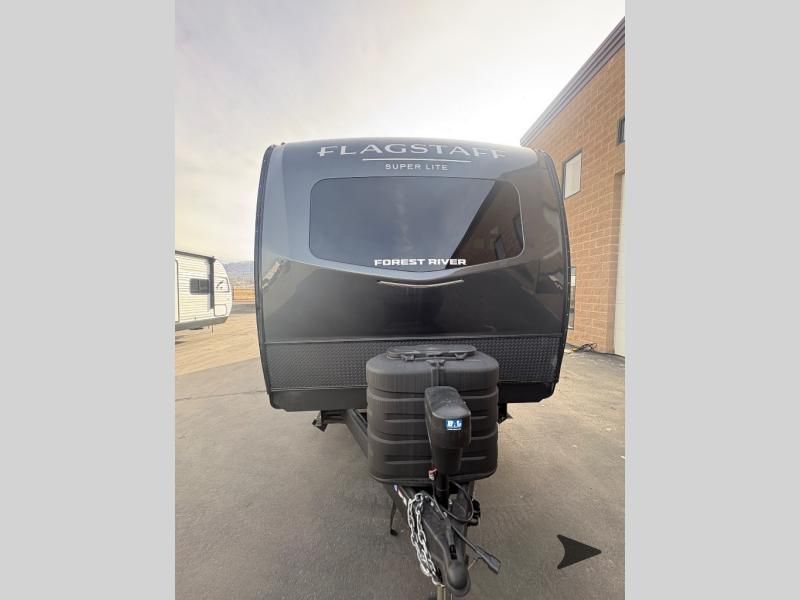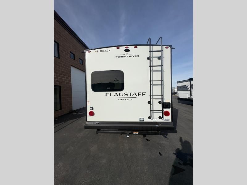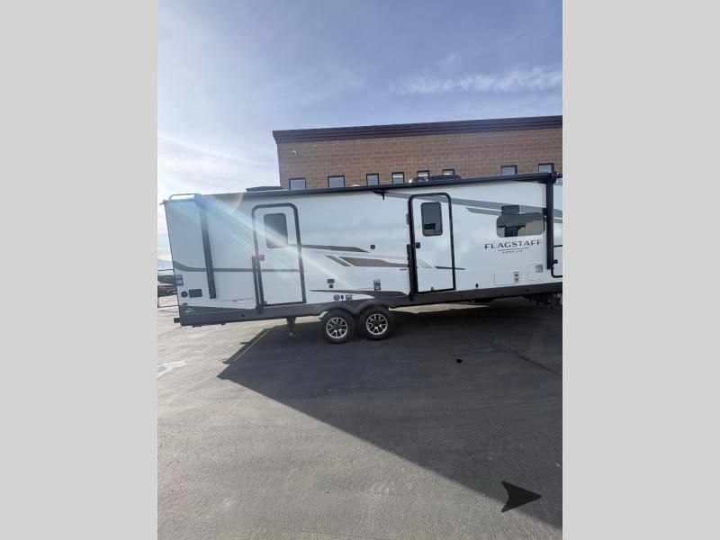Forest River Flagstaff Super Lite travel trailer 26FKBS highlights: Front Kitchen Dual Entry Fireplace Exterior Storage This is the perfect couples trailer with a spacious living and kitchen area and a rear bedroom which includes the second exterior entry/exit door! The bedroom also provides a slide out queen bed, a wardrobe and an optional TV, plus windows for great views and access to the double entry bathroom. The front kitchen gives the cook counter space and cabinetry for dishes and such, plus all the appliances needed to make warm meals and store leftovers. You can dine at the booth dinette, relax on the 67" theater seating and watch the Smart TV while enjoying the fireplace. With any Flagstaff Super Lite travel trailer by Forest River, you can enjoy quality features with lightweight towing! The Climate Protection Package includes radiant foil in the front cap, underbelly, and slides, plus there are 12V thermostat-controlled heated tanks for added protection. The complete composite wall construction and 6-sided full-aluminum frame is ultra durable, and the RoadTech tire pressure monitoring adds safety. Each model also includes the Coast to Coast Package that comes with slam latch baggage doors, a high gloss fiberglass cap, Goodyear Endurance tires, plus a 200W solar panel with an optional additional 200W panel for more off grid capabilities. Inside, you'll love the roller shades, solid surface kitchen countertops, a shower miser system, and many more comforts!