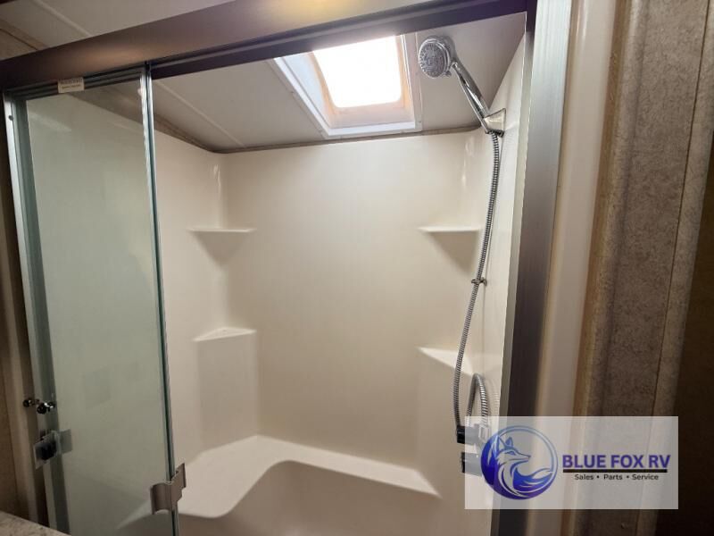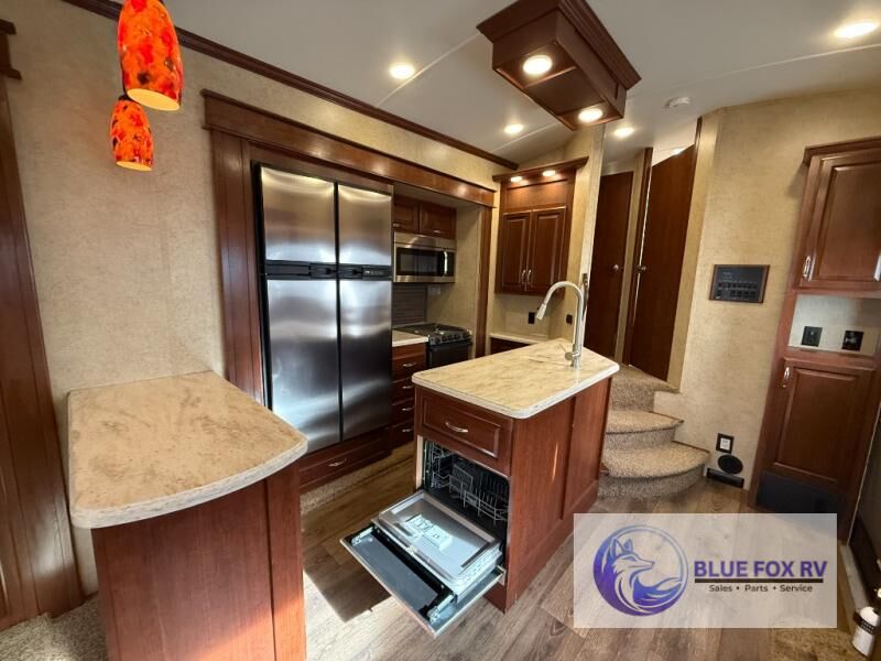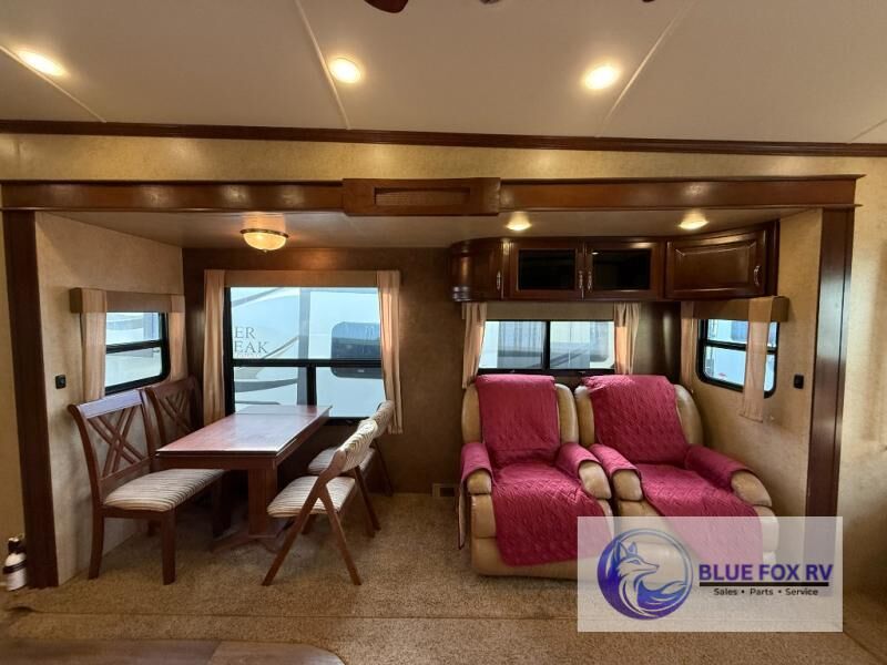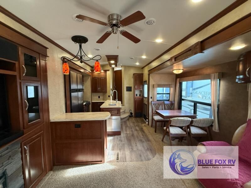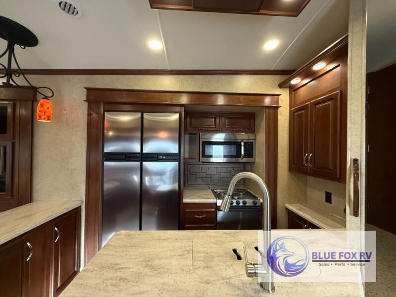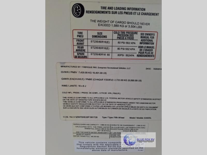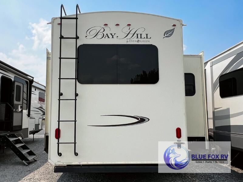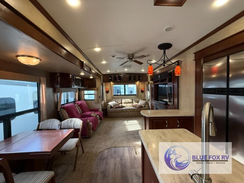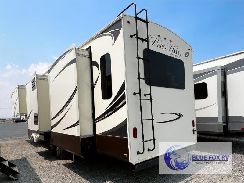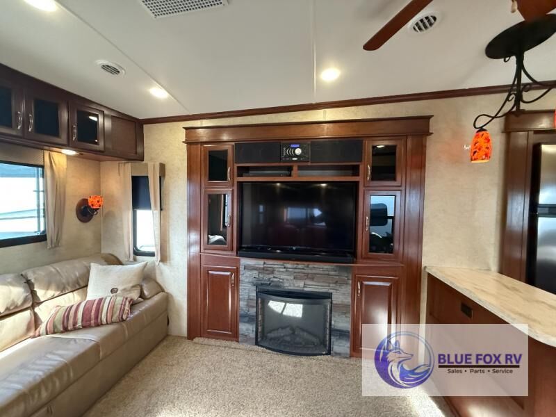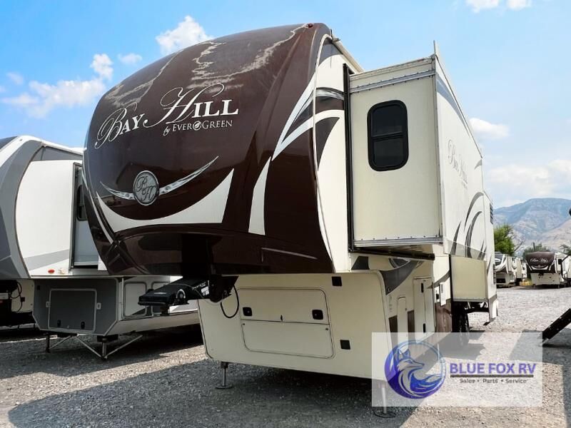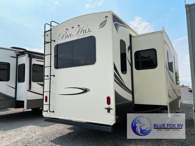 The Evergreen Bay Hill 365RL fifth wheel boasts of beauty. To the left of the entrance is a slide with theater seating with recliners, and a free standing table. The rear living offers a rear wall sofa. You can enjoy the entertainment center slide, which really helps to open up the floor space on this model.