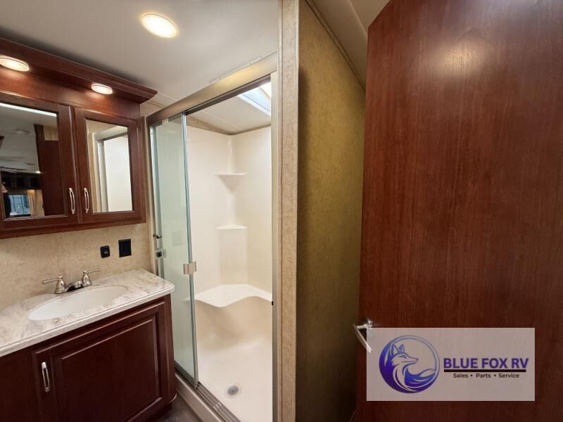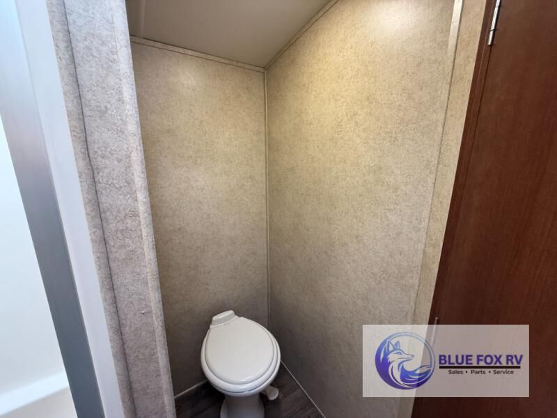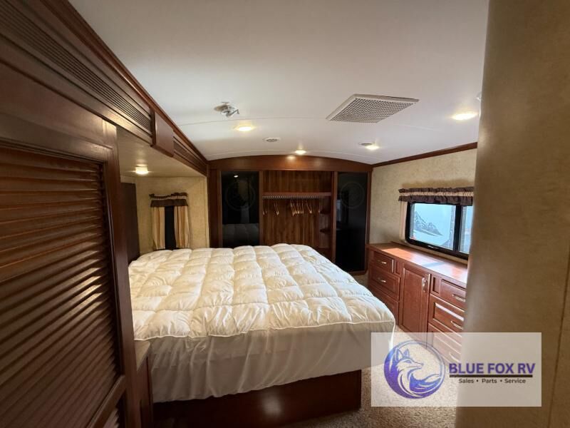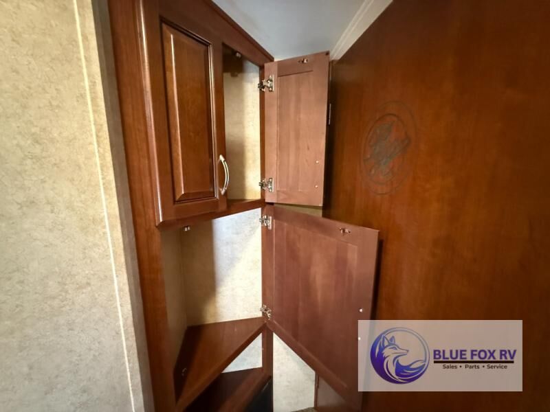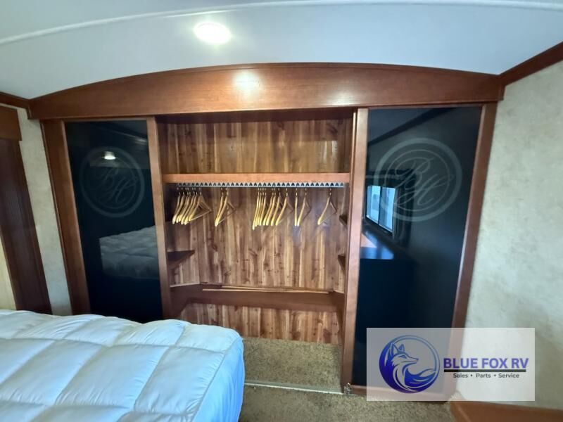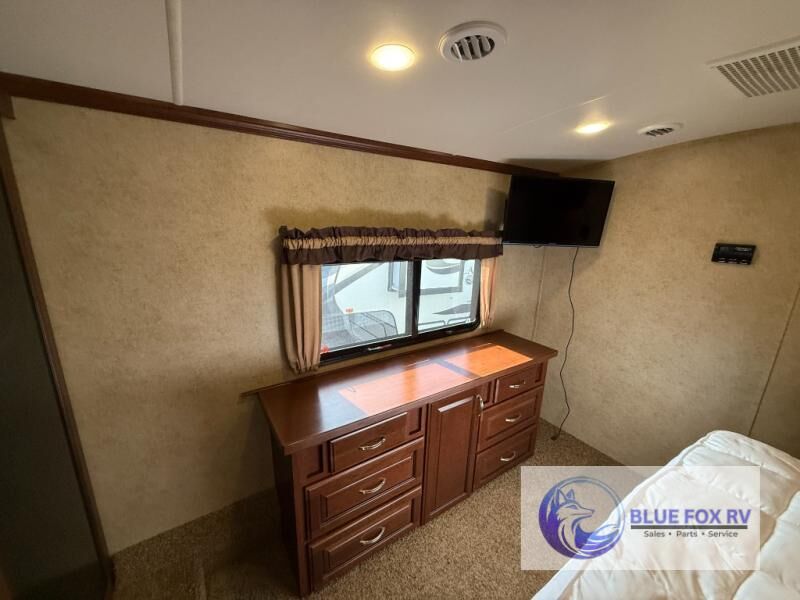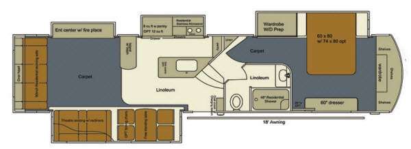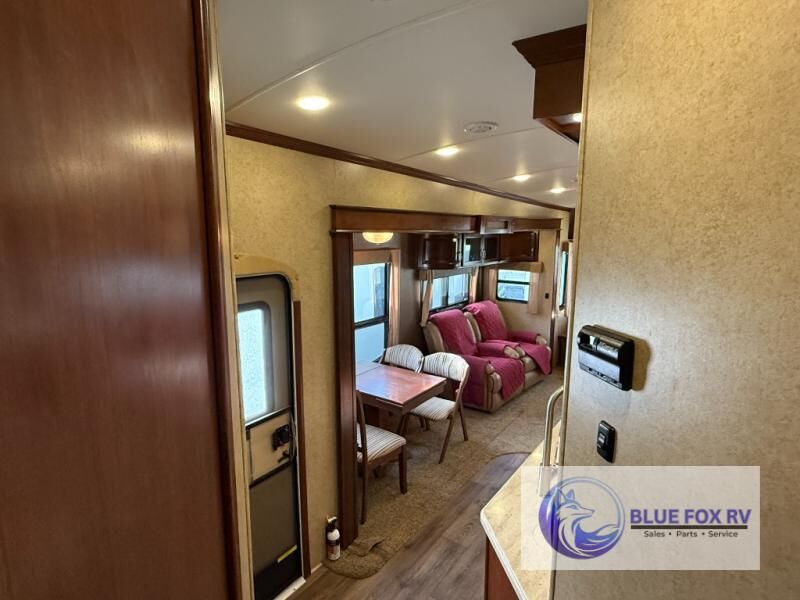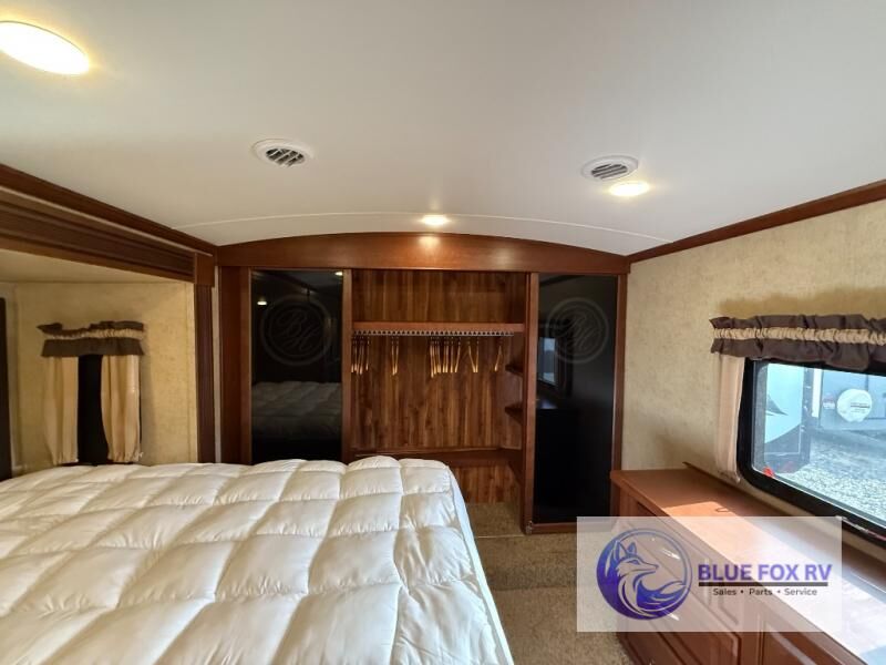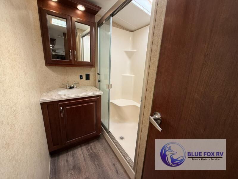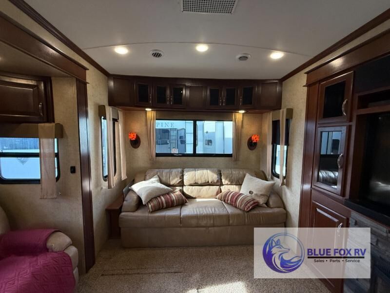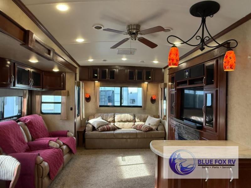 The Evergreen Bay Hill 365RL fifth wheel boasts of beauty. To the left of the entrance is a slide with theater seating with recliners, and a free standing table. The rear living offers a rear wall sofa. You can enjoy the entertainment center slide, which really helps to open up the floor space on this model.