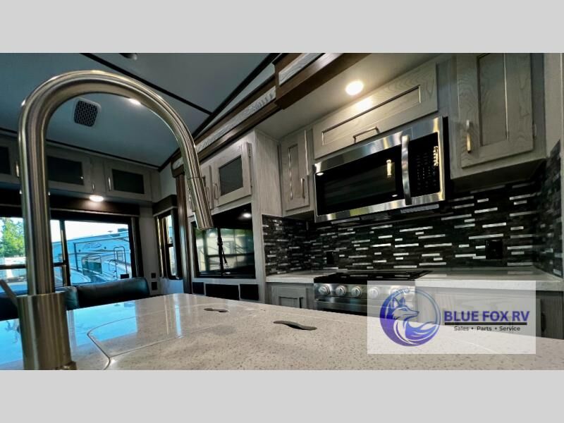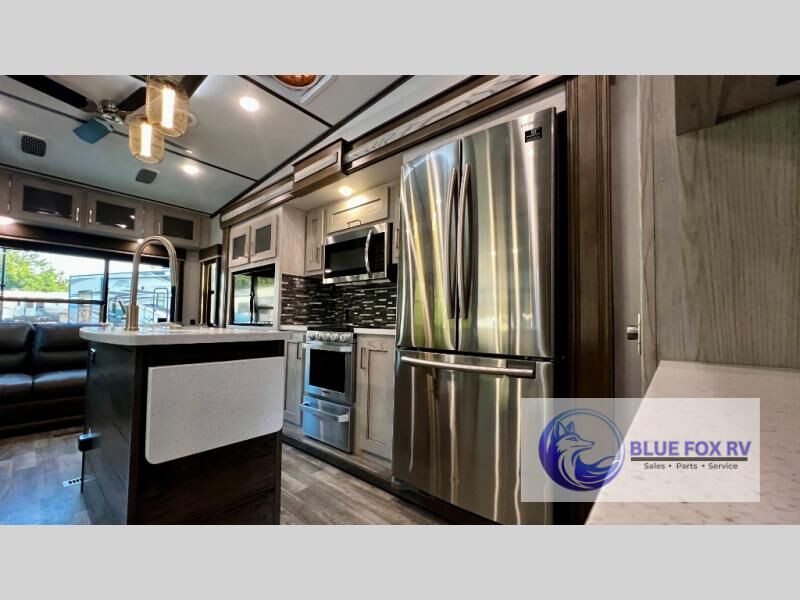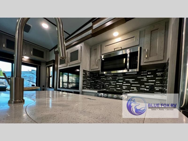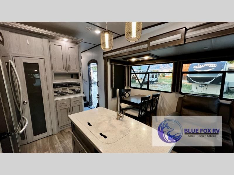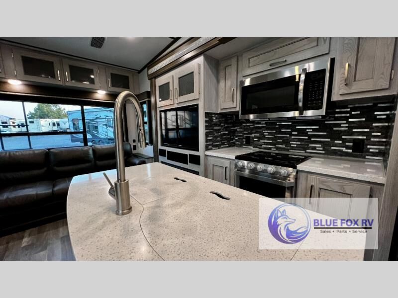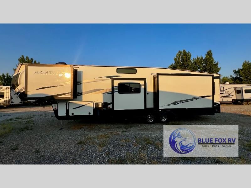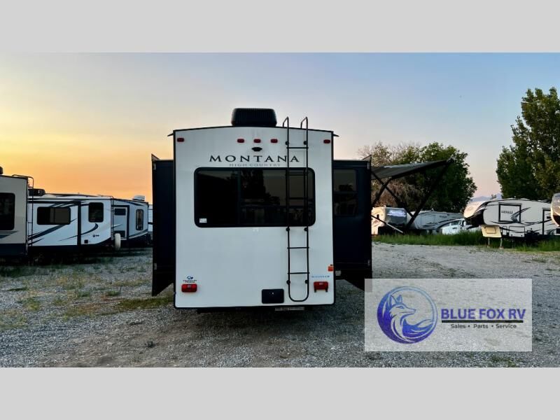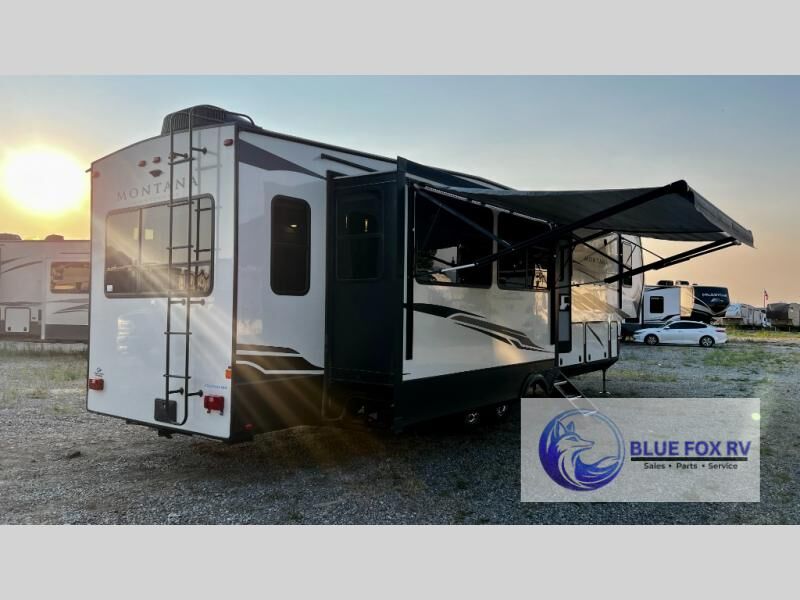When heading out and setting up in a Keystone Montana High Country fifth wheel you will appreciate the Dexter E-Z Lube axles, Max Turn front cap and radius frame with Hitch Vision, and an enormous drop frame pass-through storage compartment to name a few features. Inside you will find luxury and comfort with the 78" tall main slide outs and flush mounted LED interior lights. The bath features a skylight over the shower, seamless countertops, and a vanity with three drawers for extra storage space!. The chef of the family is going to love the Montana High Country's kitchen with its Furrion 21" two in one stainless steel cooktop and oven, a 30" over-the-range microwave, solid surface countertops, and a high-rise faucet with an integrated pull-out sprayer, plus so much more!