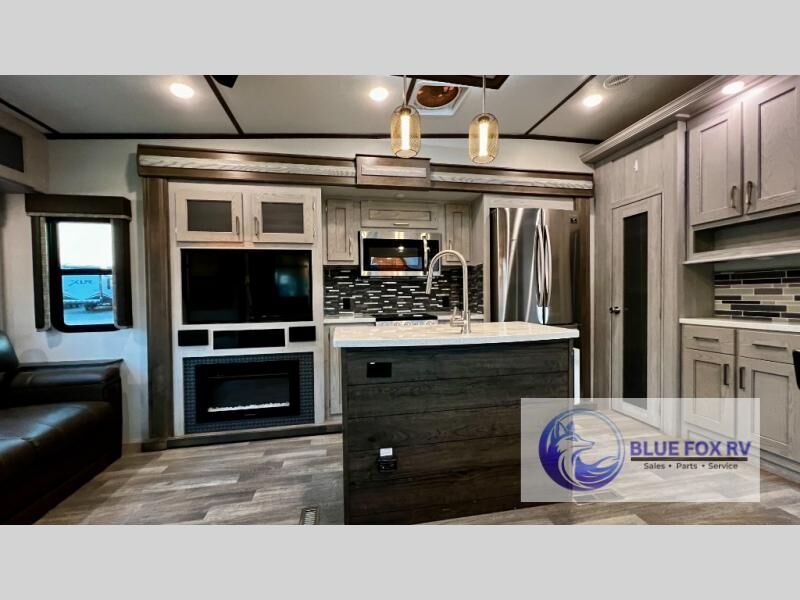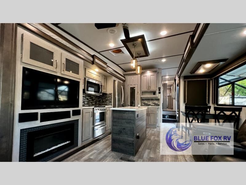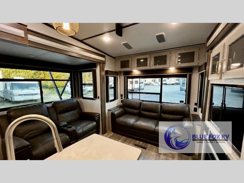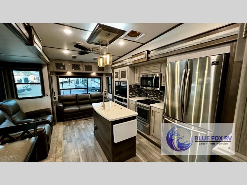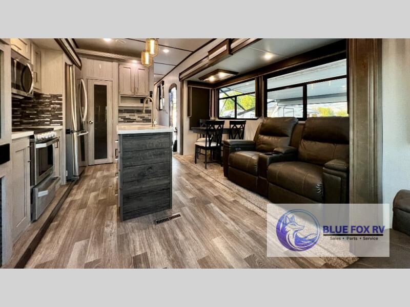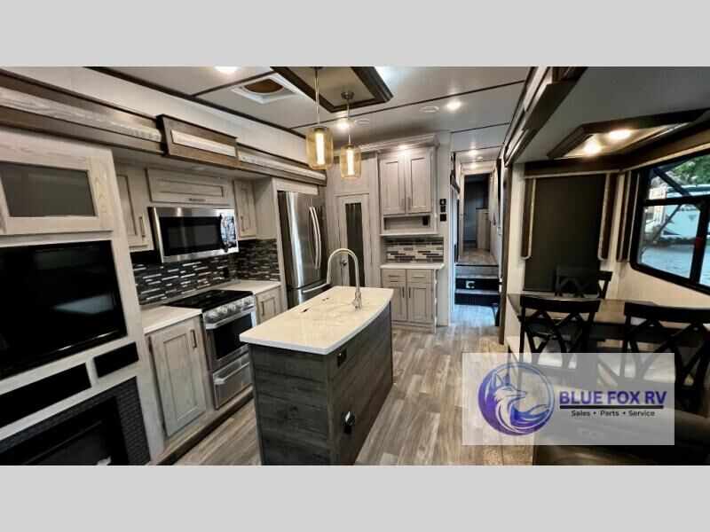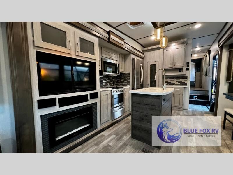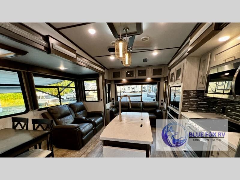 When heading out and setting up in a Keystone Montana High Country fifth wheel you will appreciate the Dexter E-Z Lube axles, Max Turn front cap and radius frame with Hitch Vision, and an enormous drop frame pass-through storage compartment to name a few features. Inside you will find luxury and comfort with the 78" tall main slide outs and flush mounted LED interior lights. The bath features a skylight over the shower, seamless countertops, and a vanity with three drawers for extra storage space!. The chef of the family is going to love the Montana High Country's kitchen with its Furrion 21" two in one stainless steel cooktop and oven, a 30" over-the-range microwave, solid surface countertops, and a high-rise faucet with an integrated pull-out sprayer, plus so much more!