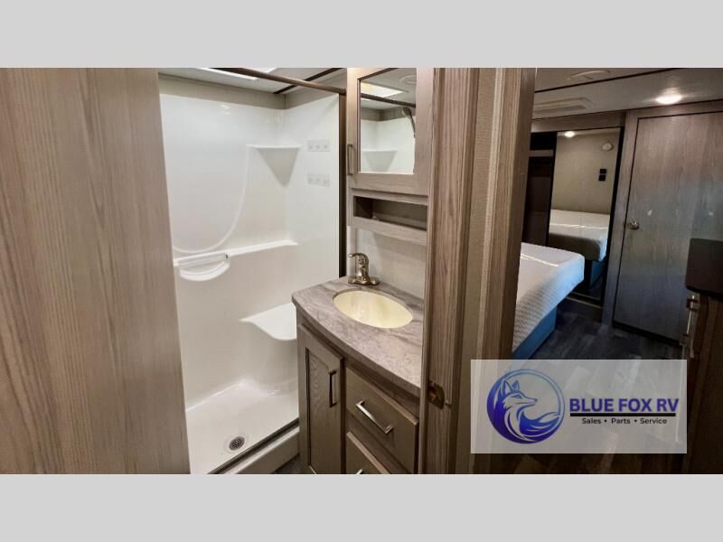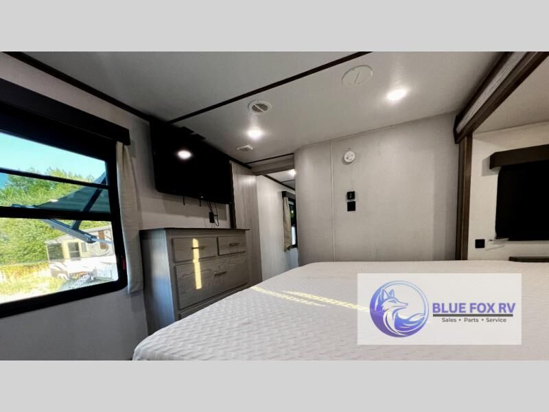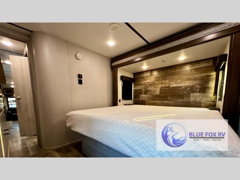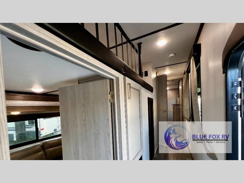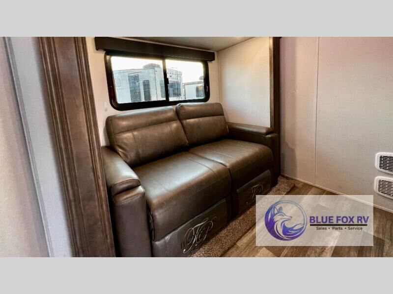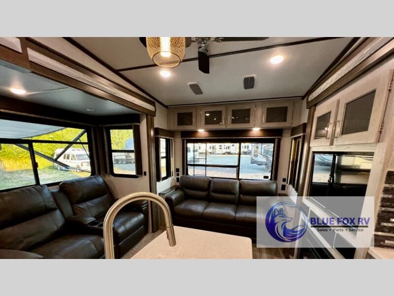 You will love the space you have throughout this fifth wheel thanks to the four slide outs. The chef of the family can prepare breakfast on the three burner cooktop or use the handy residential microwave and the outdoor kitchen will be great for dinner in the evening. The hide-a-bed sofa, power theater seating, and booth dinette will be great for relaxing after a day of hiking or biking and the full bath includes a shower with a seat to easily clean up. This unit features a front master suite plus a mid bunk room with a loft above, allowing you to sleep up to ten people!