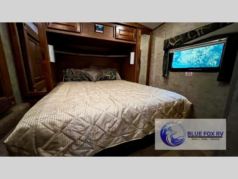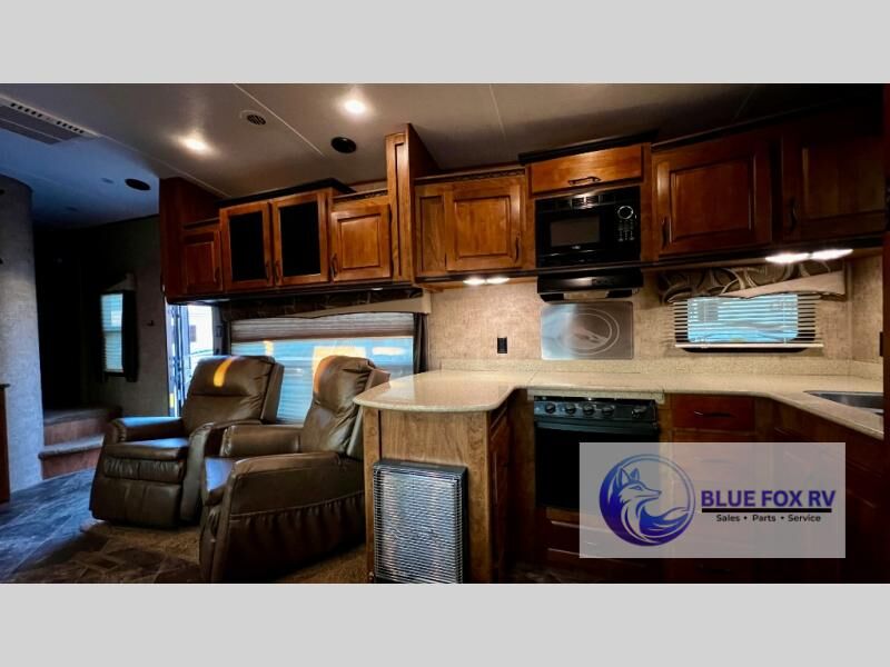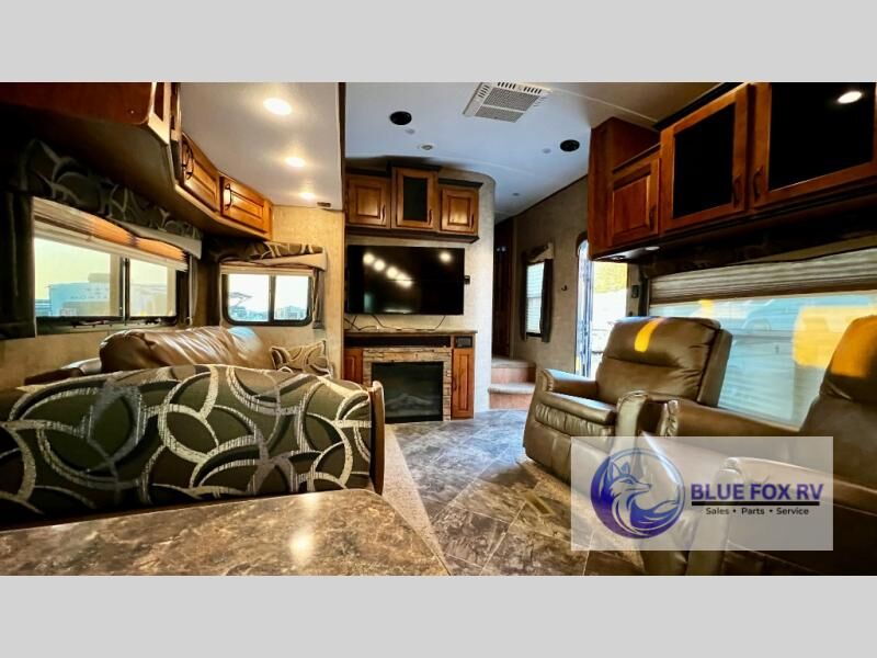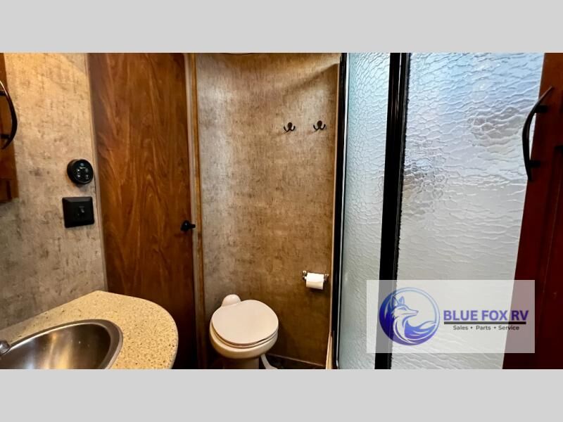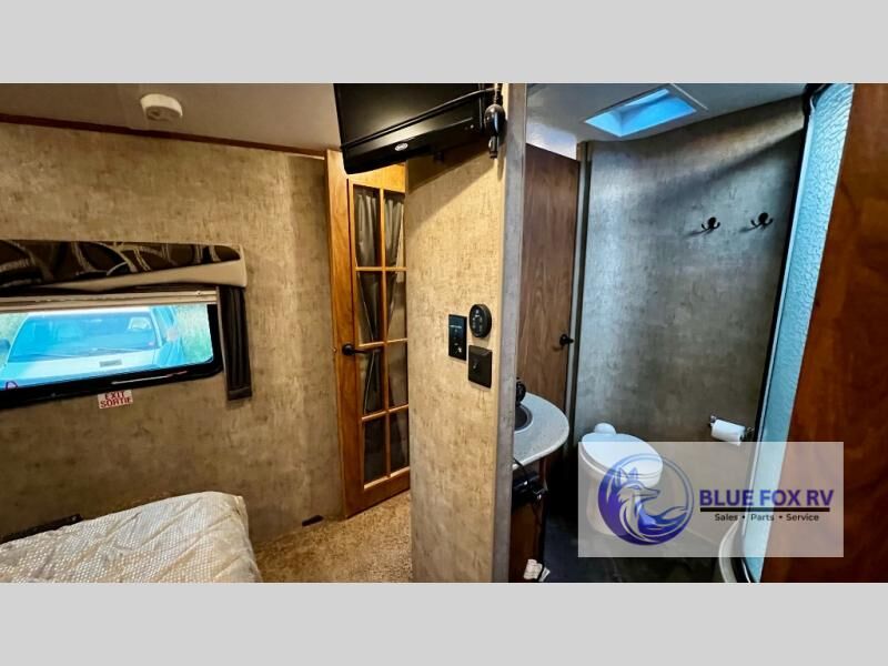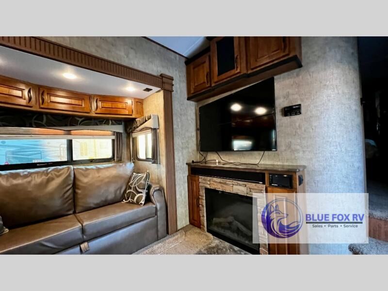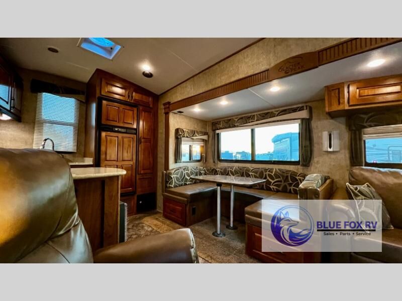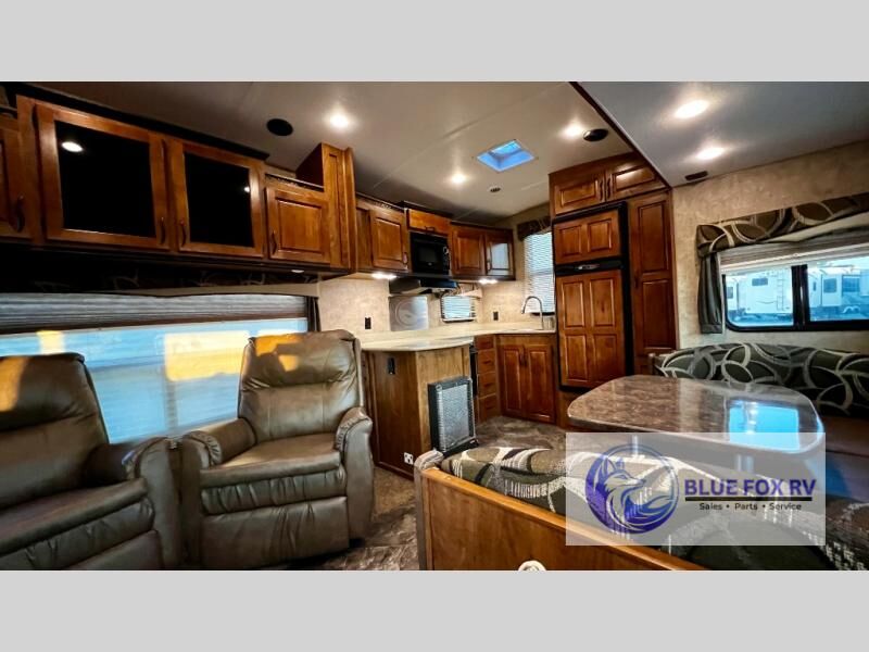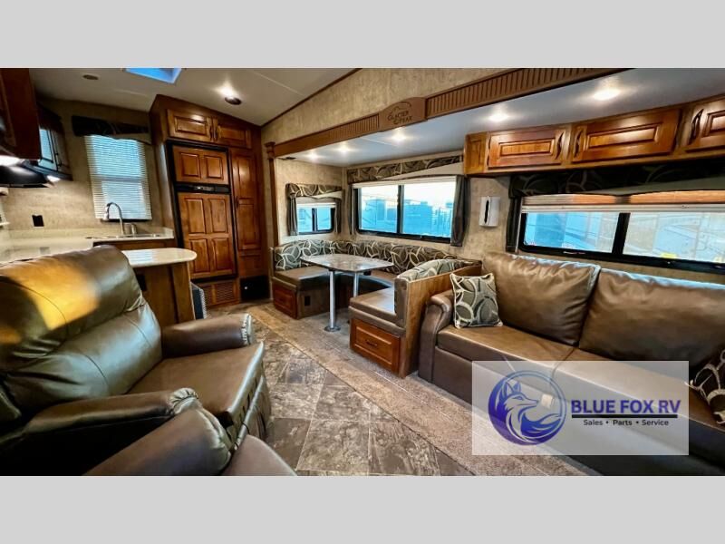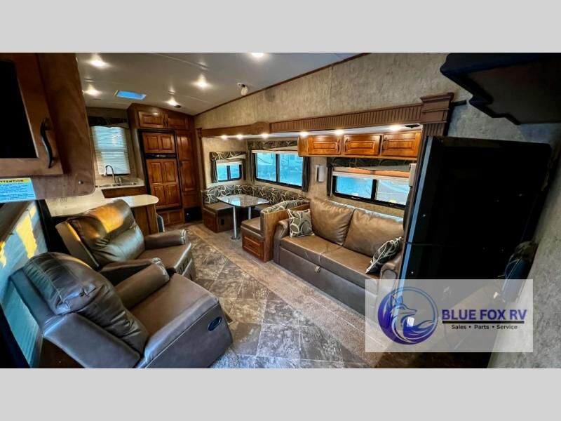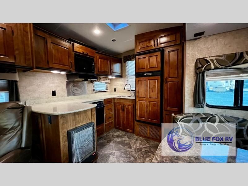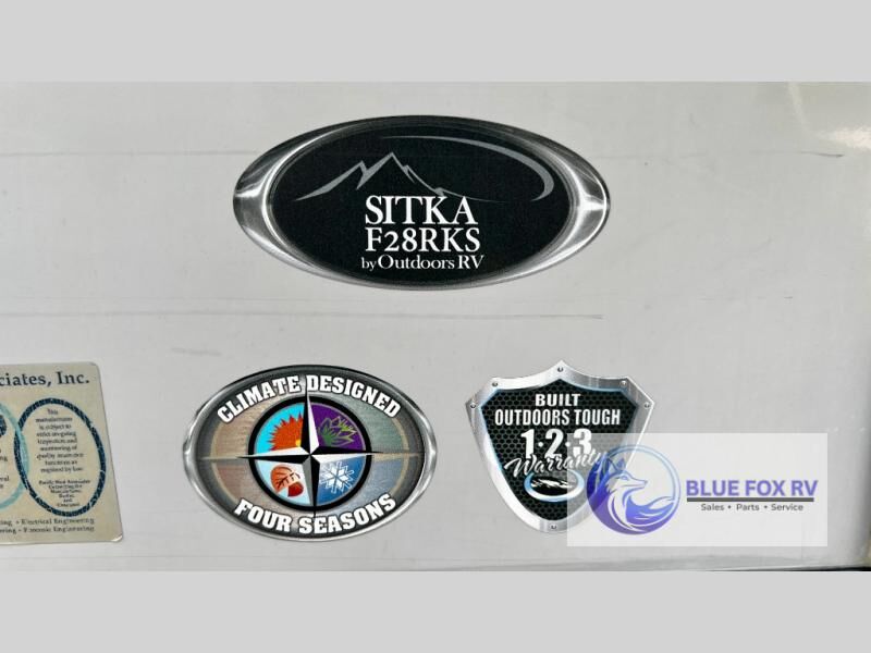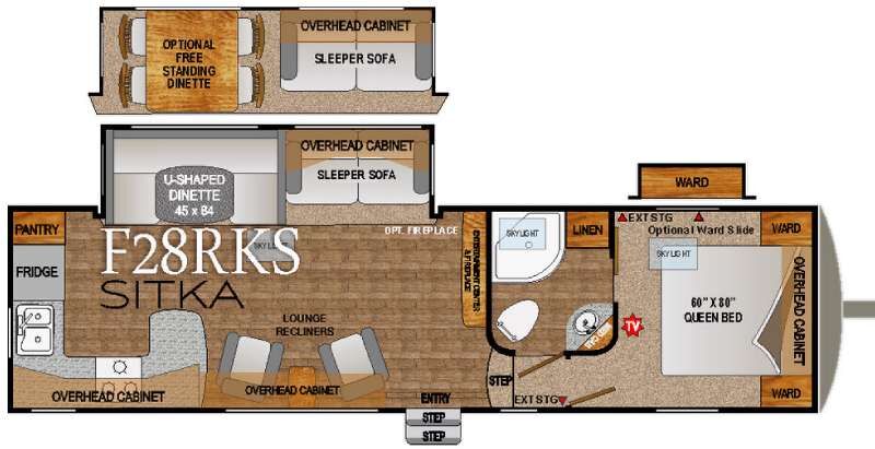 Enter Sitka model F28RKS and see a large slide out sleeper sofa and u-shaped dinette with overhead storage above the sofa. A skylight is in front of the slide providing plenty of natural light inside. There is a nearby entertainment center which features a 42" Vizio TV, plus you can choose to add an optional fireplace if you like.