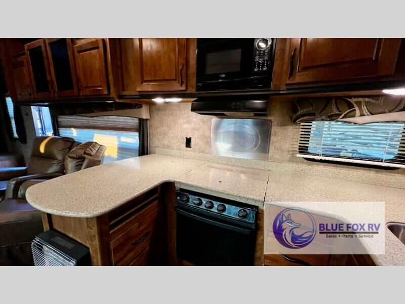 Next to the recliners begins a u-shaped counter area in the rear kitchen. There is a three burner range along the door side wall, and around the corner a double sink, refrigerator, and a pantry for storage. There are plenty of overhead cabinets, plus lower cupboards and drawer space too.