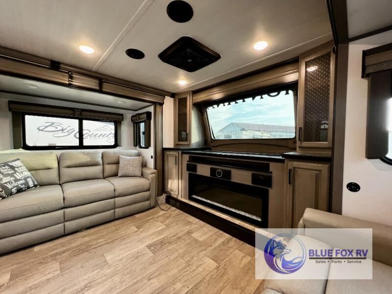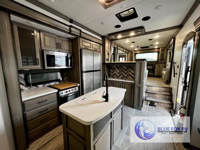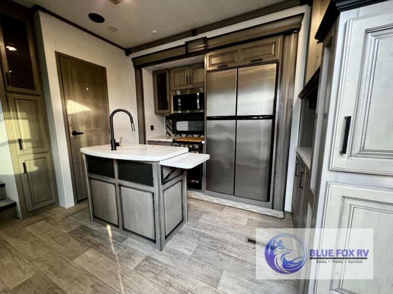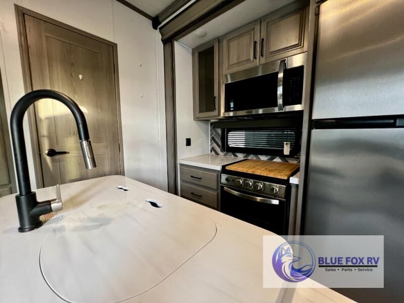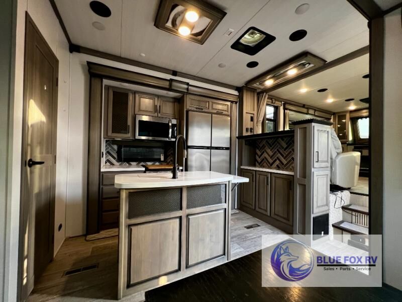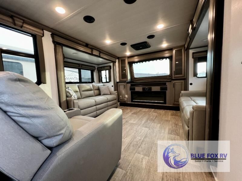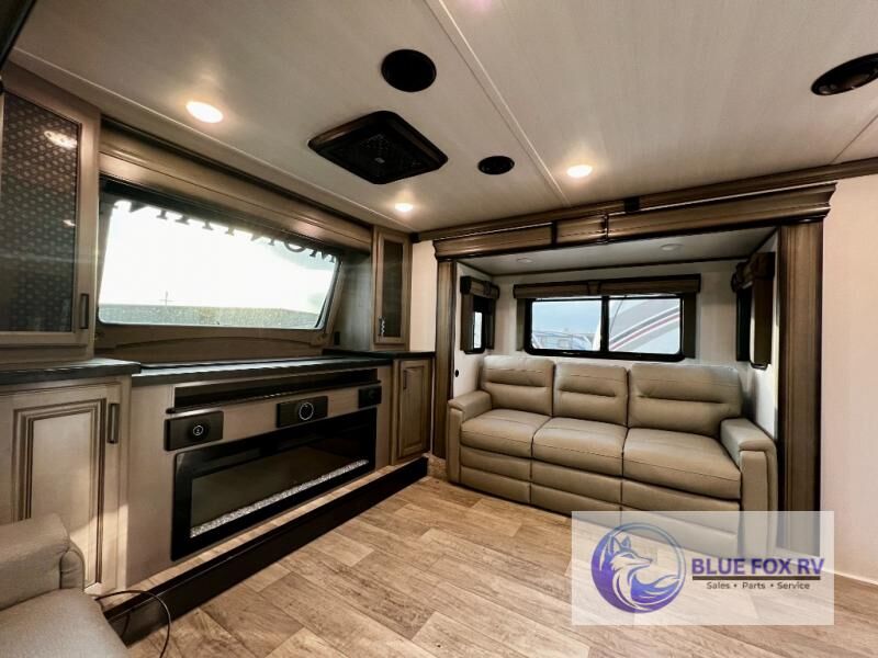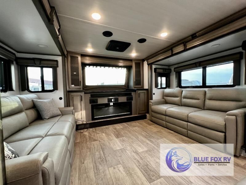 Life will be easier at the campground in this fifth wheel with a bath and a half! The full rear bathroom has a 48" x 30" fiberglass shower with a seat and skylight above, a linen closet to keep your towels close, a dual sink vanity for two to get ready at once, and a barn door to close off the master suite. The bedroom also has a king bed slide with storage underneath across from a dresser with a 32" Smart TV and wardrobe, as well as a large closet that is prepped to add an optional washer and dryer. The chef can prepare their best meals with the kitchen island, the glass top range with convection microwave and range hood with a pull-down spice rack, plus there is a pantry/buffet and a free standing legless dinette to enjoy your meals at. The front living area will have you feeling right at home with the front entertainment center that has a telescoping 50" Smart TV, a 5,000 BTU decorative fireplace heater, and storage on either side. There is also opposing hide-a-bed sofa slides for extra sleeping spaces and power Thomas Payne theater seating for even more comfort!