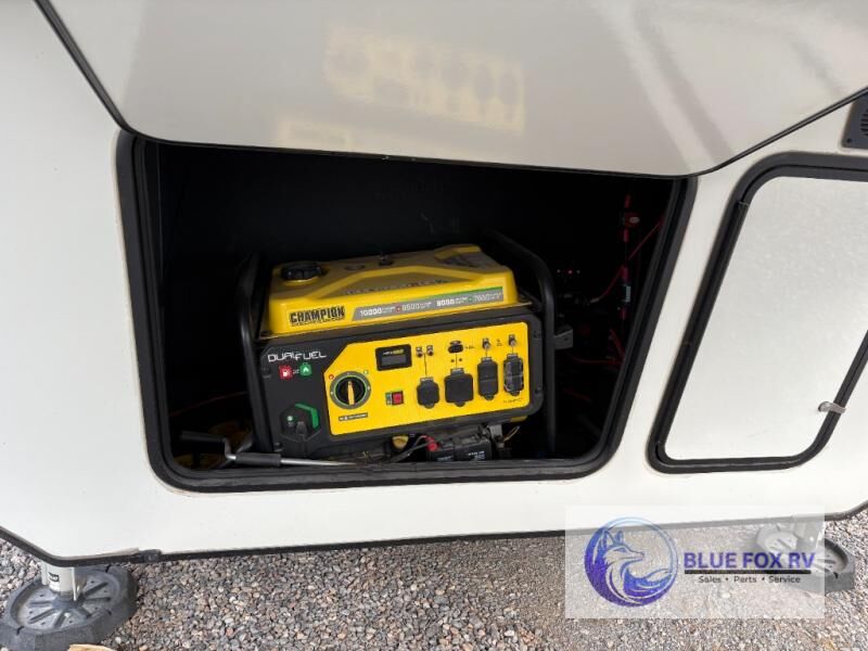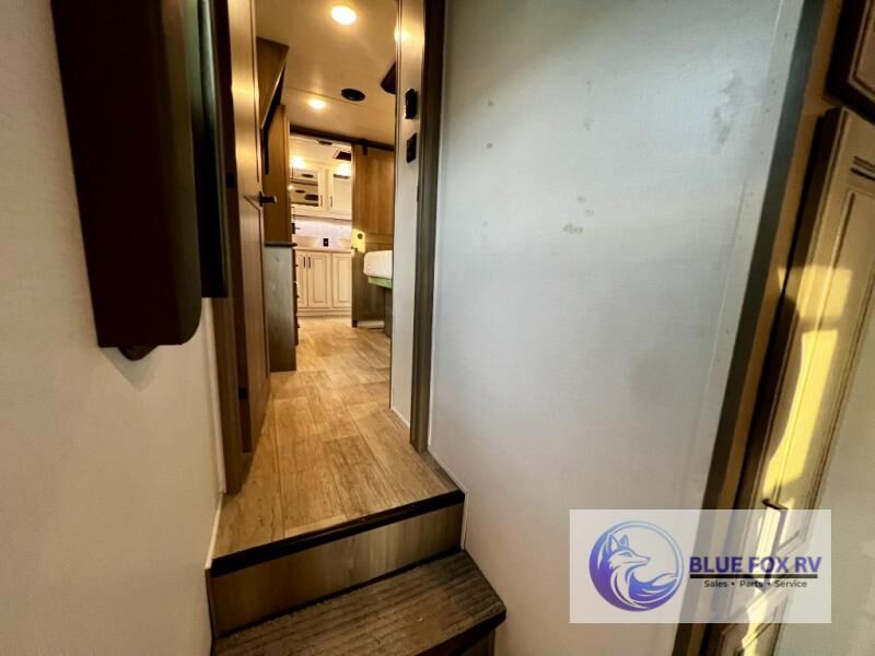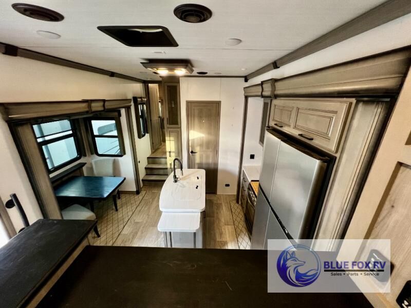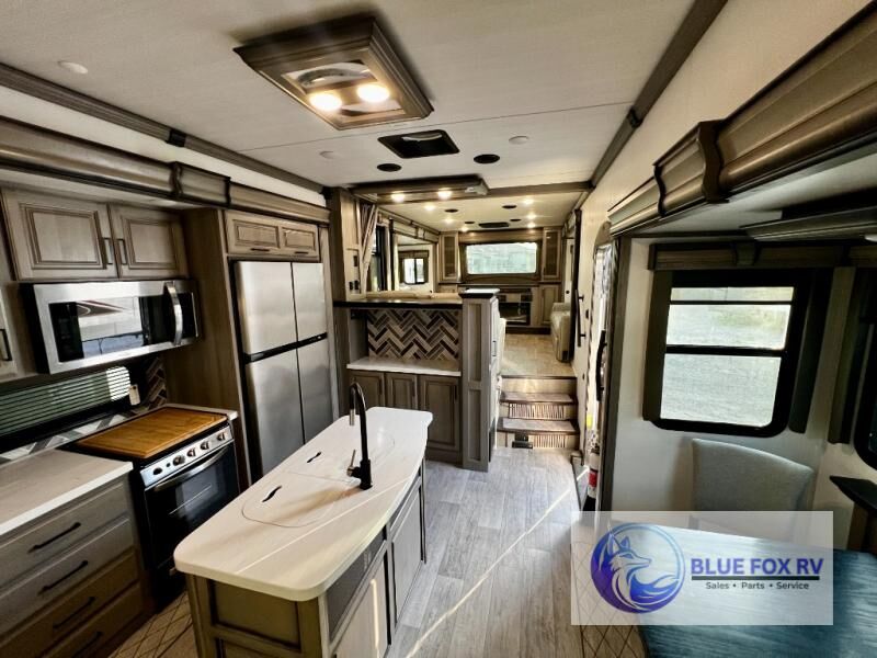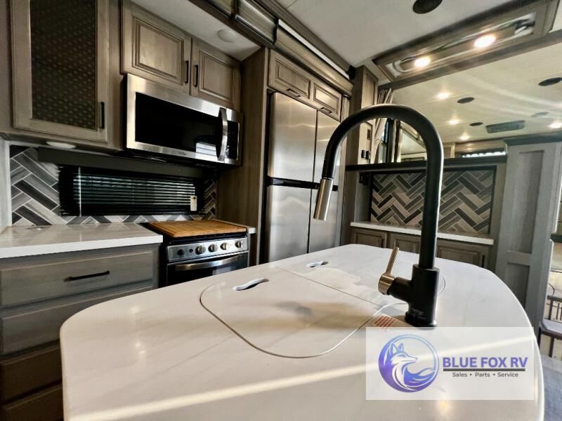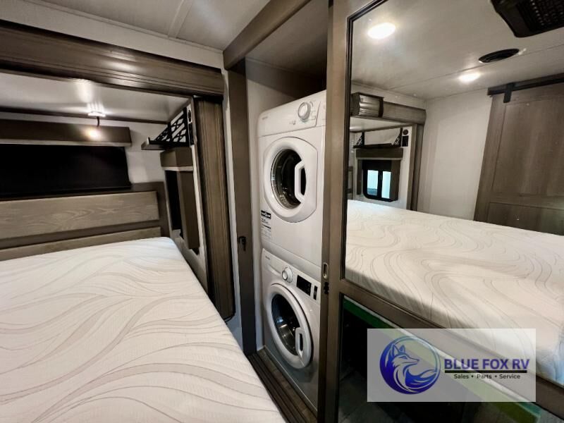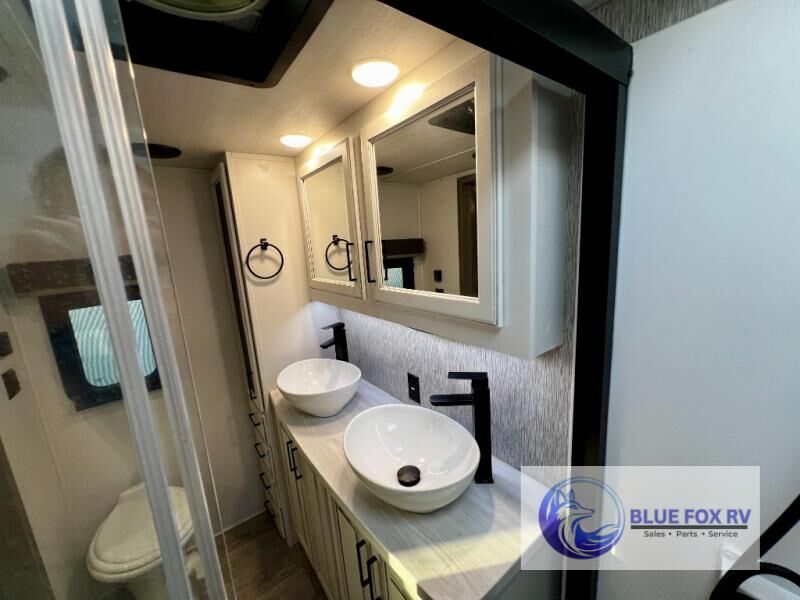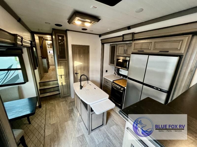 Life will be easier at the campground in this fifth wheel with a bath and a half! The full rear bathroom has a 48" x 30" fiberglass shower with a seat and skylight above, a linen closet to keep your towels close, a dual sink vanity for two to get ready at once, and a barn door to close off the master suite. The bedroom also has a king bed slide with storage underneath across from a dresser with a 32" Smart TV and wardrobe, as well as a large closet that is prepped to add an optional washer and dryer. The chef can prepare their best meals with the kitchen island, the glass top range with convection microwave and range hood with a pull-down spice rack, plus there is a pantry/buffet and a free standing legless dinette to enjoy your meals at. The front living area will have you feeling right at home with the front entertainment center that has a telescoping 50" Smart TV, a 5,000 BTU decorative fireplace heater, and storage on either side. There is also opposing hide-a-bed sofa slides for extra sleeping spaces and power Thomas Payne theater seating for even more comfort!