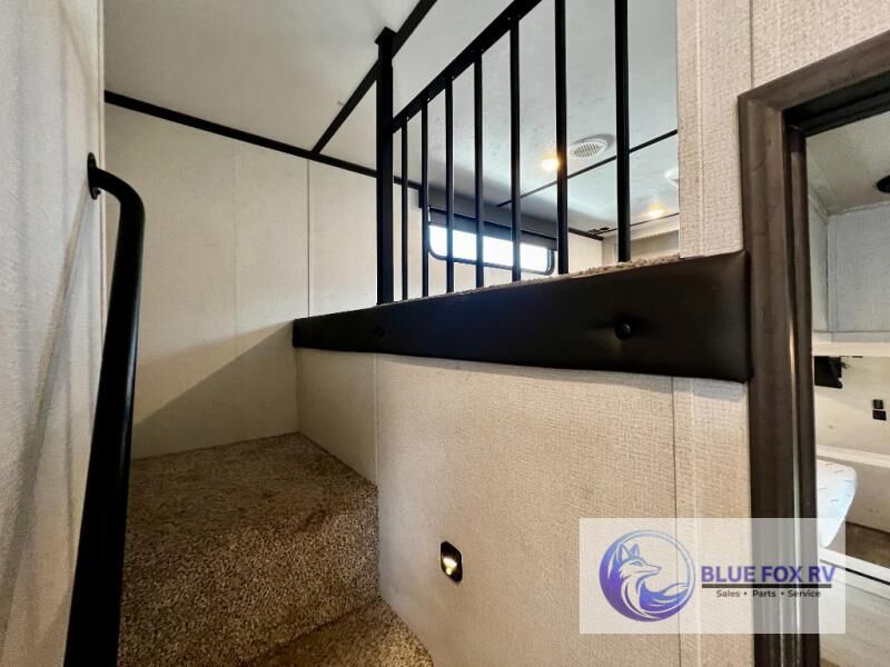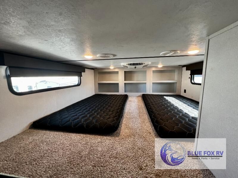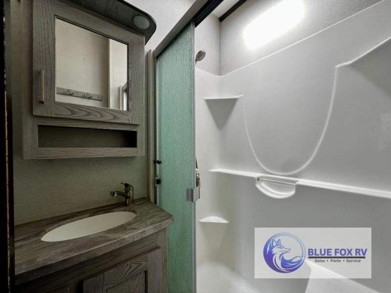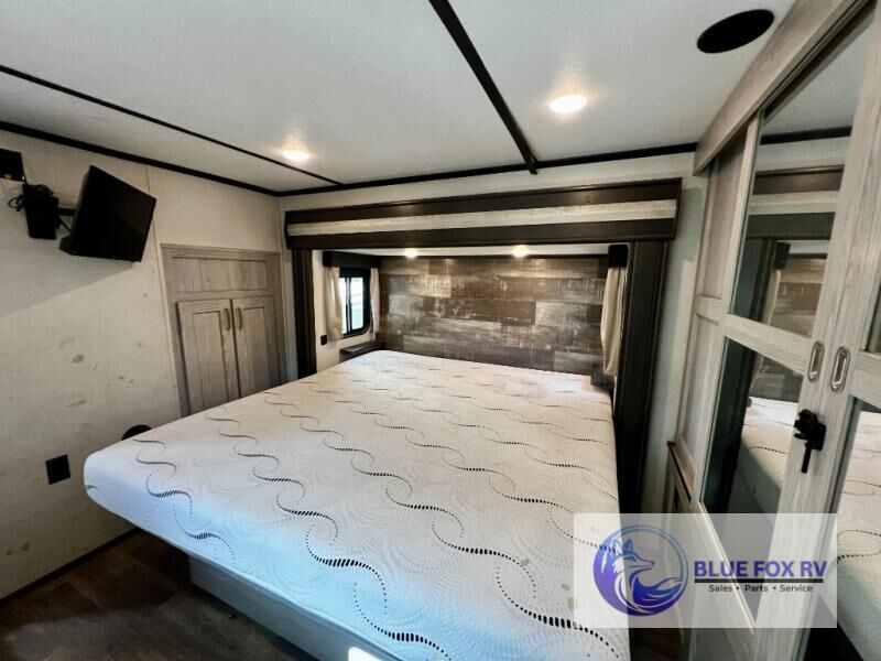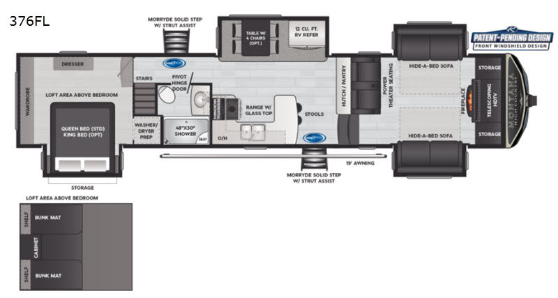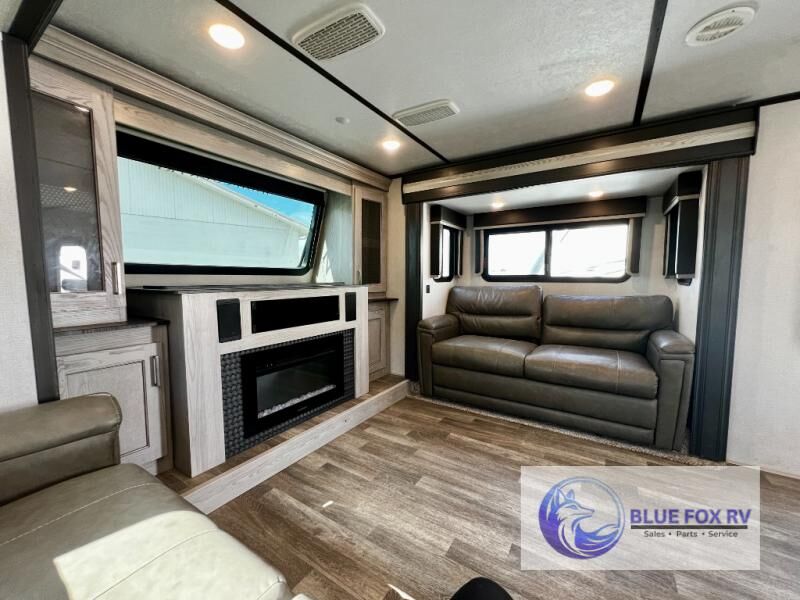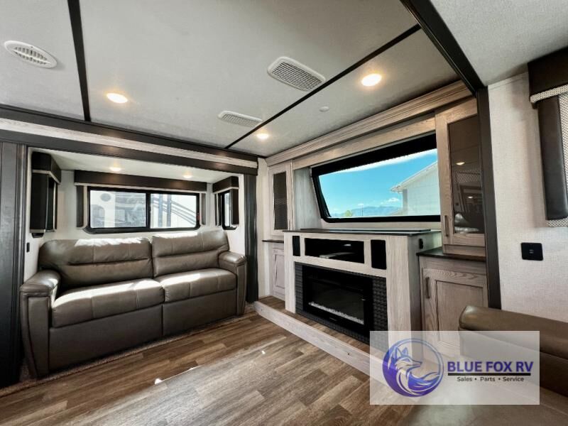 Your family will love this fifth wheel with a loft area over the rear master bedroom and the front living area which includes an entertainment center with a telescoping TV and a fireplace, a front windshield for great views, and dual opposing slides that open up the whole room for added comfort. Your guests can convert the two hide-a-bed sofas at night and you and your spouse will enjoy the rear private bedroom with a slide out queen bed. Let the chef of the family prepare breakfast on the three burner cooktop and the eggs and milk can go back in the 13 cu. ft. Dometic refrigerator. This model also features unique dual entry doors on opposite sides of the unit for added convenience, and you might like to add a few options such as a washer/dryer and a free-standing table with chairs.