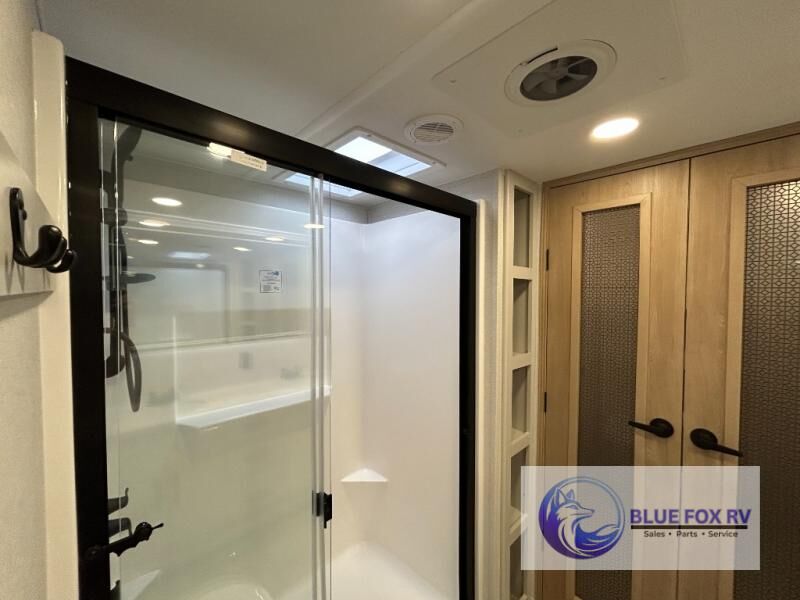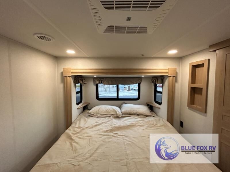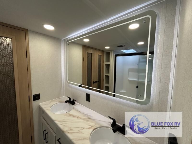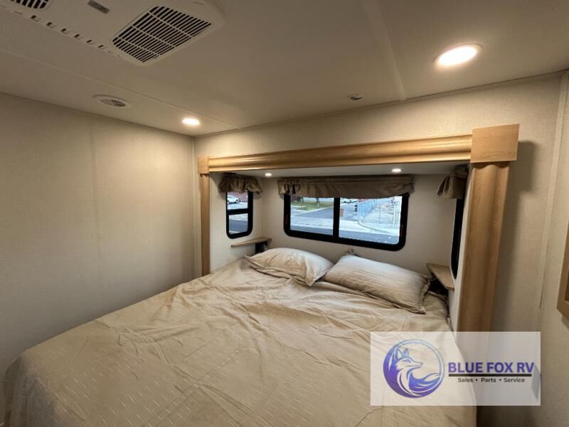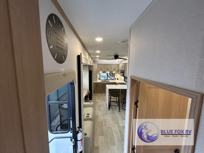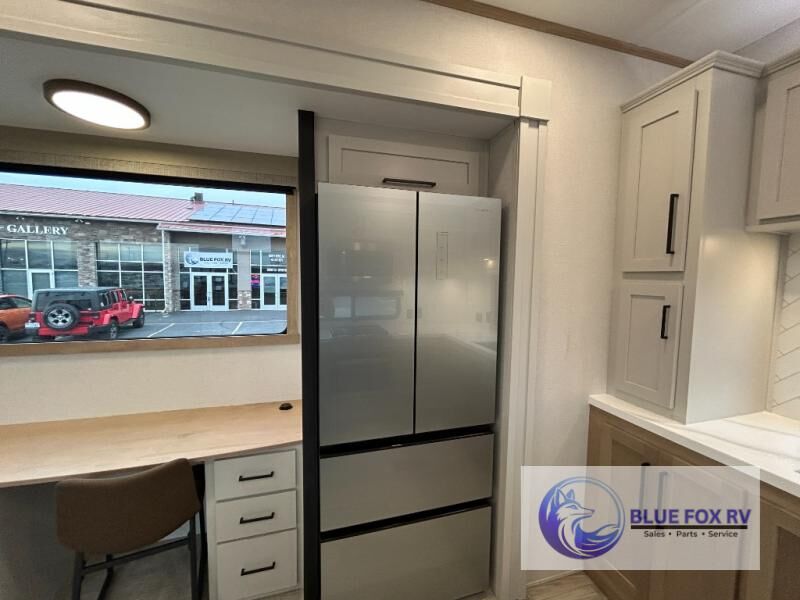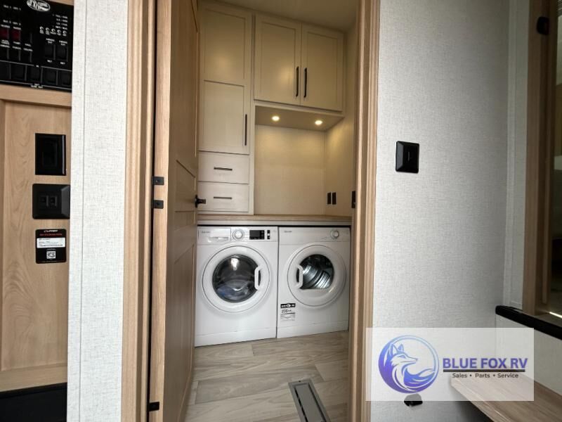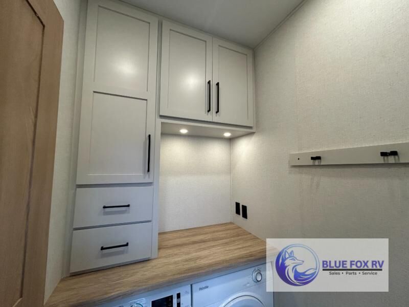 This fifth wheel is packed with convenient features to make your travels more comfortable and enjoyable! The master bedroom includes a king bed slide out with USB ports on either side of the bed so you both can charge your phones, and there is a dresser for your folded clothes. You will love the front bathroom with dual bath sinks, a fiberglass one-piece shower, plus a walk-in closet with shelves and rods to hang clothes! There is a unique middle utility room with washer and dryer prep if you want to add these, a Washer and dryer counter and a rod to hang clothes that will make a perfect laundry room, or you can utilize this space for storage! Head to the main living area to relax on the theater seating or hide-a-bed sofa, and if you have guests stay over, they can sleep here. There is also an entertainment center with a 50" flat screen TV, but you might just leave that off if you're working at the desk with a chair that is provided. We've saved the best part for last, the kitchen! Here, you'll find ample counter space to prep home-cooked meals, a three-burner range with a 24" oven, plus a large counter with barstools where you can enjoy breakfast at each morning. Choosing this fifth wheel is a no-brainer!