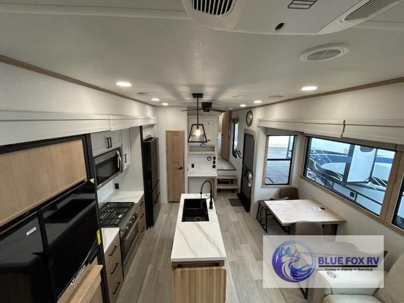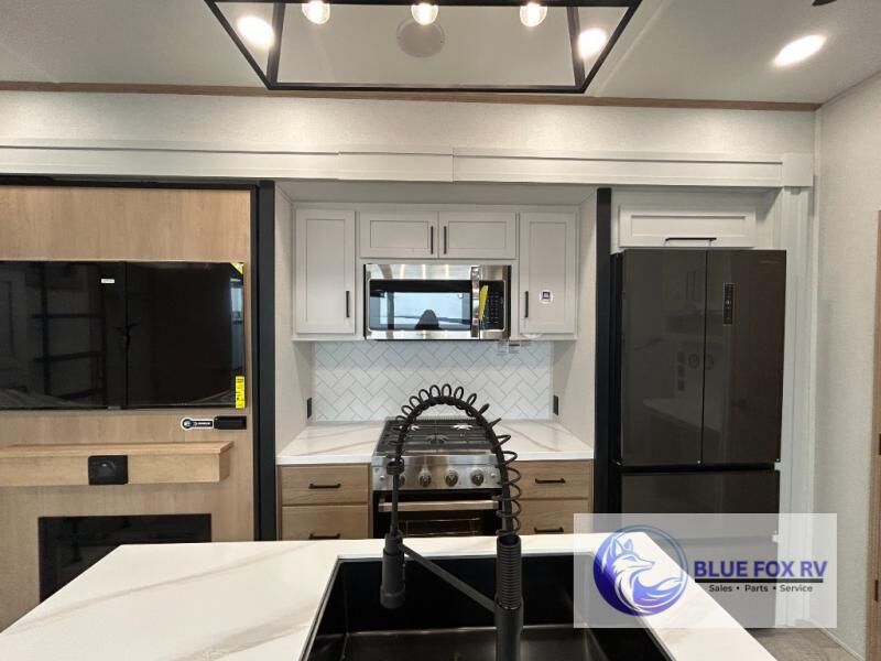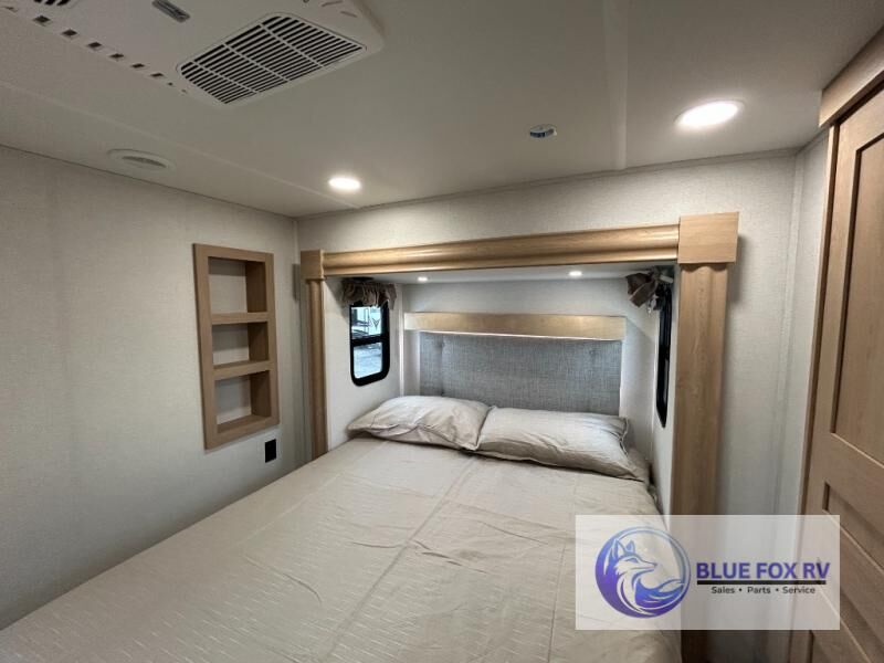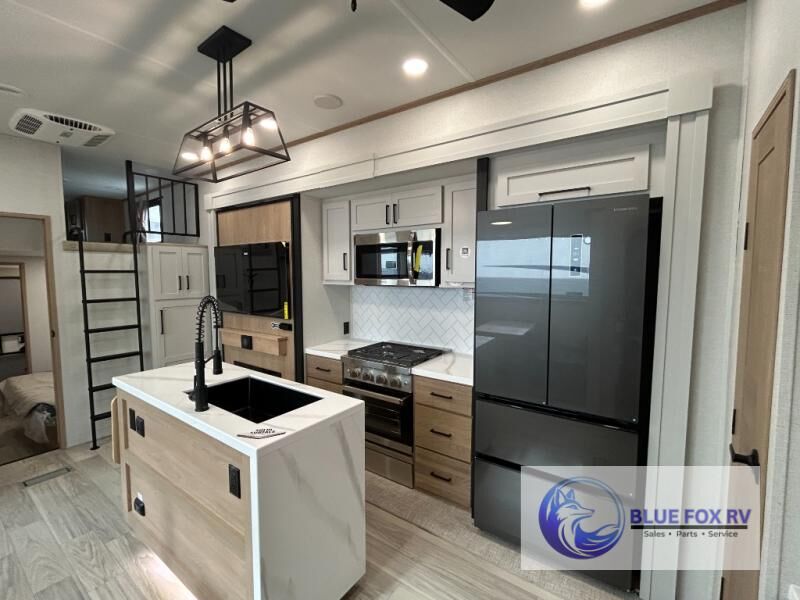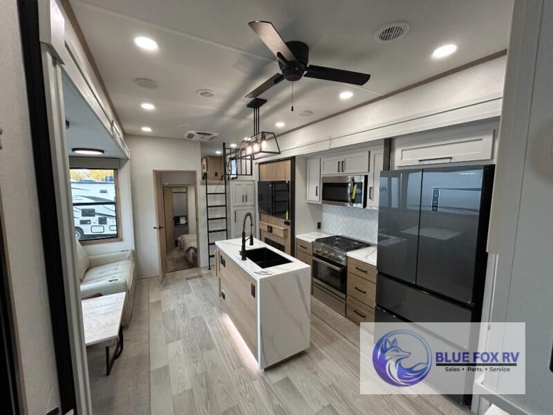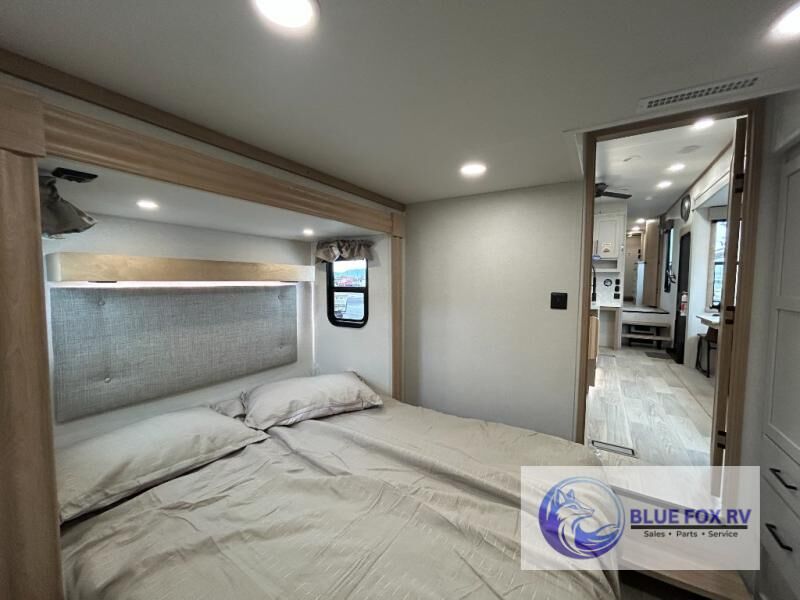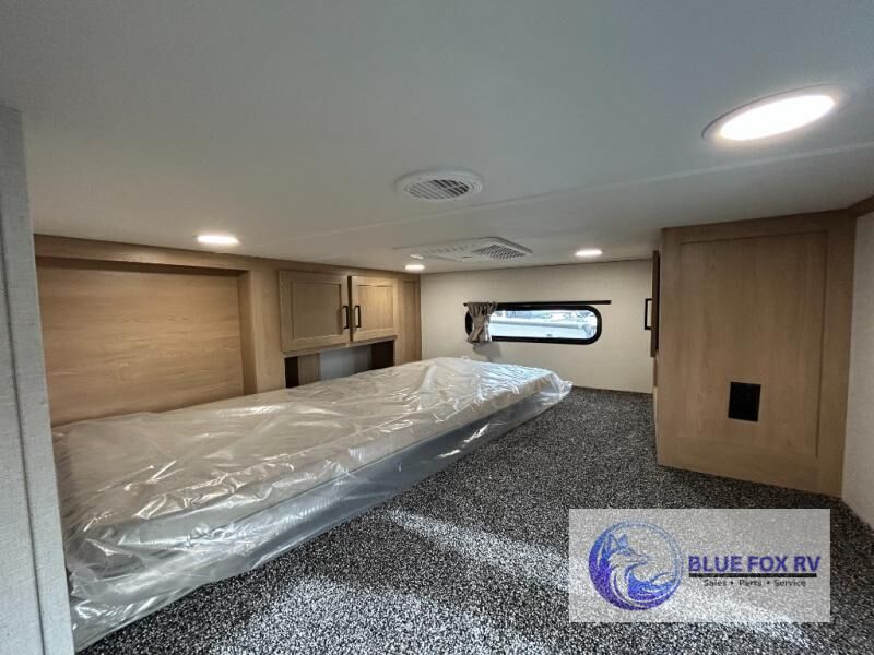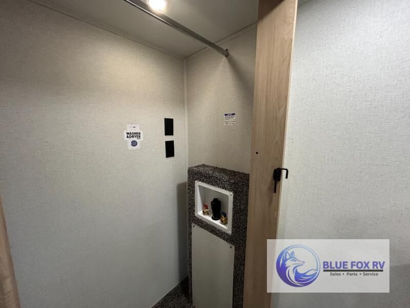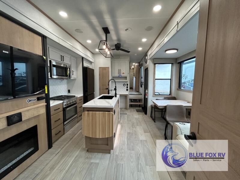 Enjoy a home on wheels with this fifth wheel! There are two bedrooms to choose from plus an upper loft with two 32" x 74" bunk mats, cabinets, and TV prep. The front private bedroom has a queen bed slide across from a dresser and next to a front wardrobe that is prepped to add an optional washer and dryer. The second bedroom has a queen bed slide across from a dresser with wardrobes on either side, plus it's very own full rear bathroom which has a tub and a rear entry/exit door to the unit. The second full bathroom has a one-piece fiberglass shower so everyone can get ready quickly in the morning. Prepare your best home cooked meals with the kitchen island and three burner cooktop then enjoy it at the free-standing dinette. Relax in true comfort each night in the theater seating across from the fireplace and 50" TV at the entertainment center!