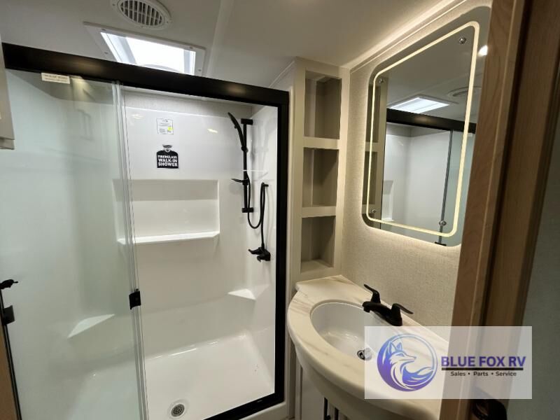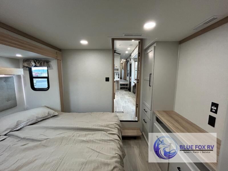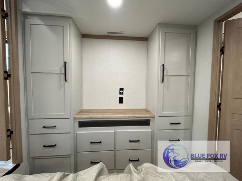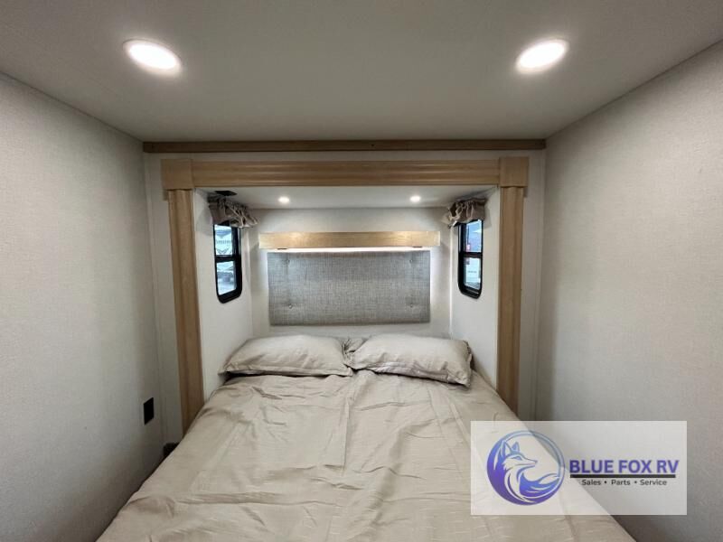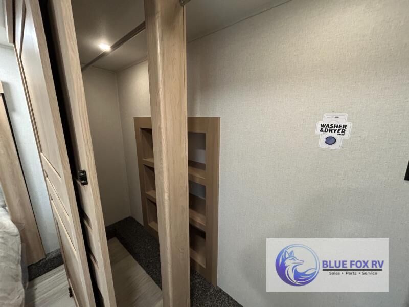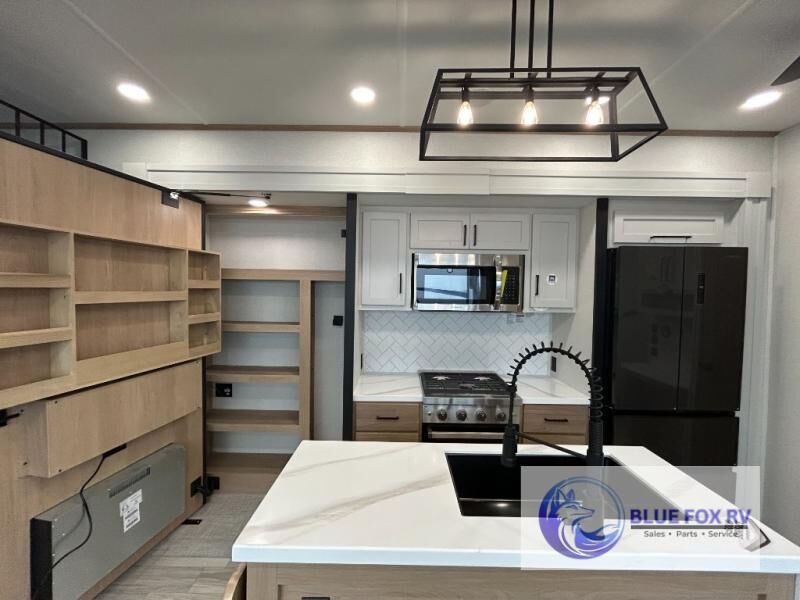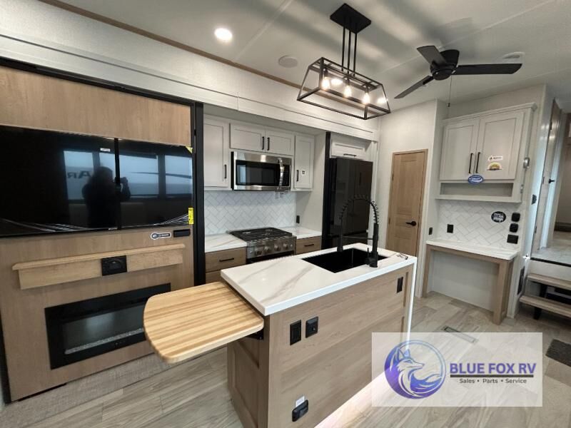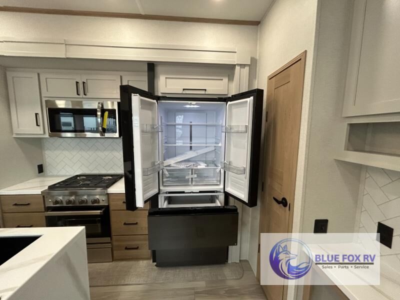 Enjoy a home on wheels with this fifth wheel! There are two bedrooms to choose from plus an upper loft with two 32" x 74" bunk mats, cabinets, and TV prep. The front private bedroom has a queen bed slide across from a dresser and next to a front wardrobe that is prepped to add an optional washer and dryer. The second bedroom has a queen bed slide across from a dresser with wardrobes on either side, plus it's very own full rear bathroom which has a tub and a rear entry/exit door to the unit. The second full bathroom has a one-piece fiberglass shower so everyone can get ready quickly in the morning. Prepare your best home cooked meals with the kitchen island and three burner cooktop then enjoy it at the free-standing dinette. Relax in true comfort each night in the theater seating across from the fireplace and 50" TV at the entertainment center!
