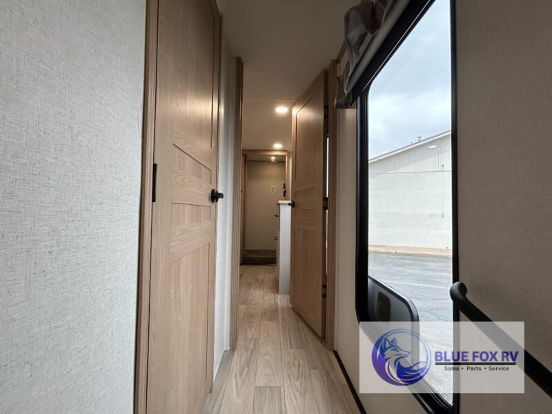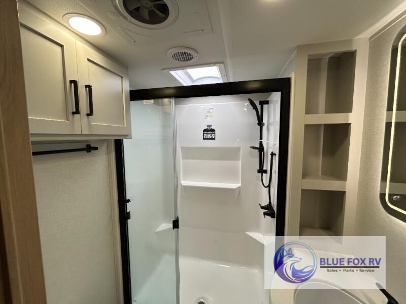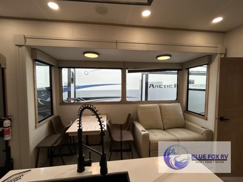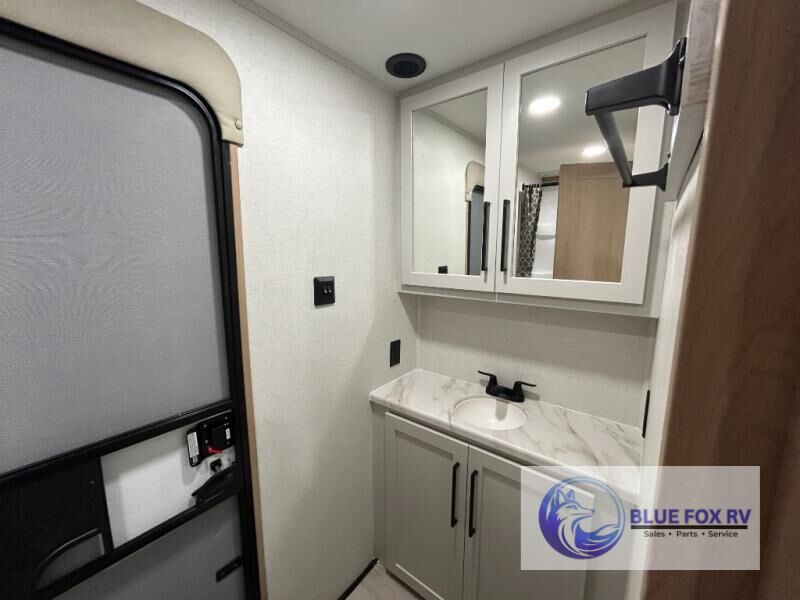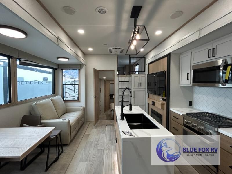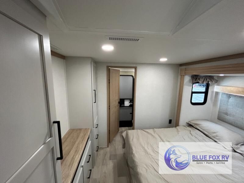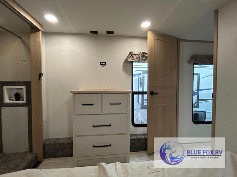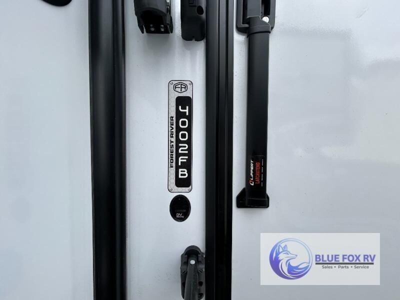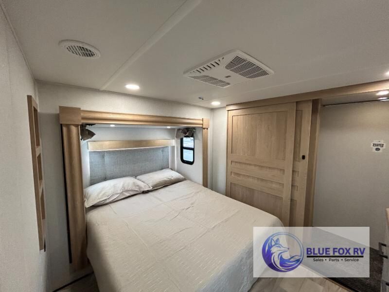Enjoy a home on wheels with this fifth wheel! There are two bedrooms to choose from plus an upper loft with two 32" x 74" bunk mats, cabinets, and TV prep. The front private bedroom has a queen bed slide across from a dresser and next to a front wardrobe that is prepped to add an optional washer and dryer. The second bedroom has a queen bed slide across from a dresser with wardrobes on either side, plus it's very own full rear bathroom which has a tub and a rear entry/exit door to the unit. The second full bathroom has a one-piece fiberglass shower so everyone can get ready quickly in the morning. Prepare your best home cooked meals with the kitchen island and three burner cooktop then enjoy it at the free-standing dinette. Relax in true comfort each night in the theater seating across from the fireplace and 50" TV at the entertainment center!
