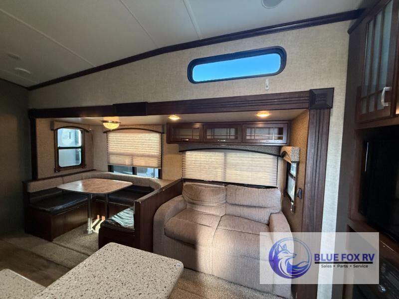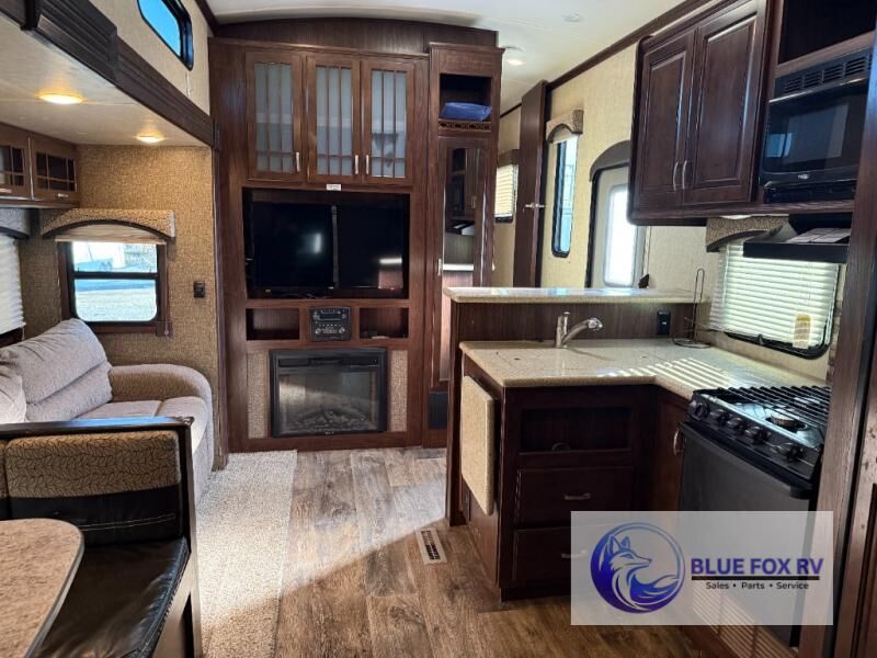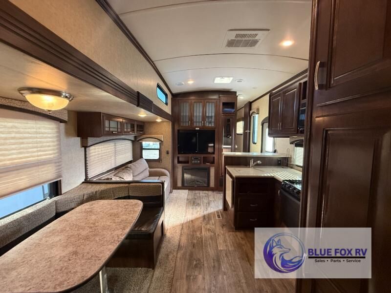 Back to the main living area you will find a combined kitchen and living room with a large slide out hide-a-bed sofa and u-shaped dinette. There is an entertainment center nearby that features storage, space for a flat screen TV, and optional fireplace below.