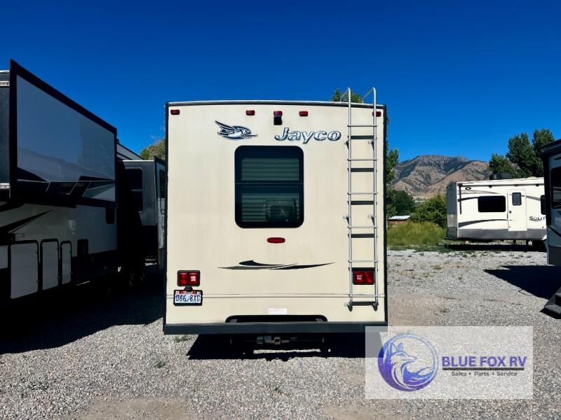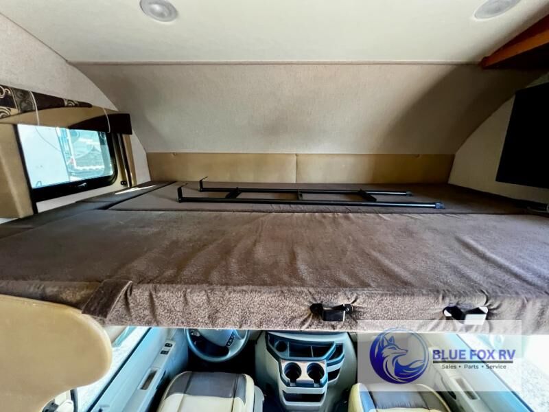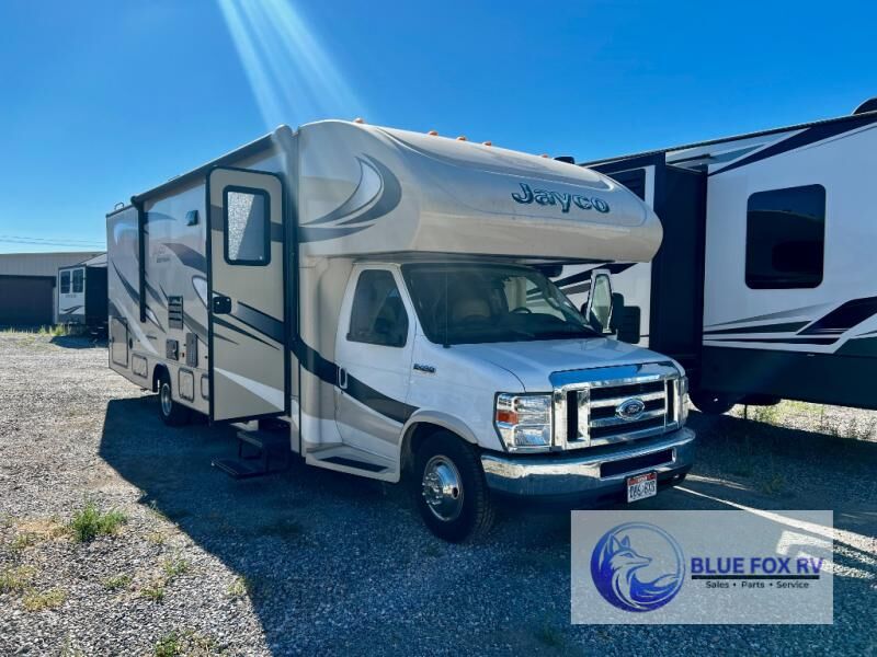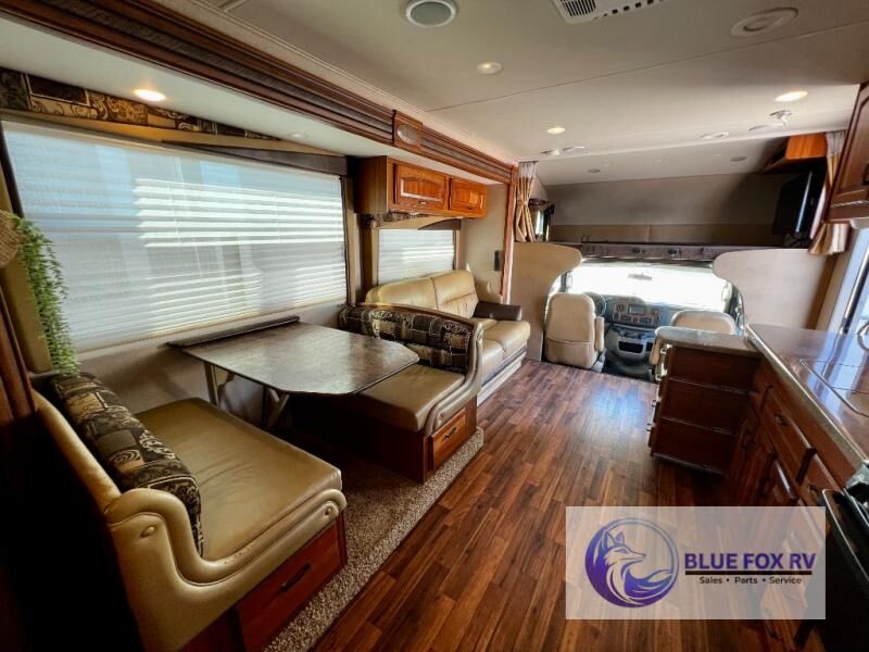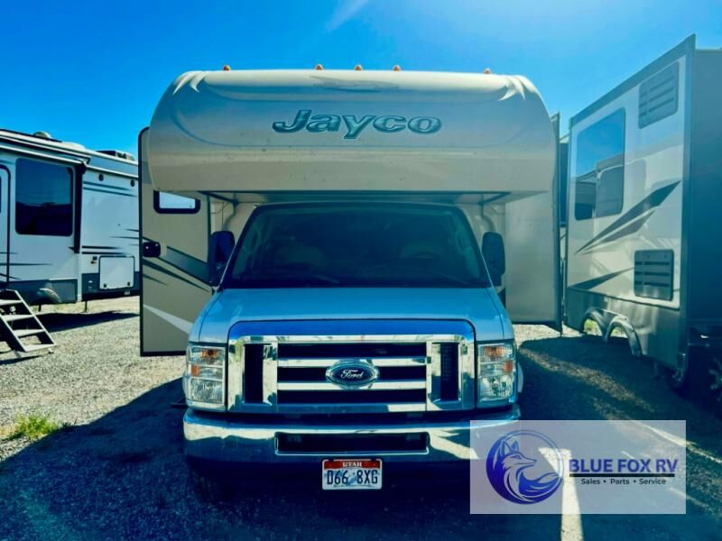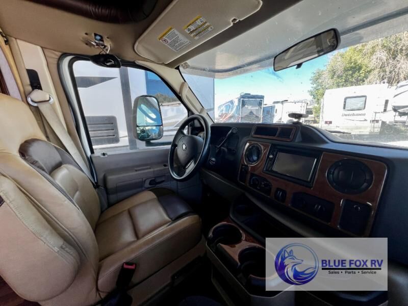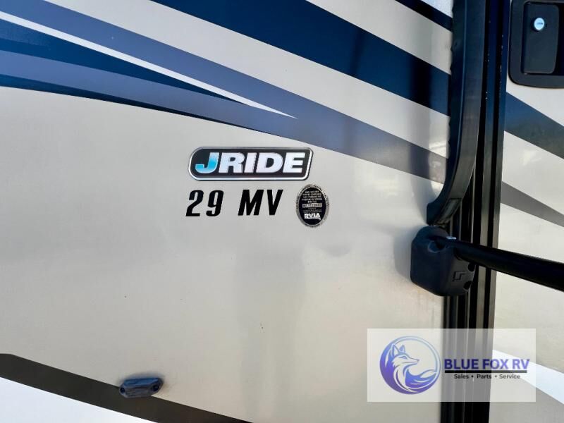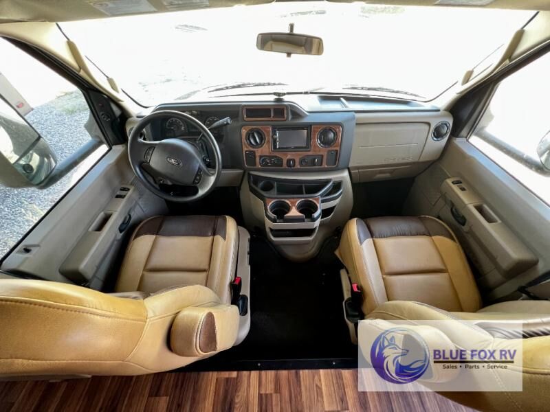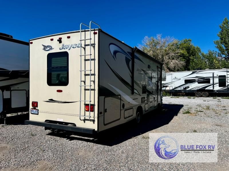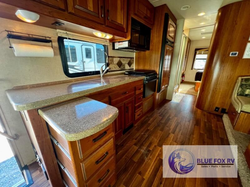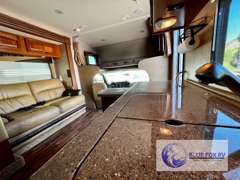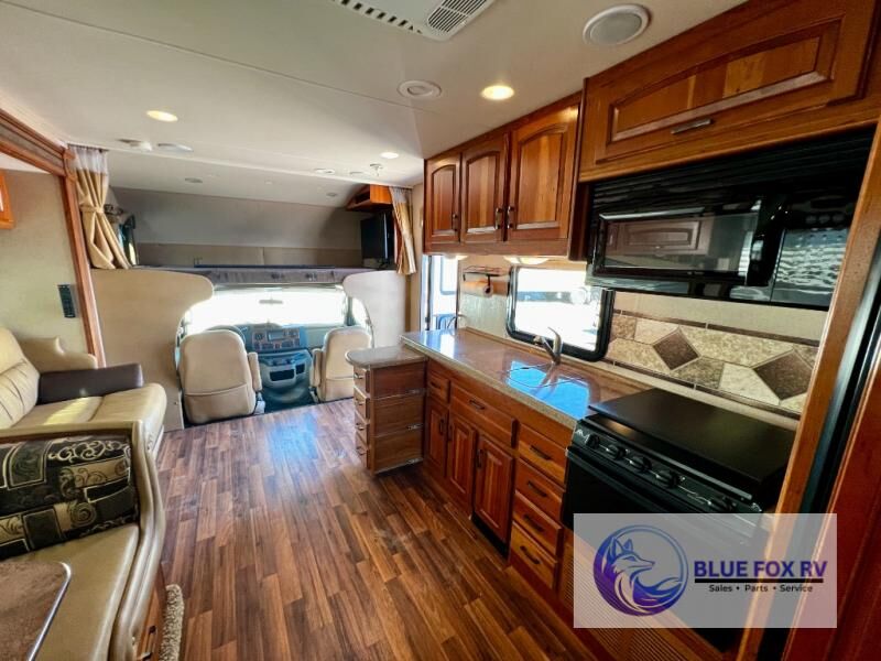 When you step inside the Greyhawk 29MV motor home by Jayco, you will be impressed with how well the floorplan space is used. To the left of the entrance there is a counter with drawers, a double kitchen sink, three burner range, microwave, refrigerator, and pantry. Behind the driver's seat you will find a sofa and dinette slide.