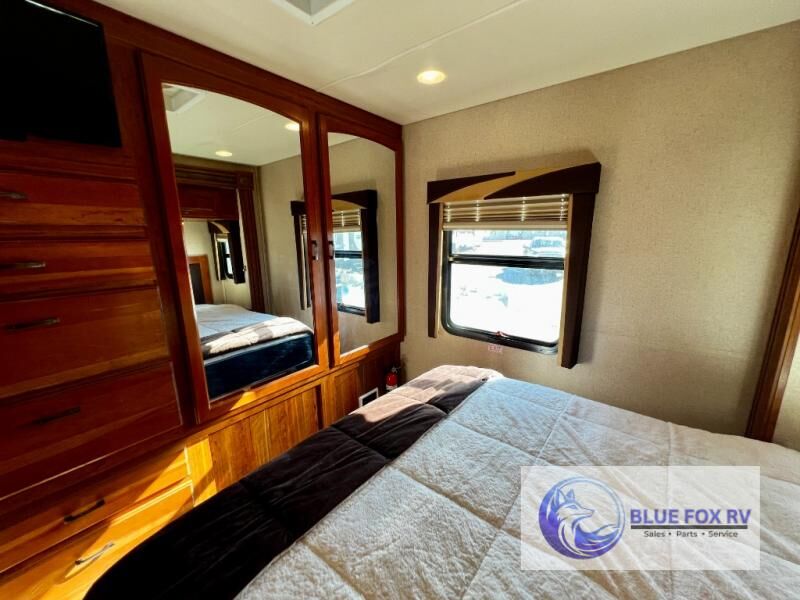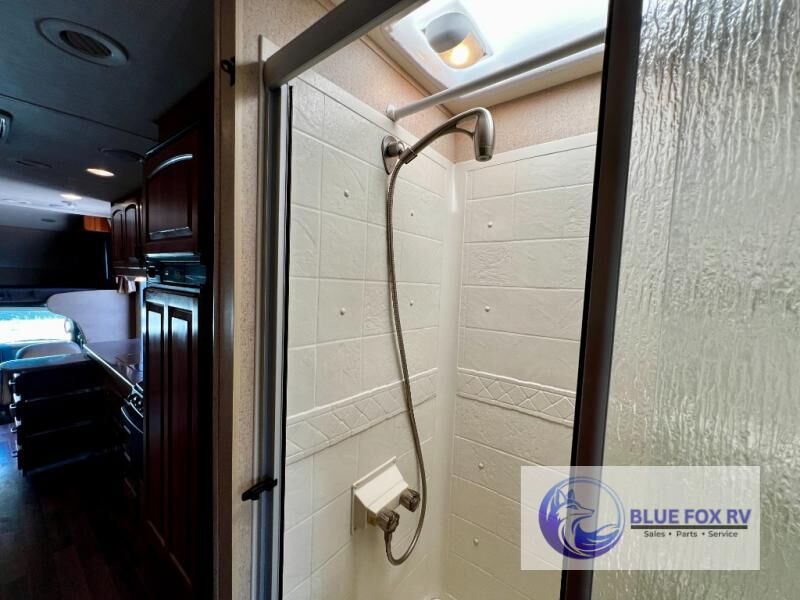 As you proceed toward the rear of the motor home, you will find that the bathroom is split, in that there is a private toilet area with a sink, and medicine cabinet. The shower is across the hallway. The rear bedroom has a queen bed and nightstands slide. There is also a wardrobe and TV cabinet in the bedroom.