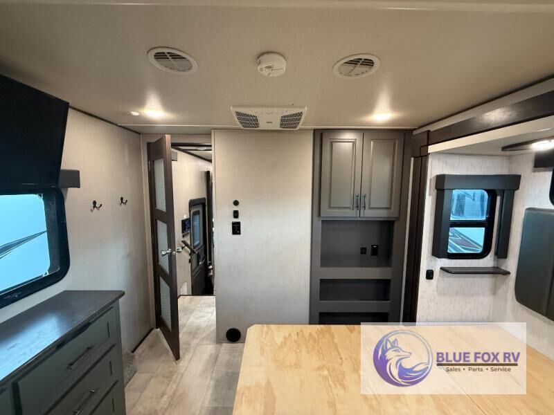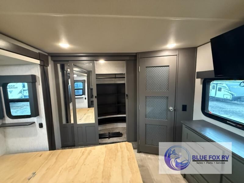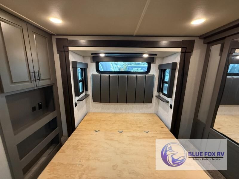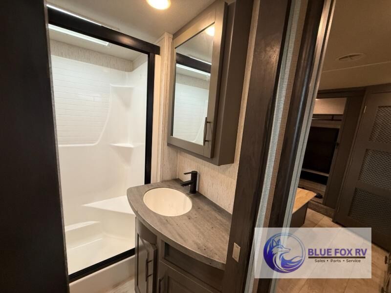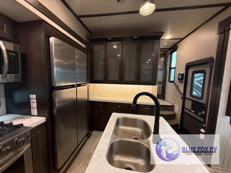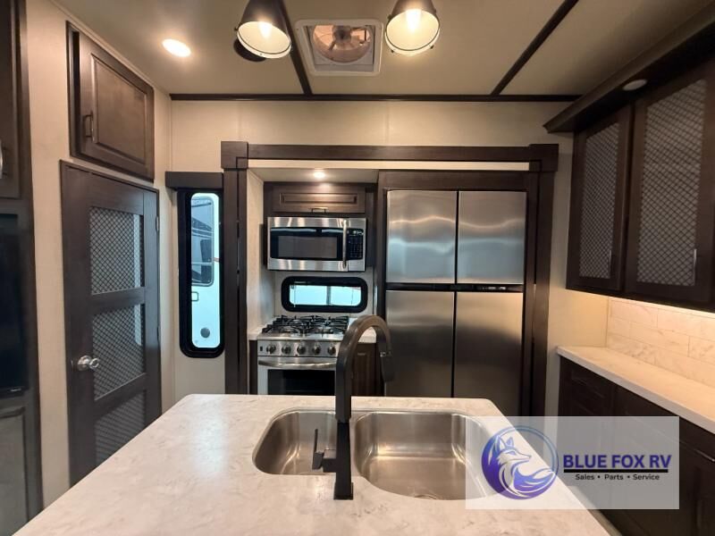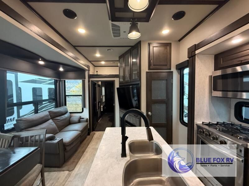 This Momentum toy hauler provides the maximum entertainment with its 49" LED TV in the living area, 32" LED TV in the private bedroom with an RV King, 32" LED TV in the 12' 6" separate garage, and exterior LED TV! You can choose to add the optional Super Sofa which will create an amazingly comfortable area to sit down across from the electric fireplace. The two full bathrooms are one of the most impressive features found on this unit, and the three power awnings are another shocking addition. Within the kitchen, you'll be able to prepare all of your family's favorite dishes when you use the chef-inspired range and oven, and the window behind the range allows you to view the campsite while you cook. If you would prefer to have a residential refrigerator, you should check out model 397TH-R!