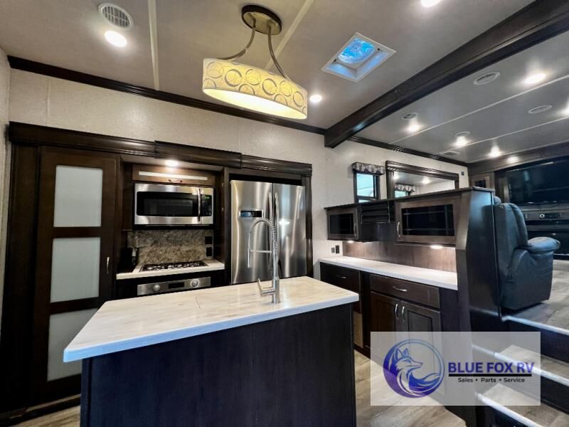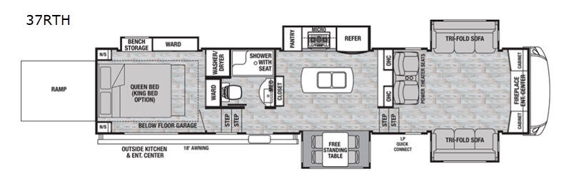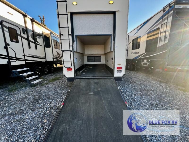 Are you ready for some time away from home where you can enjoy bringing an off-road toy to play outdoors with during the day, and then coming back to the comforts of your fifth wheel at night? Well then come check out this Cedar Creek Silverback 37RTH toy hauler fifth wheel by Forest River. You can store your dirt bikes in the garage, then lower the queen bed to get a good nigh'ts rest. You will enjoy fixing meals for your family in the large kitchen area plus there is an island with a double sink and a 18 cu. ft. stainless steel electric refrigerator for your perishables. In the evenings come relax in the comfortable front living area which features an electric fireplace and an entertainment center. One thing that this model is not lacking on is space, with five slide outs there is plenty of room for your family to camp comfortably!