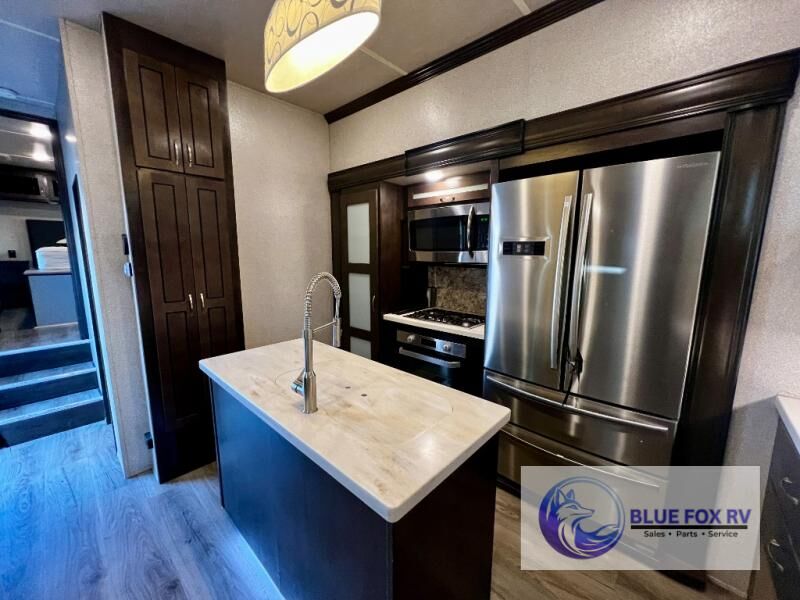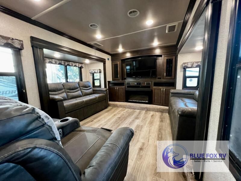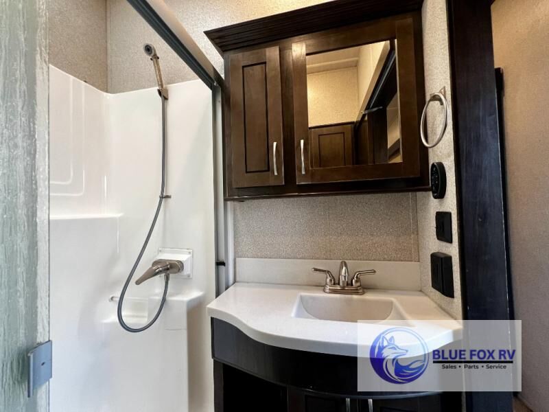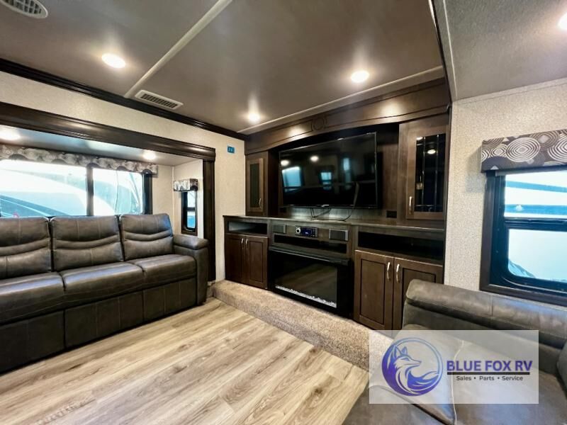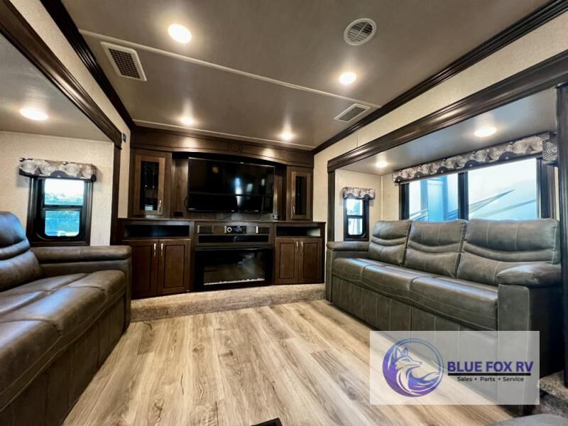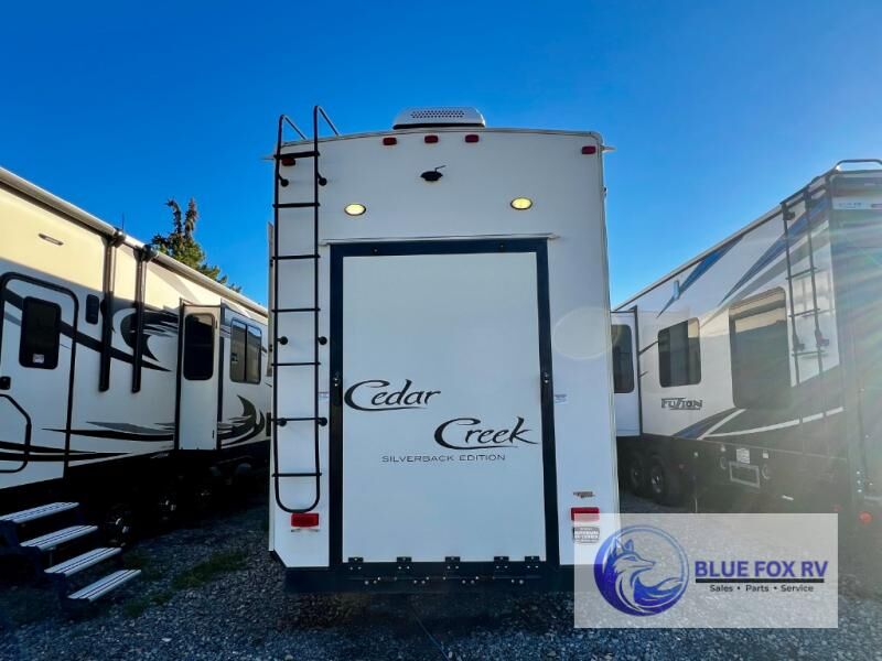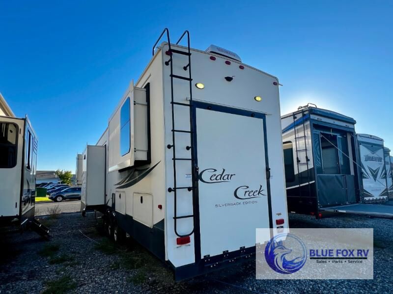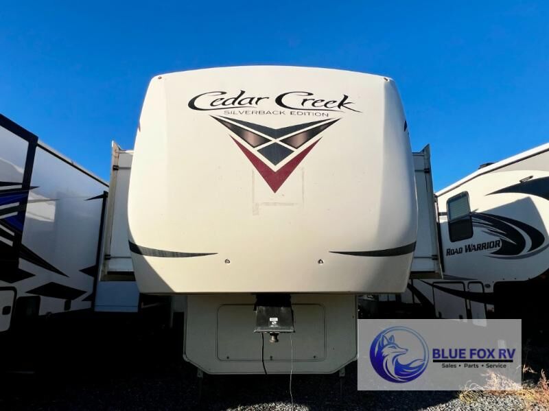 With any Forest River Cedar Creek Silverback Edition fifth wheel you will find Congoleum carefree flooring throughout and in the dining slide there is Shaw carpeting. The kitchen has everything that you would expect to find at home and more from the Furrion chef's kitchen with a gas cooktop, to the full panel backsplash, you won’t be disappointed! The 36" electric fireplace, the Jensen 12 volt CD/DVD/AM/FM/MP3/USB stereo system with a smart control app and Bluetooth, and the 50" LED TV with a swing arm in the living room are sure to be crowd pleasers! Each fifth wheel is constructed with Cedar Creek's famous all aluminum super-structure with a radius wrap metal skirt, and a Z-frame. Plus each comes with a Dexter safety and performance package which includes Dexter axles/brakes/suspension, and a Dexter E-Z flex rubber equalization system with bronze bushings and six greased zerks per side. You are sure to love camping in any one of these Forest River Cedar Creek Silverback fifth wheels so come choose your favorite one today!