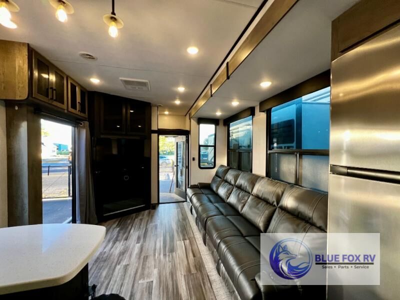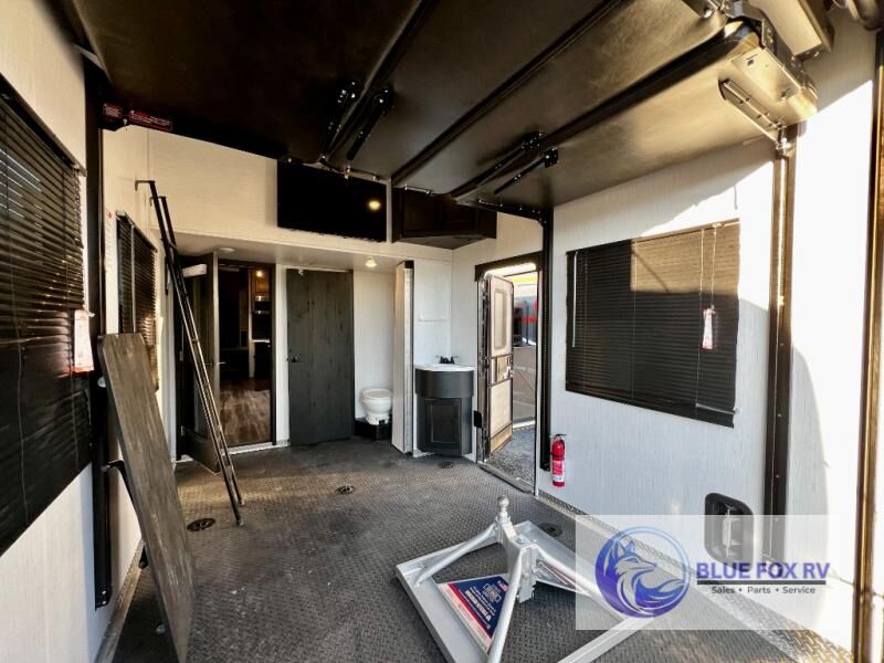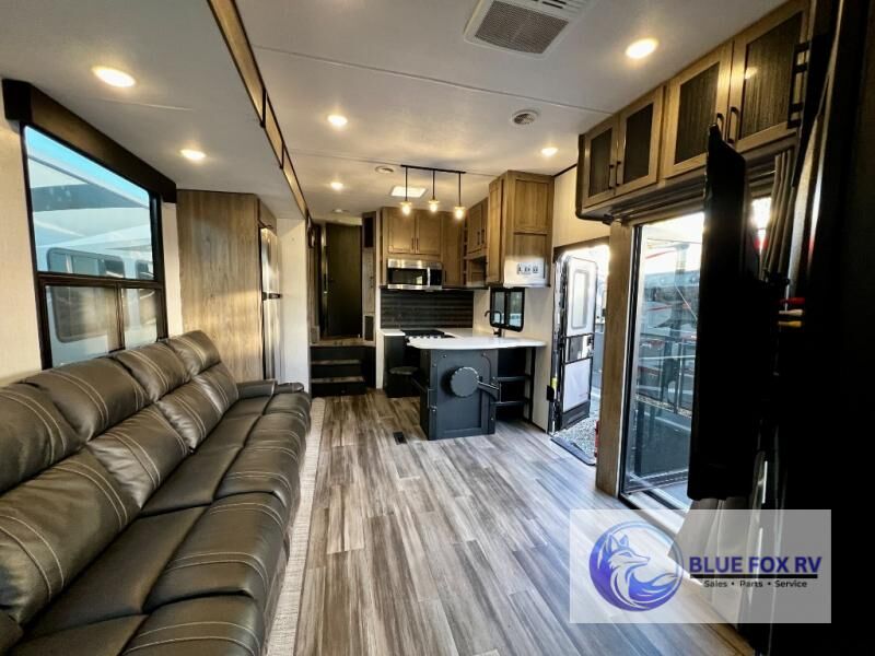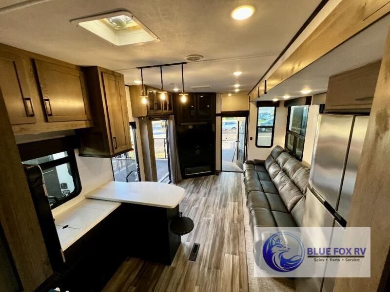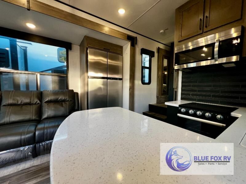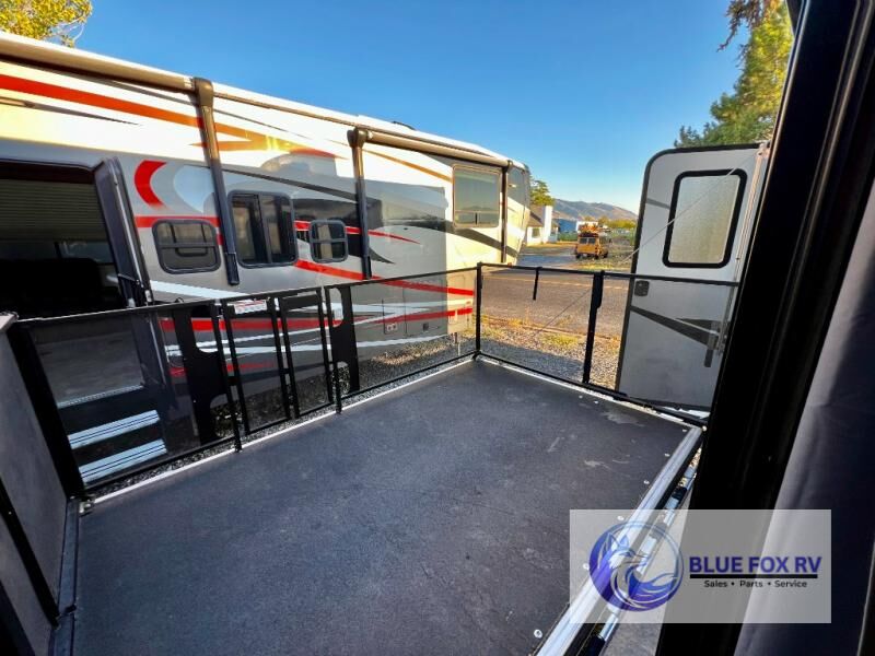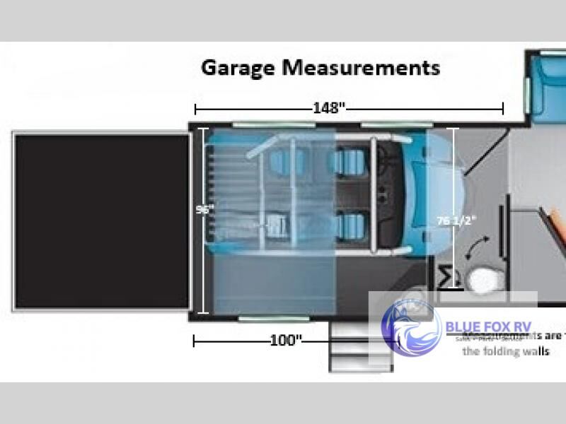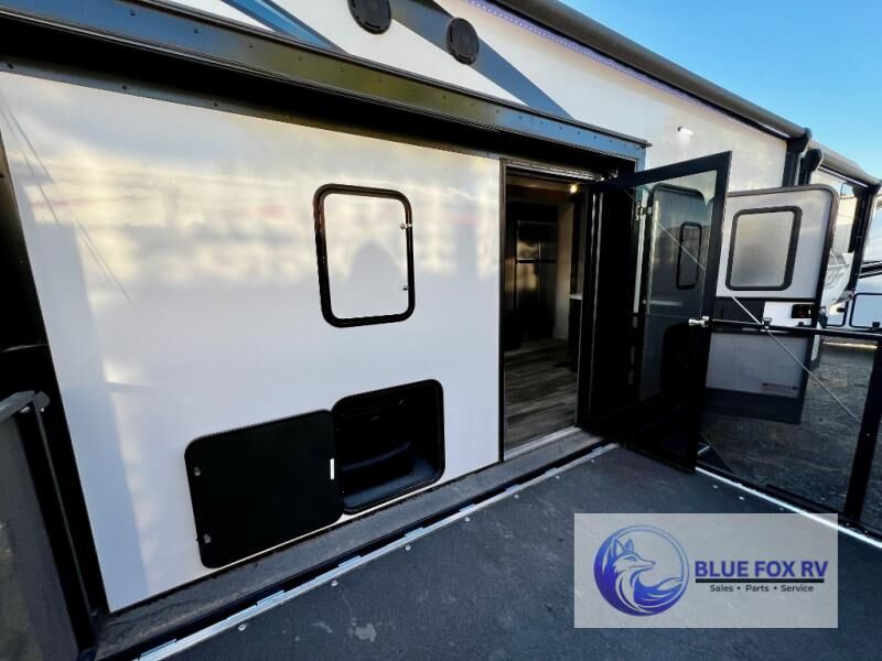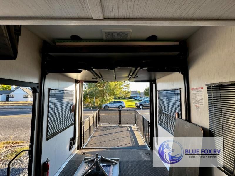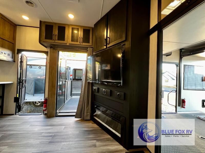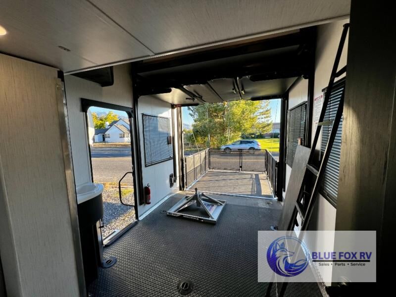 Do you desire a luxurious weekend getaway, and want to bring along your favorite off-road toy with you? Then load up your ATV into 13' of garage space (see photo for more measurements), and head out! You can enjoy the comforts inside including a bath and a half, an LED TV in the living room, full kitchen amenities, and two swivel stools at the kitchen counter. What better way to relax after a fun filled day than to sit on the sofa with a USB station in front of the fireplace while drinking your favorite beverage. The free standing dinette with chairs is the perfect spot to enjoy your meals at or play a card game. You can use the unique side patio as a storage area and/or an outdoor above-ground living area. And when you're ready to hit the sack, head into the front private bedroom for a good night's rest on the king bed! There are options and packages to enhance this already loaded fifth wheel, check them out!